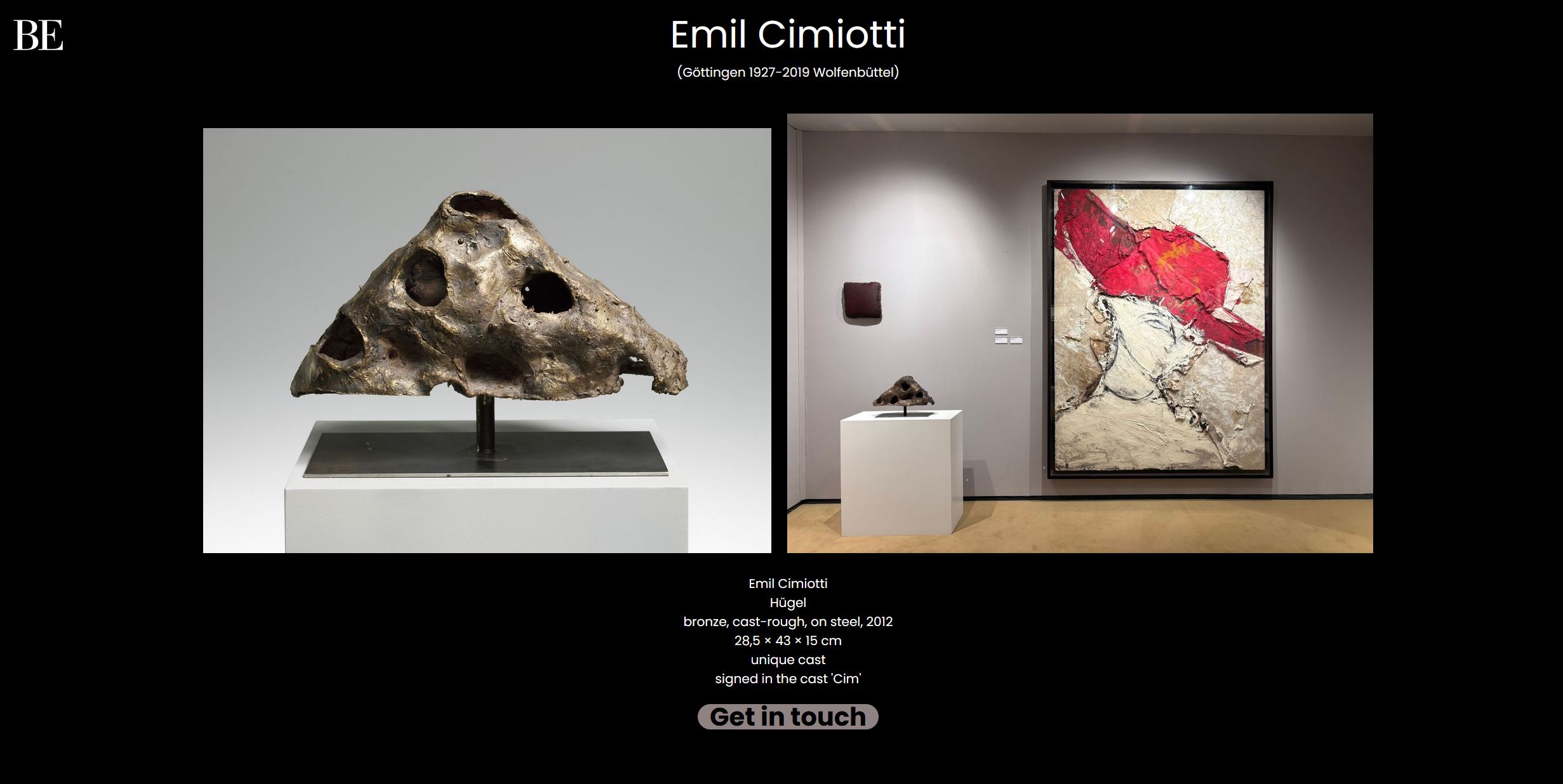 2020 * Galerie Haas, Zürich, Emil Cimiotti “Übergänge” - Skulpturen und Zeichnungen”, Zürich, 03.09.-20.10.2020. - COVER - - FLYER 1 - - FLYER 2 - - FOTO 1 - - FOTO 2 - * Villa Wessel Iserlohn, “Emil Cimiotti”, Iserlohn, 02.10.-27.12.2020. - PLAKAT - - FLYER 1 - - FLYER 2 - - LINK - - FOTO - * Galerie Koch, “65 Jahre Galerie Koch”, Hannover, 20.02.2020-30.05.2020. - FLYER - - FOTO - * Emil Cimiotti auf der “TEFAF Maastricht”, bei Galerie Haas Zürich, 05.03.-15.03.2020. - PLAKAT - - FOTO 1 - - FOTO 2 - * Kunstmuseum Bochum, “Sichtbar - Die eigene Sammlung”, Bochum, 05.04.2020-31.12.2025. - FLYER - - FOTO - * Städtische Galerie Wolfsburg, “Michael Müller - Deine Kunst - Neupräsentation der Sammlung der Galerie”, Wolfsburg, 26.05.-09.08.2020. - PLAKAT - - FLYER - * Galerie Haas Berlin/Zürich, “Abstand Episode 2 - Gegenwart”, Berlin, 07.06.-30.08.2020. - COVER - * Verein für aktuelle Kunst / Ruhrgebiet e.V., Zentrum Altenberg,” Papier Skulptura”l, Oberhausen, 30.08.-04.10.2020. - PLAKAT - - FLYER 1 - - FLYER 2 - - FOTO - * Galerie Haas Berlin/Zürich, “Abstand Episode 3 - Papier”, Berlin, 10.09.-31.10.2020. - COVER - - FOTO - * Galerie Koch, “Unter freiem Himmel”, Hannover, 12.09.2020-10.10.2020. - FLYER - * Stiftung van de Loo München, “Informelle Aufbrüche. Aus den ersten Jahren der Galerie”, München, 01.10.-23.10.2020. - FLYER - * GCB Galerie Cyprian Brenner, Schwäbisch Hall / Niederalfingen / Augsburg, “Bestandspräsentation”, ab November 2020. - COVER -