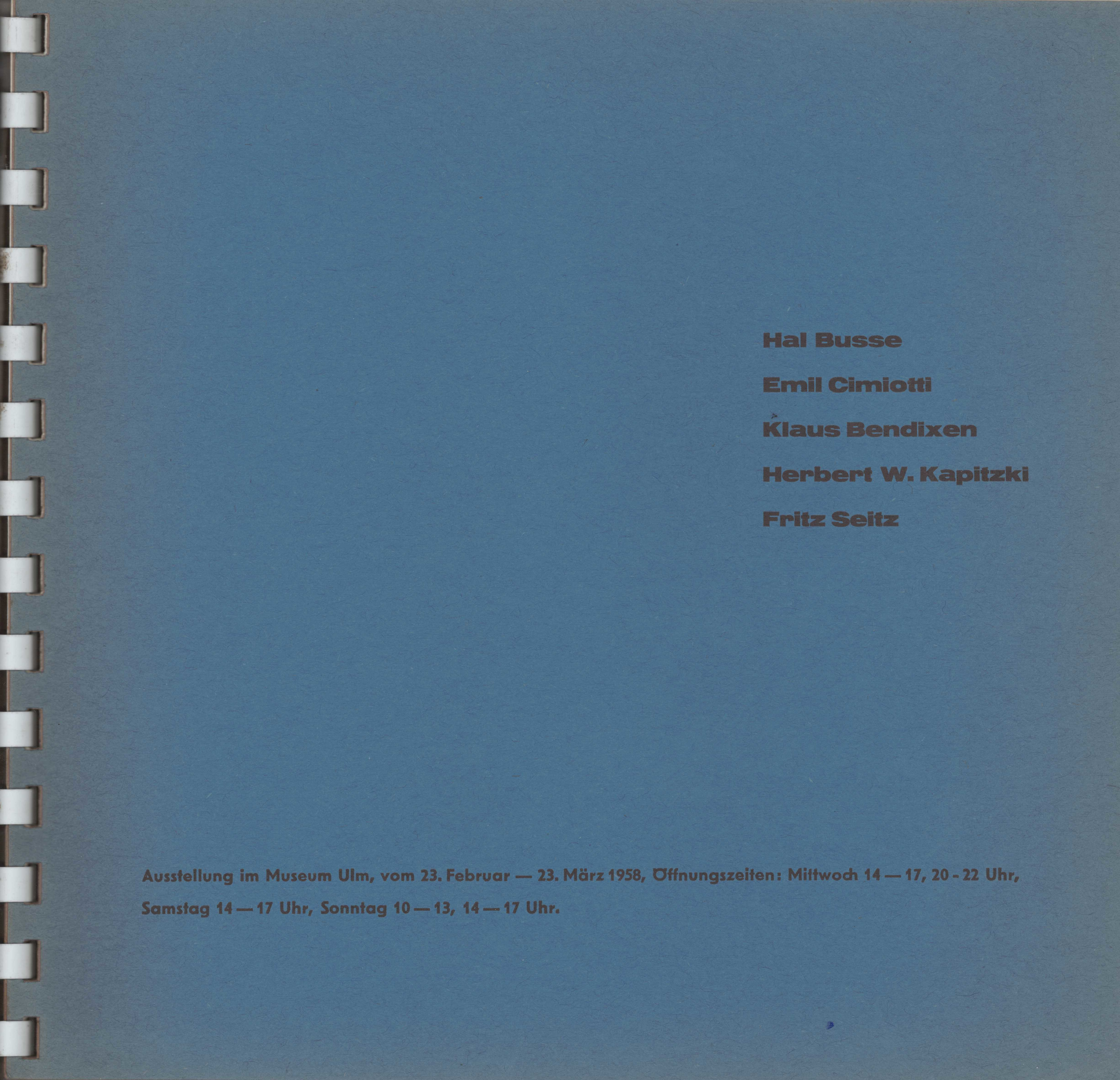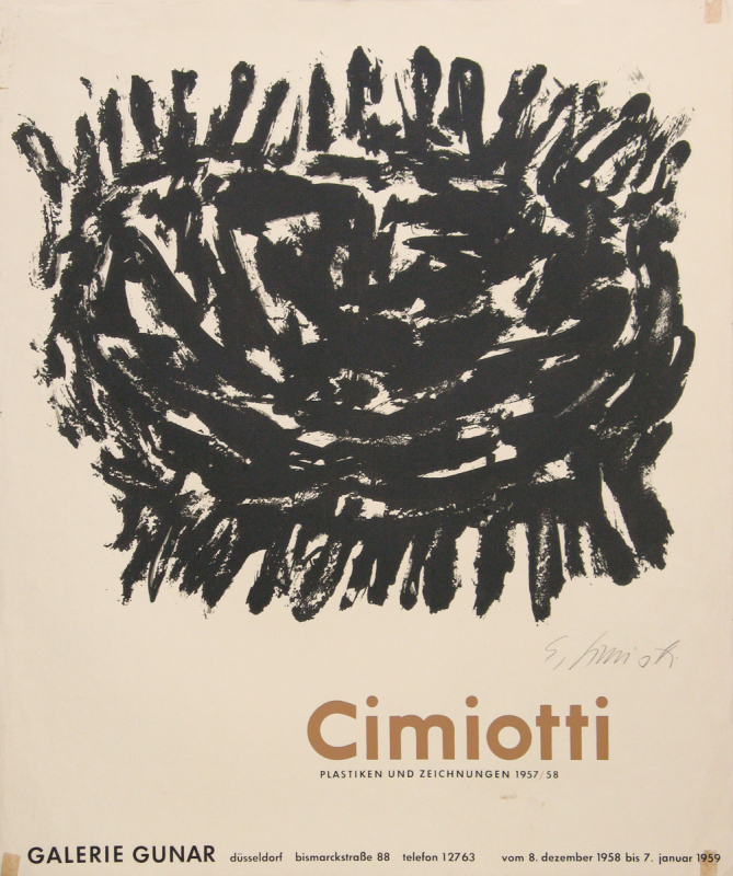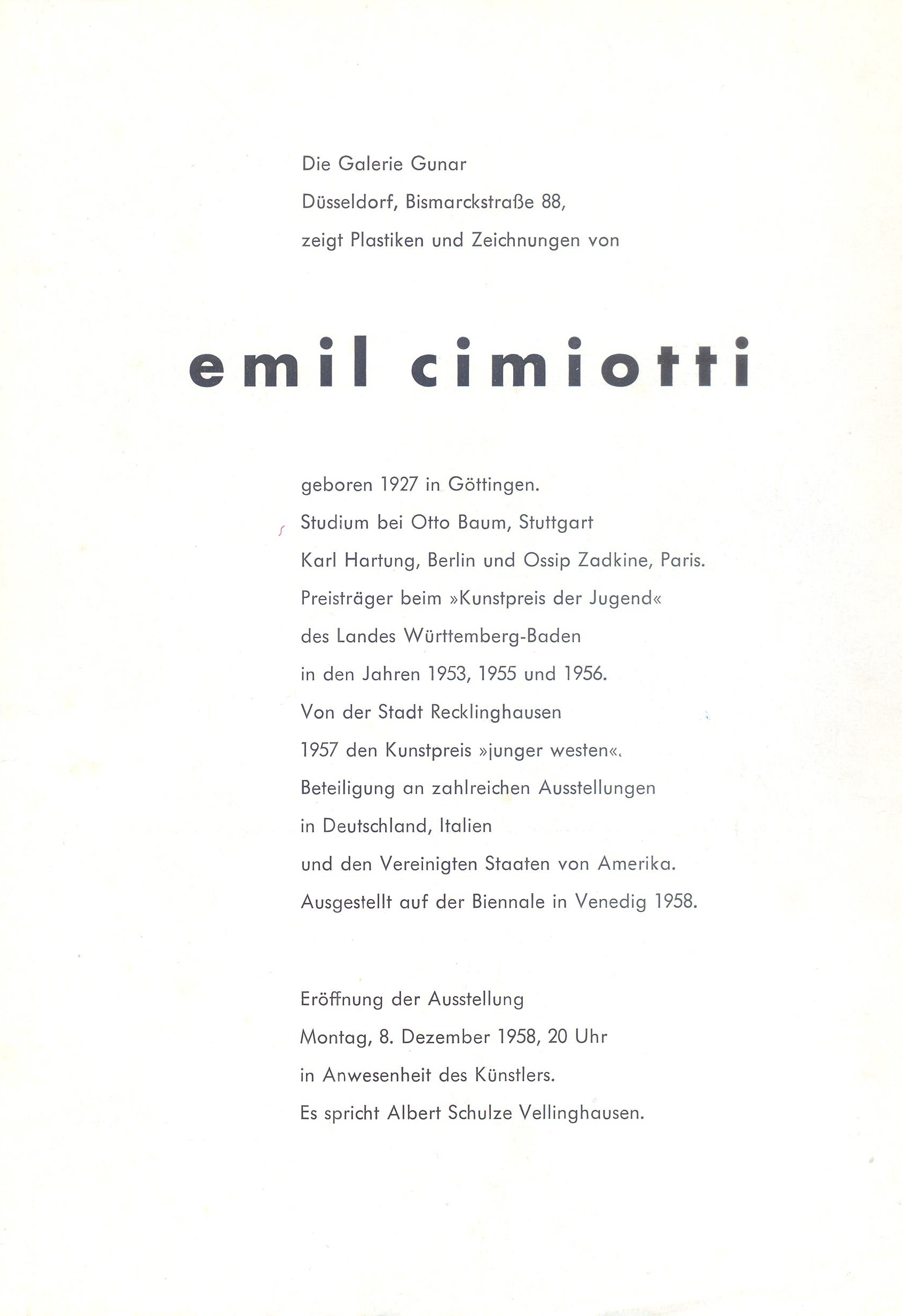 1958 * Museum Ulm, Kunstverein, “Hal Busse, Emil Cimiotti, Klaus Bendixen, Herbert W. Kapitzki, Fritz Seitz”, Ulm, 23.02.-23.03.1958. - COVER - * Galerie van de Loo, “Cimiotti - Hoehme”, München, 16.10.-30.11.1958. - k.P. - - COVER - * Galerie Gunar, “Emil Cimiotti: Plastiken und Zeichnungen”, Düsseldorf, 08.12.1958-07.01.1959. - PLAKAT - - FLYER - * Kunsthalle Düsseldorf, Gruppe 53, Düsseldorf, 17.01.-16.02.1958. - PLAKAT - - COVER - * Kunstkabinett der Duisburger Bücherstube, Kleine Formate der “Gruppe 53”, Duisburg, 25.01.-26.01.1958. * Suermondt-Museum Aachen, “Gruppe 53”, Aachen, 02.03.-30.03.1958. - PLAKAT - - COVER - * Ausstellungshallen an der GRUGA, Deutscher Künstlerbund, “8. Jahresausstellung”, Essen, 17.05.-13.07.1958. - PLAKAT - - COVER - * Italienischer Pavillon Venedig, XXIX. Biennale Internazionale d'Arte, “Junge Kunst aus 5 Nationen”, Venezia/Venedig,14.06.-19.10.1958. - PLAKAT - - COVER - * Galerie van de Loo, “Künstler der Biennale 1958 (Cavael / Cimiotti / Platschek / Schumacher / Sonderborg)”, München, 25.06.-31.08.1958. - k.P. - - COVER - * Kunsthalle Mannheim, “Deutsche Kleinplastik der Gegenwart”, Mannheim, 12.09.-02.11.1958. - COVER - * Städtische Kunsthalle Recklinghausen, “Junger Westen 58 / 10 Jahre Junger Westen”, Recklinghausen, 26.10.-30.11.1958. - COVER - * Carnegie Institute, Dept. of Fine Arts, “The 1958 Pittsburgh Bicentennial International Exhibition of Contemporary Painting and Sculpture”, Pittsburgh, 05.12.1958-08.02.1959. - COVER - * Städtisches Kunstmuseum Duisburg, “Internationale Bildhauerzeichnungen des XX. Jahrhunderts”, Duisburg. * Städtische Kunsthalle Recklinghausen, “Junger Westen - Deutsche Kunst nach Baumeister”, Recklinghausen. - COVER - * Salon du Sud-Est Lyon, “ART Allemand Contemporain”, Lyon.1958. - COVER -