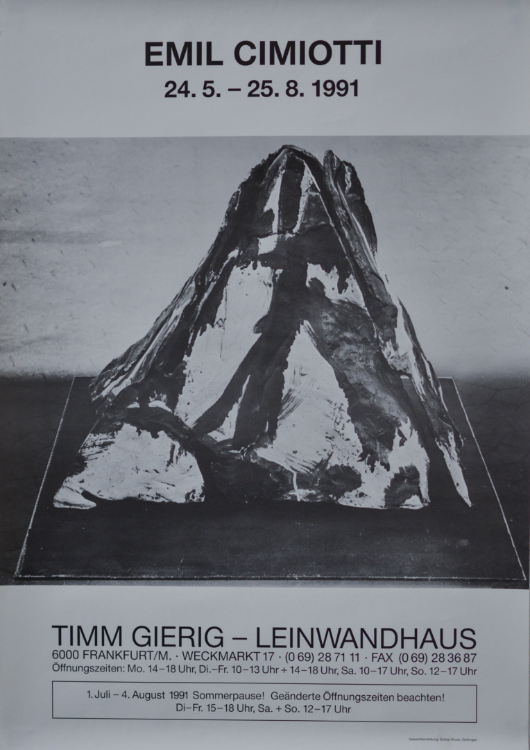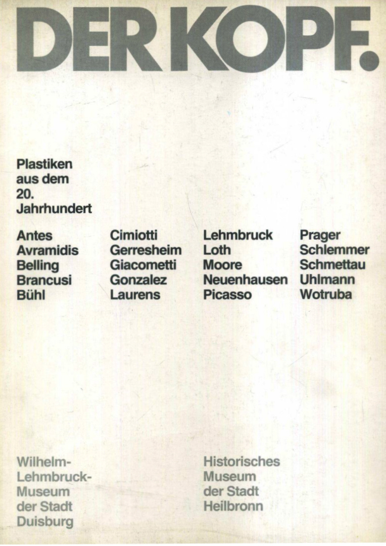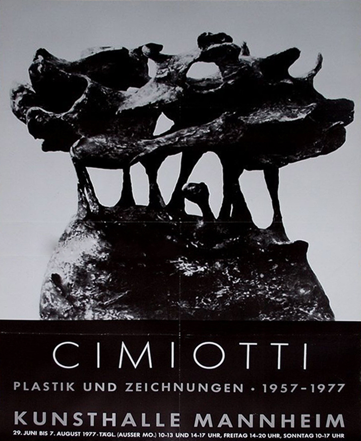 1977 * Kunsthalle Mannheim, “Emil Cimiotti: Plastik und Zeichnungen 1957-1977”, Mannheim, 29.06.-07.08.1977. - PLAKAT - - COVER - * Historisches Museum der Stadt Heilbronn, “Der Kopf, Plastiken aus dem 20. Jahrhundert”, Heilbronn, 27.12.1977-26.02.1978. - COVER - * Galerie Brusberg im Kubus, Ausstellung 175, “Kubus - Adieu”, Hannover, 05.02.-12.03.1977. - PLAKAT -