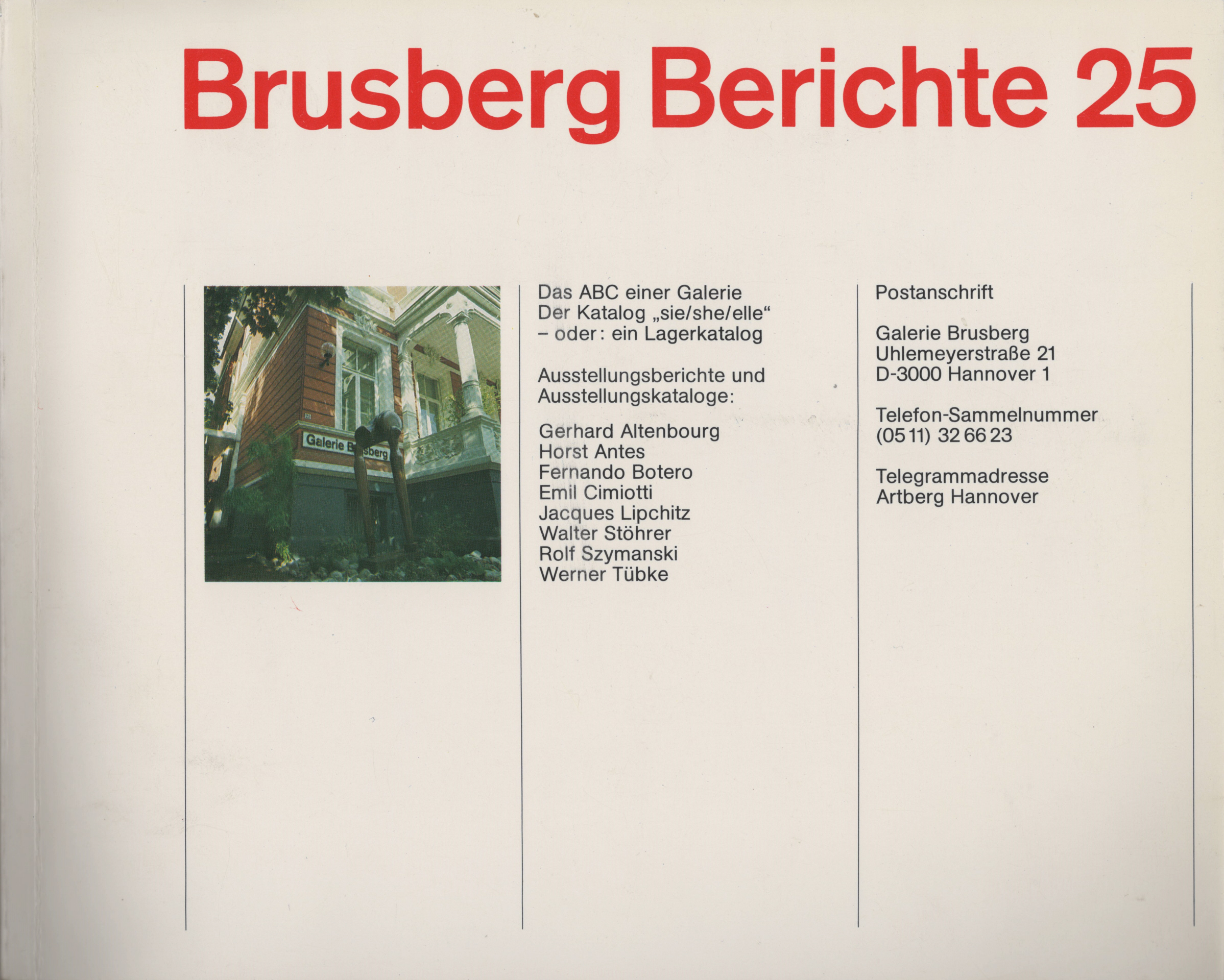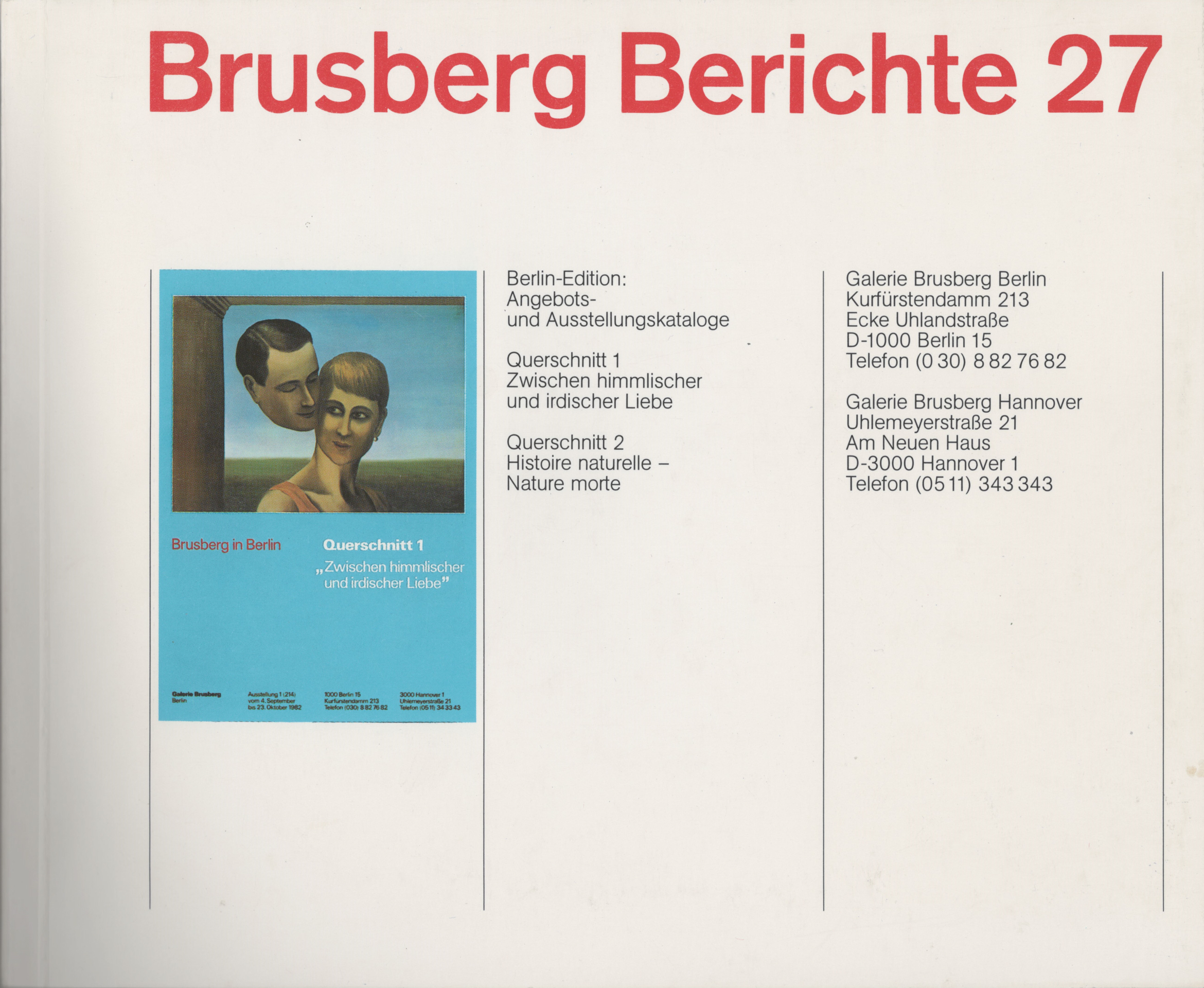 1982 * Städtische Kunsthalle Recklinghausen, “Kunst für den Bund, Erwerbungen seit 1970”, Recklinghausen, 24.01.-12.04.1982. - COVER - * Galerie Fahlbusch, “Sommerausstellung 1982”, Ludwigshafen-Oggersheim, 02.07.-22.08.1982. * Galerie Brusberg Berlin, Eröffnungsausstellung, Ausstellung 214 (1), “Querschnitt 1: Zwischen himmlischer und irdischer Liebe”, Berlin, 04.09.-23.10.1982. - COVER - * Galerie Brusberg Hannover, Ausstellung 216 (2), “Querschnitt 2: Hostoire naturelle - Nature morte”, Hannover, 30.10.-31.12.1982. - COVER - * Kunstverein Braunschweig, “Zeichnungen von Bildhauern nach 1945”, Braunschweig, 08.10.-28.11.1982. - COVER - * Künstlerbund Baden Württemberg, “Wanderausstellung Kunst der 50er Jahre in Baden-Württemberg”, mit 5 Stationen ... 1/2 - COVER - -- Prinz-Max-Palais, Karlsruhe, 31.10.-05.12.1982. * Städtisches Museum Abteiberg Mönchengladbach, “Sammlung Heinemann”, Mönchengladbach, 12.12.1982-16.01.1983. - COVER -