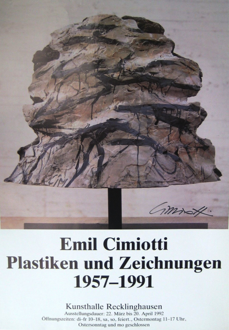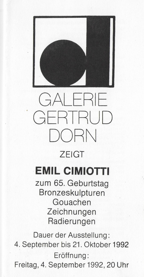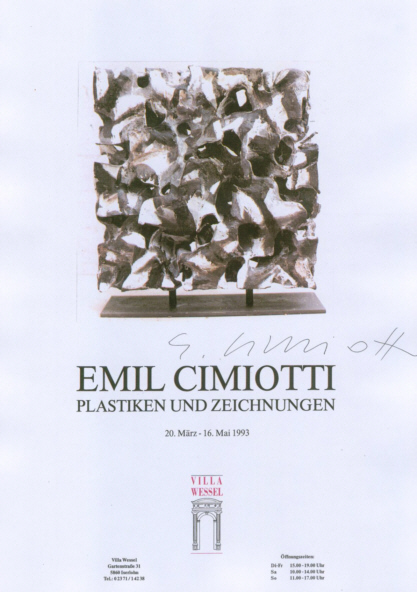 1992 * Kunsthalle Dominikanerkirche Osnabrück, “Cimiotti: Plastiken und Zeichnungen 1957-1991”, Osnabrück, 09.02.-15.03.1992. - PLAKAT - - COVER - - FLYER - * Große gildewART Galerie, “Emil Cimiotti: Aquarelle / Zeichnungen / Kleinplastiken”, Osnabrück, 09.02.-15.03.1992. - FLYER - * Galerie Timm Gierig, “Emil Cimiotti: Neue Plastiken 1990-1992”, Frankfurt, 09.02.-15.03.1992. - COVER - * Kunsthalle Recklinghausen, “Emil Cimiotti: Plastiken und Zeichnungen 1957-1991”, Recklinghausen, 22.03.-20.04.1992. - PLAKAT - - COVER - * Galerie Gertrud Dorn, “Emil Cimiotti - zum 65. Geburtstag”, Stuttgart, 04.09.-21.10.1992. - FLYER - * Galerie Marghescu, “Emil Cimiotti: Skulpturen, Gouachen, Werkskizzen”, Hannover, 22.09.-24.11.1992. - FLYER - * Galerie Ohse, “Emil Cimiotti: Plastiken und Zeichnungen”, Bremen, 11.12.1992-30.01.1993. - COVER - - k.P. - * Ulmer Museum, “Sammlung Kurt und Vera Deschler - die ersten zwanzig Jahre”, Ulm, 30.08.-11.10.1992. - COVER - * Stadtgarten Aachen, Ludwig-Forum, Deutscher Künstlerbund, “40. Jahresausstellung”, Aachen, 27.09.-15.11.1992. - PLAKAT - - COVER - * Galerie Landesgirokasse Stuttgart, “Sammlung Kurt und Vera Deschler - die ersten zwanzig Jahre”, Stuttgart, 10.11.-31.12.1992. - COVER - * Galerie Timm Gierig, ”Art Cologne”, Köln, 12.11.-18.11.1992. - PLAKAT - * Städtisches Museum Schloß Salder, Stadt Salzgitter, “Salon Salder ‘92”, Salzgitter, 25.10.1992-17.01.1993. - COVER - * Pfalzgalerie Kaiserslautern, “Kopf-Ansichten, Malerei und Plastik der 80er Jahre”, Kaiserslautern, 15.11.1992-10.01.1993. - COVER - * Kunstverein Langenhagen, “Kunstspaziergang: 6 niedersächsische Künstler aus der Sammlung des Landes Niedersachsen”, Langenhagen.
