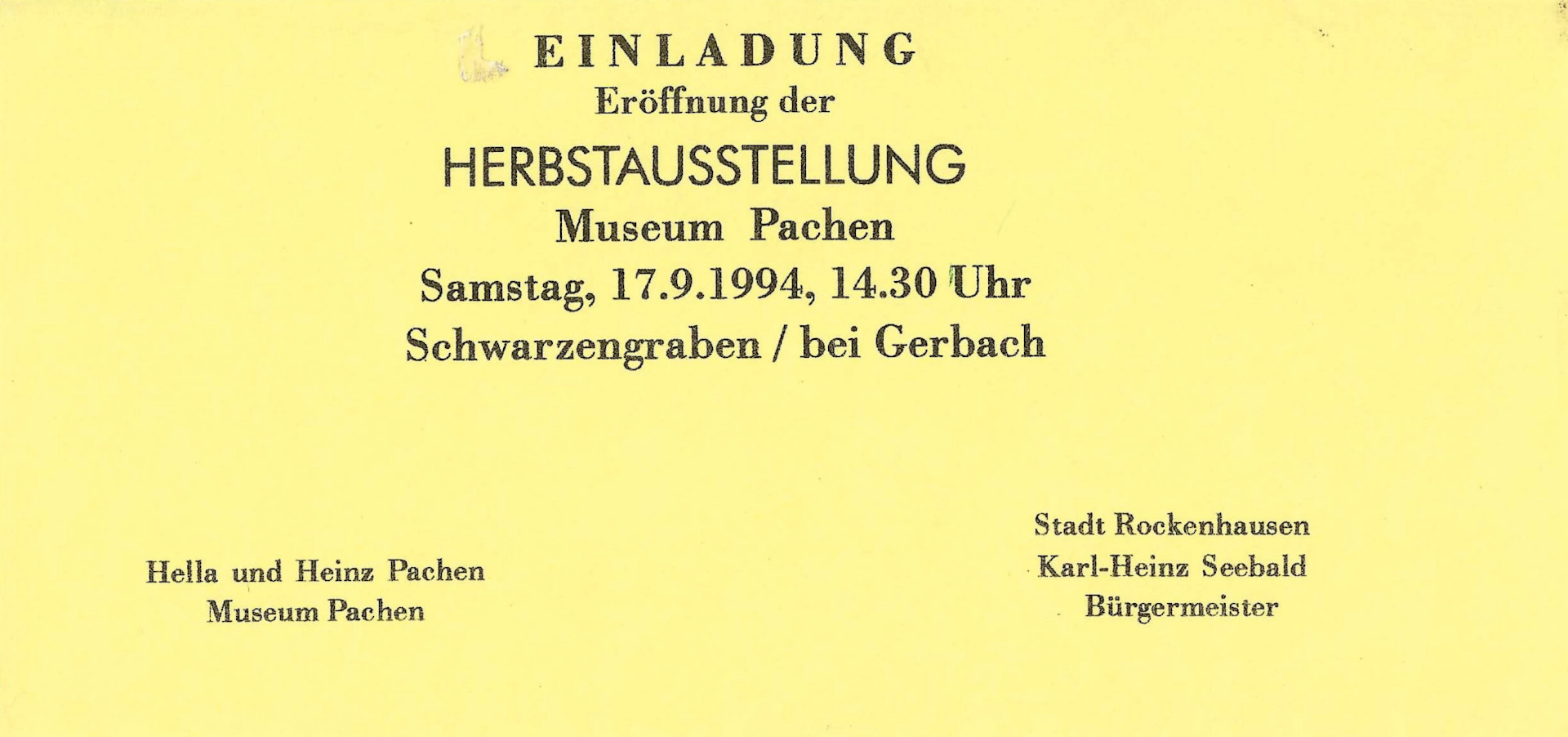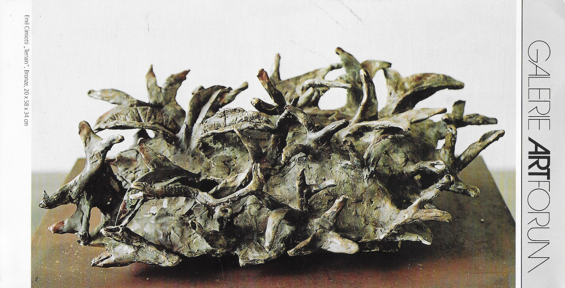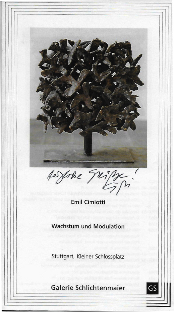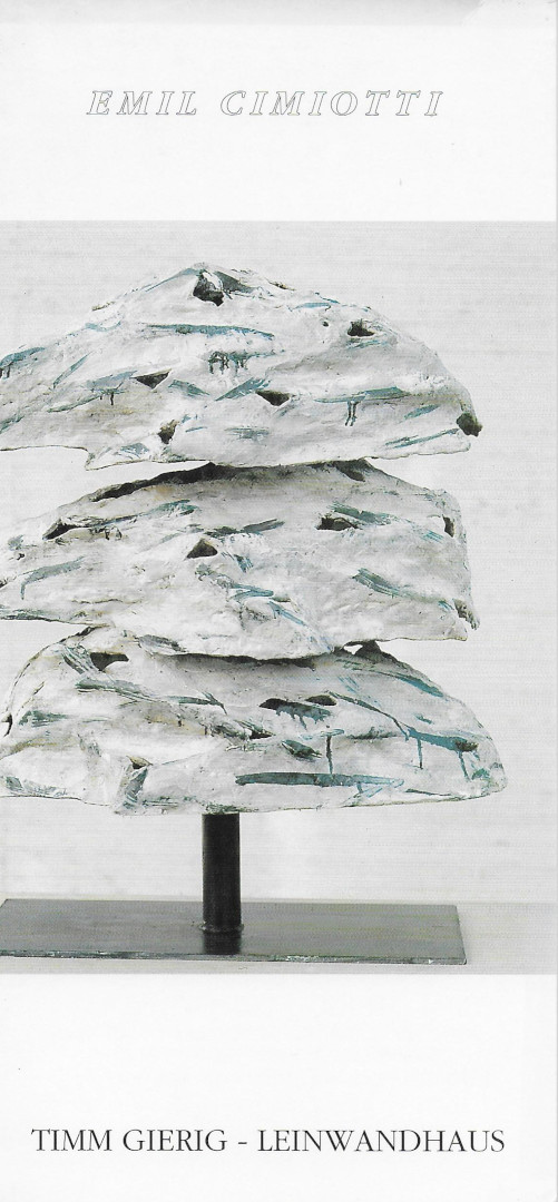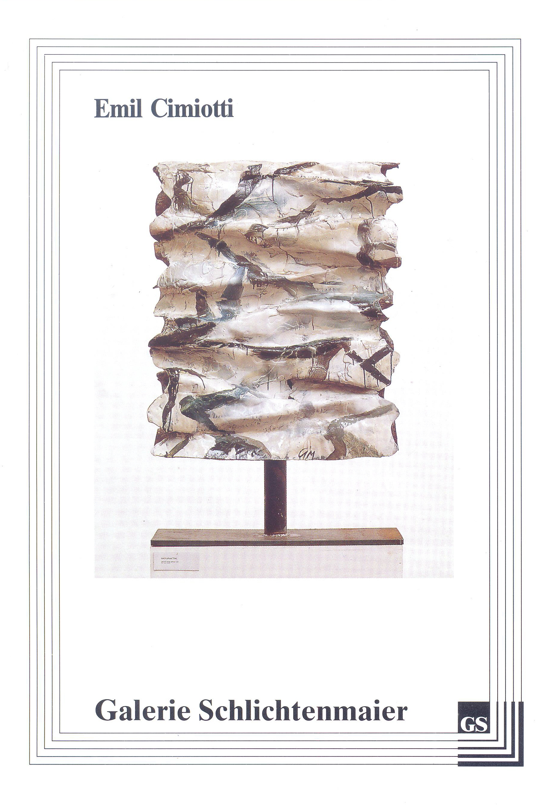 1994 * Galerie Schlichtenmaier, “Emil Cimiotti: Plastiken und Arbeiten auf Papier”, Schloss Dätzingen / Grafenau, 10.04.-04.06.1994. - k.P. - - COVER - * Die Brücke-Galerie, Stadt Braunschweig Kulturamt, “Emil Cimiotti: Poesie-Skulptur-Musik”, Braunschweig, 23.09.-25.09.1994. - FLYER - * Galerie Timm Gierig, Frankfurt, Leinwandhaus, “Emil Cimiotti II, Arbeiten aus den Jahren 1990-1994”, Frankfurt, 15.06.-31.07.1994. - COVER - - FLYER -. * Kreissparkasse Esslingen-Nürtingen, “Das Informel im deutschen Südwesten und die Gruppe 11”, Esslingen, 08.02.-25.03.1994. - COVER - * Duderstädter Rathaus, “Natur und Stadt, Bilder und Plastiken aus dem Besitz des Landes Niedersachsen”, Duderstadt, 29.04.-23.05.1994. - COVER - * Museum Pachen, Stadt Rockenhausen, “Herbstausstellung”, Rockenhausen, 17.09.1994 Vernissage. - FLYER -