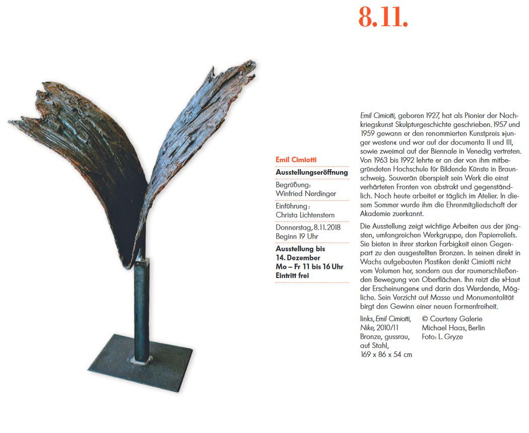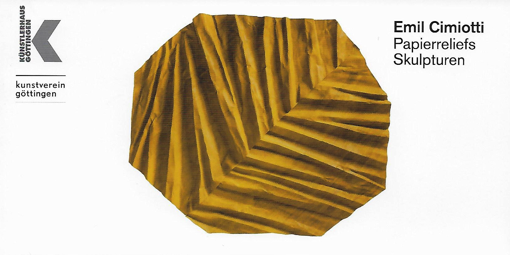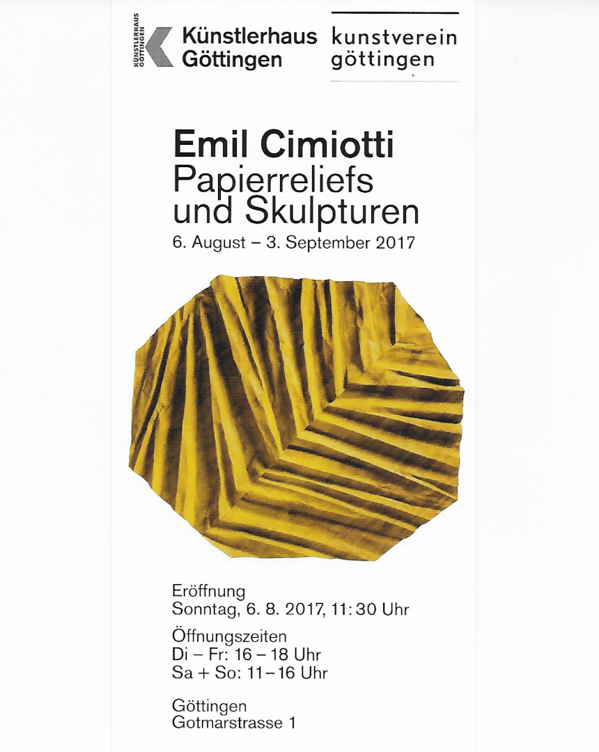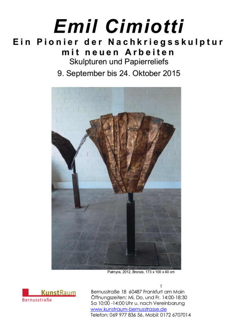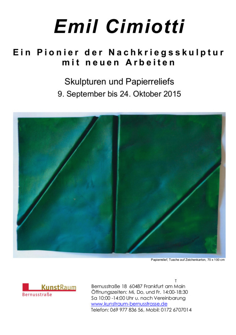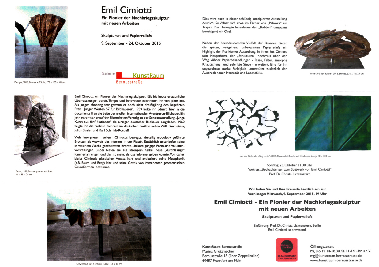 2015 * Kunstraum Bernusstraße, “Cimiotti: Skulpturen und Papierreliefs”, Frankfurt am Main, 09.09.-24.10.2015. - PLAKAT A - - PLAKAT B - - FLYER - * SüdWestGalerie Niederalfingen, “Emil Cimiotti”. * Emil Cimiotti auf der “Kunstmesse Frankfurt 15” bei Galerie Bernusstraße, 31.01.-03.02.2015. - PLAKAT - * Emil Cimiotti, “One-Artist-Show Art Karlsruhe”, Südwestgalerie Niederalfingen, 05.03.-08.03.2015. - PLAKAT - * Galerie Schlichtenmaier, “Accochage in Stuttgart”, Stuttgart, 14.03.-02.05.2015. - k.P. - - COVER - * Städtisches Museum Braunschweig, “Made in Braunschweig”, Braunschweig, 25. 03.-21.06.2015. - COVER - * Emil Cimiotti auf der “ART Cologne 2015” bei Galerie Schlichtenmaier, 16.04.-19.04.2015. - PLAKAT - * Kunsthalle in Emden, “Zeitreise. Die Sammlung von 1904 bis 2014”, Emden, 18.07.-20.09.2015. - FLYER - * Galerie Timm Gierig, “Gierig Kunstprojekte - 50 Jahre, Ausstellungsort: Galerie Schwind”, Frankfurt, 08.08.-22.08.2015. - COVER - * Galerie Schlichtenmaier, “Kleinplastik der Gegenwart”, Stuttgart, 17.09.-17.10.2015. - k.P. - * Kunsthalle Mannheim, “Graphisches Kabinett, Spur und Geste. Graphik des Informel”, Mannheim, 27.11.2015-24.01.2016 * Emil Cimiotti auf der “Cologne Fine ART 2015” bei Galerie Hennemann und Galerie Schlichtenmaier, 18.11.-22.11.2015. - PLAKAT - * Dommuseum Hildesheim, “Mehr als ein Schatz”, Wiedereröffnung der Dauerausstellung nach umfangreicher Renovierung, 2015. - FLYER -