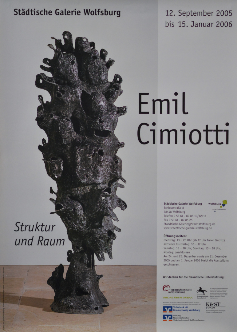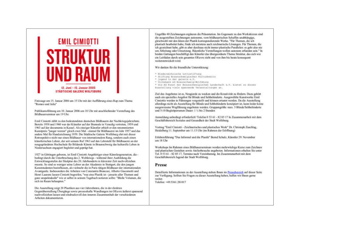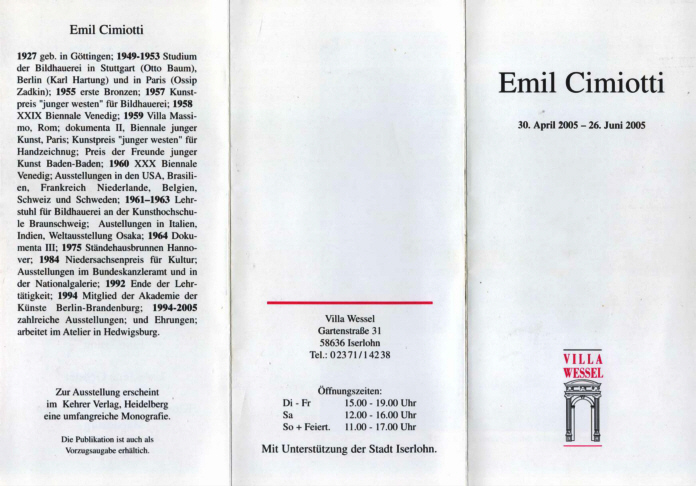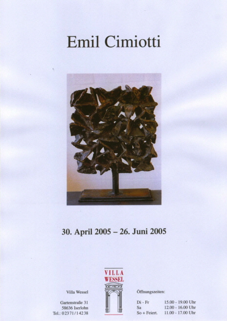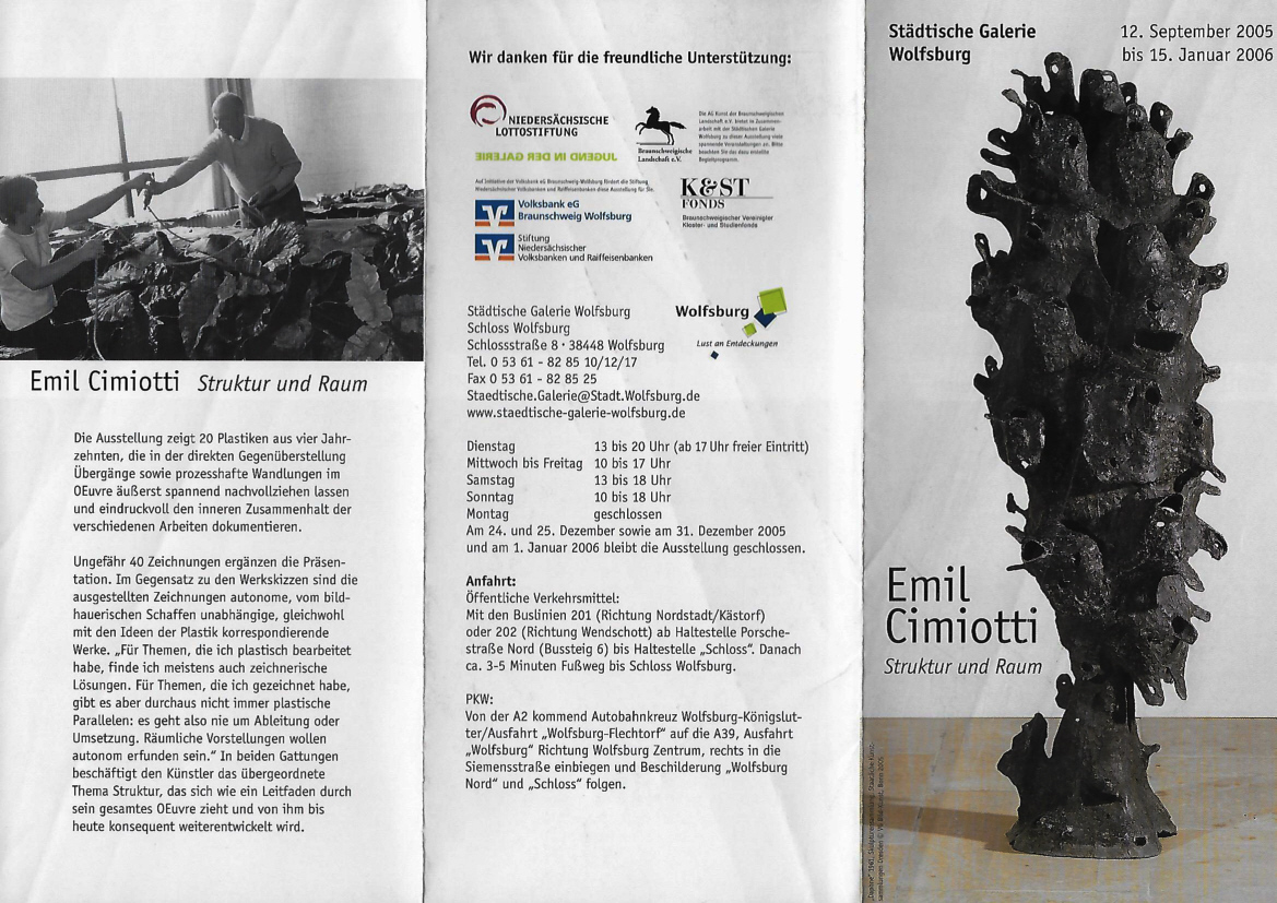 2005 * Villa Wessel, “Cimiotti: Präsentation der Monographie”, Iserlohn, 29.04.-26.06.2005. - PLAKAT - - COVER - - FLYER - - LINK - - FOTO - * Skulpturenmuseum Glaskasten Marl, “Emil Cimiotti - Retrospektive. 1957-2004”, Marl, 08.05.-19.06.2005. - PLAKAT - - COVER - - FLYER - * Städtische Galerie Wolfsburg, “Cimiotti: Struktur und Raum”, Wolfsburg, 12.09.2005-15.01.2006. - PLAKAT 1 - - PLAKAT 2 - - FLYER 1 - - FLYER 2 - * Vorderes Schloß, Mühlheim a.d. Donau, “Dreidimensional”, Plastik und Skulptur aus den Landkreisen in Baden-Württemberg 1960-2004, 21.01.-20.02.2005. - COVER - - FLYER - * Dominikanerkloster Braunschweig, “Kunst im Kloster - Dominikanerkloster 1985-2005”, Braunschweig, 18.09.-16.10.2002. - FLYER -