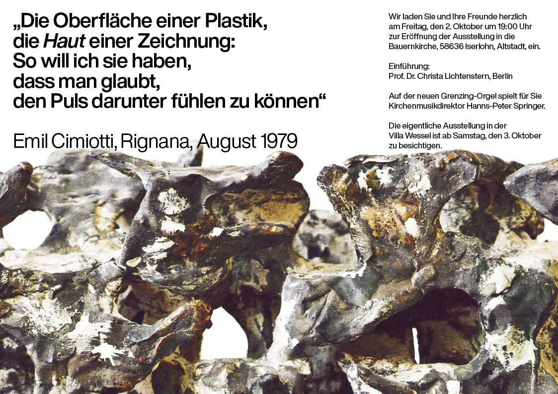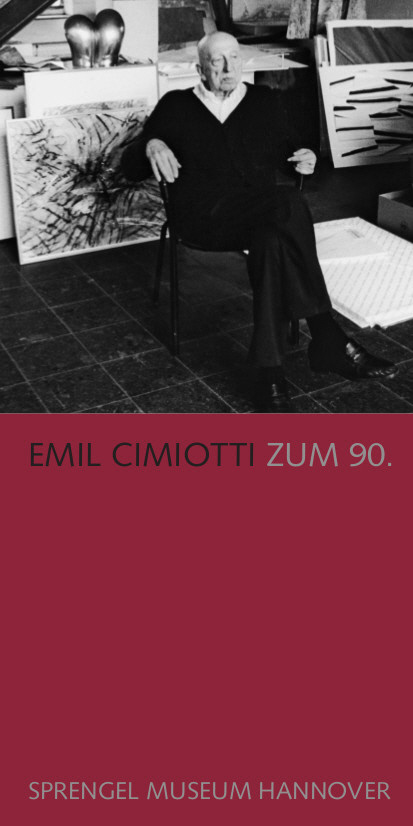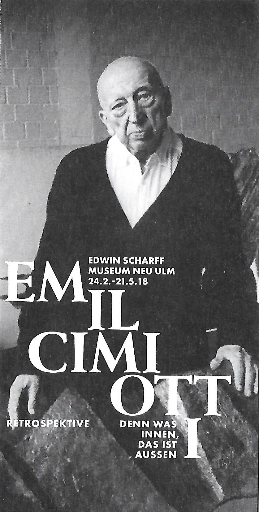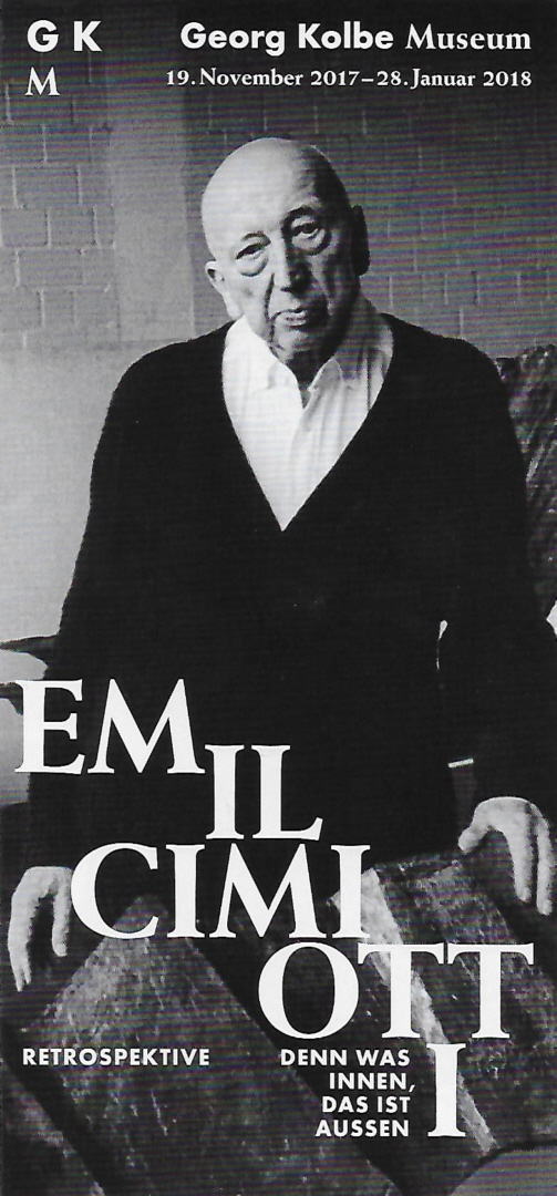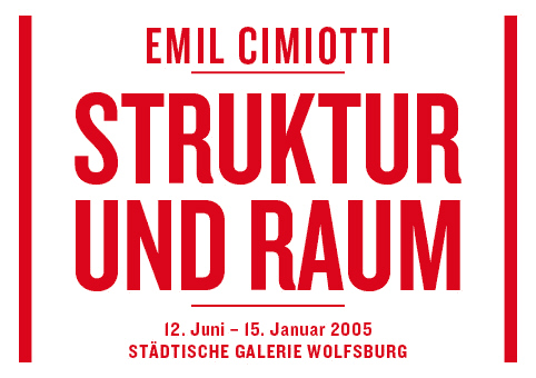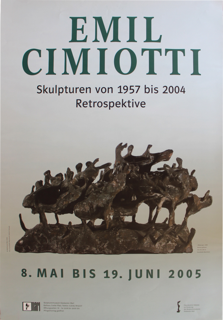 2005 * Villa Wessel, “Cimiotti: Präsentation der Monographie”, Iserlohn, 29.04.-26.06.2005. - PLAKAT - - COVER - - FLYER - - LINK - - FOTO - * Skulpturenmuseum Glaskasten Marl, “Emil Cimiotti - Retrospektive. 1957-2004”, Marl, 08.05.-19.06.2005. - PLAKAT - - COVER - - FLYER - * Städtische Galerie Wolfsburg, “Cimiotti: Struktur und Raum”, Wolfsburg, 12.09.2005-15.01.2006. - PLAKAT 1 - - PLAKAT 2 - - FLYER 1 - - FLYER 2 - * Vorderes Schloß, Mühlheim a.d. Donau, “Dreidimensional”, Plastik und Skulptur aus den Landkreisen in Baden-Württemberg 1960-2004, 21.01.-20.02.2005. - COVER - - FLYER - * Dominikanerkloster Braunschweig, “Kunst im Kloster - Dominikanerkloster 1985-2005”, Braunschweig, 18.09.-16.10.2002. - FLYER -