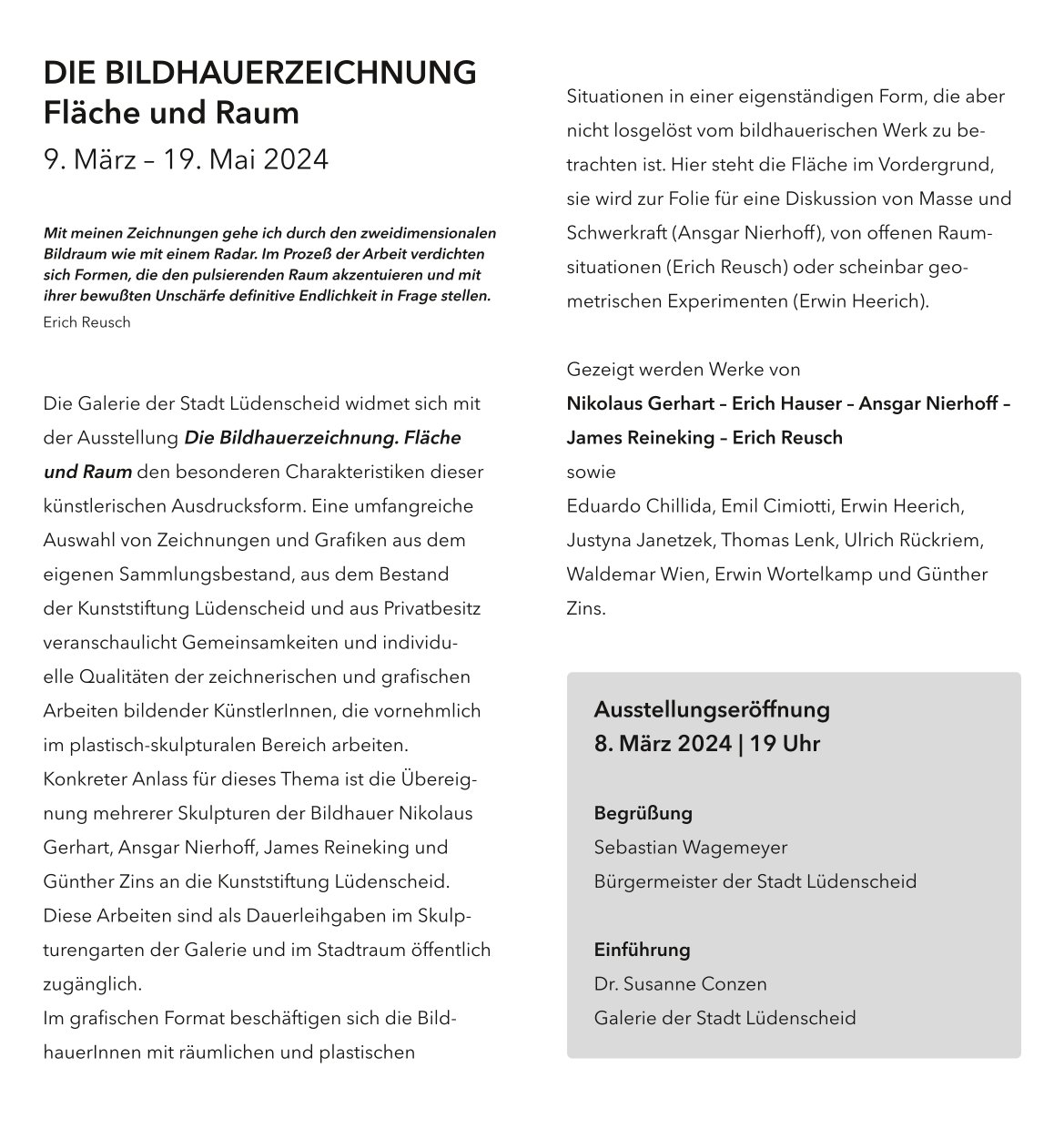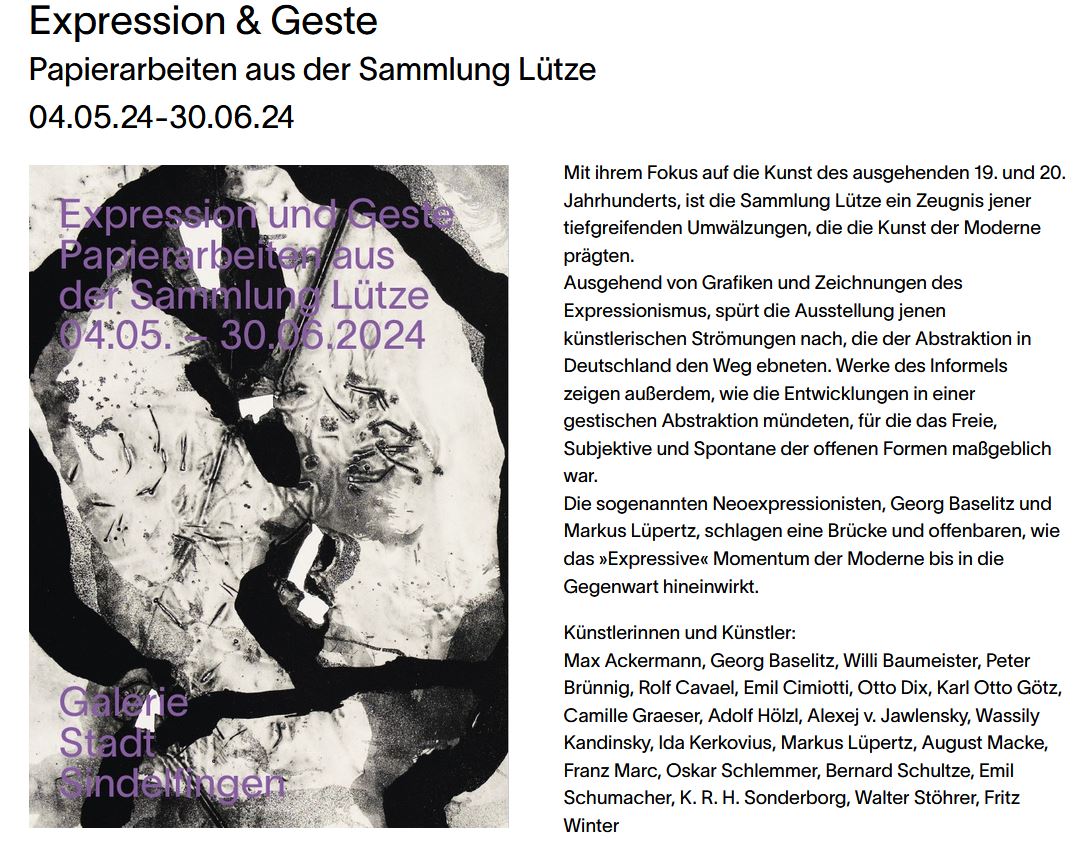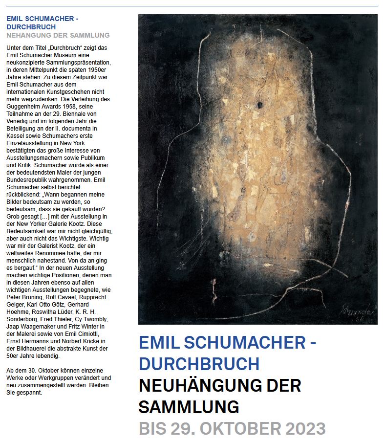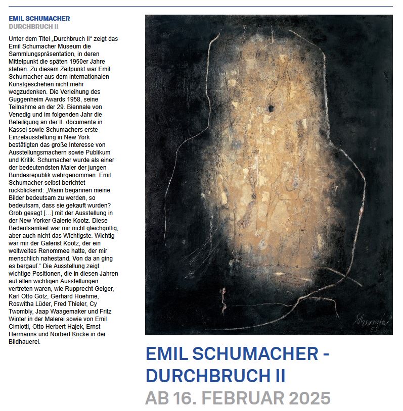 2024 * Emil Schumacher Museum Hagen, “Durchbruch”, Neupräsentation der Sammlung, Durchbruch in der internationalen Wahrnehmung, mit Zeitgenossen, Hagen, 20.08.2023-30.04.2024. - FLYER - - FOTO - * Museen der Stadt Lüdenscheid / Städtische Galerie Lüdenscheid, “Die Bildhauerzeichnung. Fläche und Raum”, Lüdenscheid, 09.03.2024-19.05.2024. - FLYER 1 - - FLYER 2 - * Emil Cimiotti auf der “ART Düsseldorf” bei Galerie Haas Zürich, 11.04.-14.04.2024. - PLAKAT - - FOTO - * Galerie Stadt Sindelfingen, “Expression und Geste - Papierarbeiten aus der Sammlung Lütze”, Sindelfingen, 04.05.-30.06.2024. - PLAKAT - - FLYER - * Emil Cimiotti auf der “ART Basel” bei Galerie Haas Zürich, 11.06.-16.06.2024. - PLAKAT - - FOTO 01 - - FOTO 02 - * Kunsthaus Dahlem, Berlin, “Zeichen der Zeit - 75 Jahre Deutscher Künstlerbund, Bildhauerei 1950-1960”, Berlin, 24.10.2024-02.03.2025. - PLAKAT - - COVER - - FLYER - * Kunsthalle Recklinghausen, “75 Jahre Kunsthalle Recklinghausen. Die Anfänge: Radical Innovations”, Recklinghausen, 15.12.2024-06.04.2025. - PLAKAT - - FLYER - - FOTO -