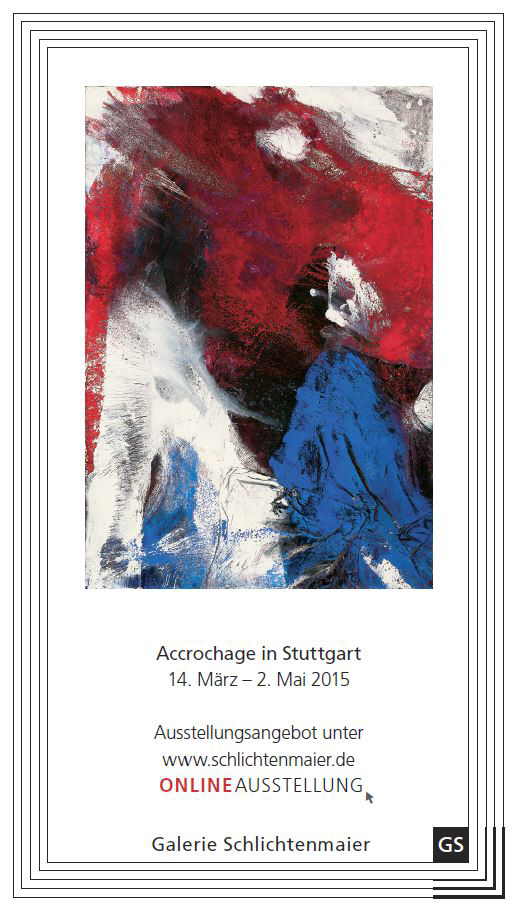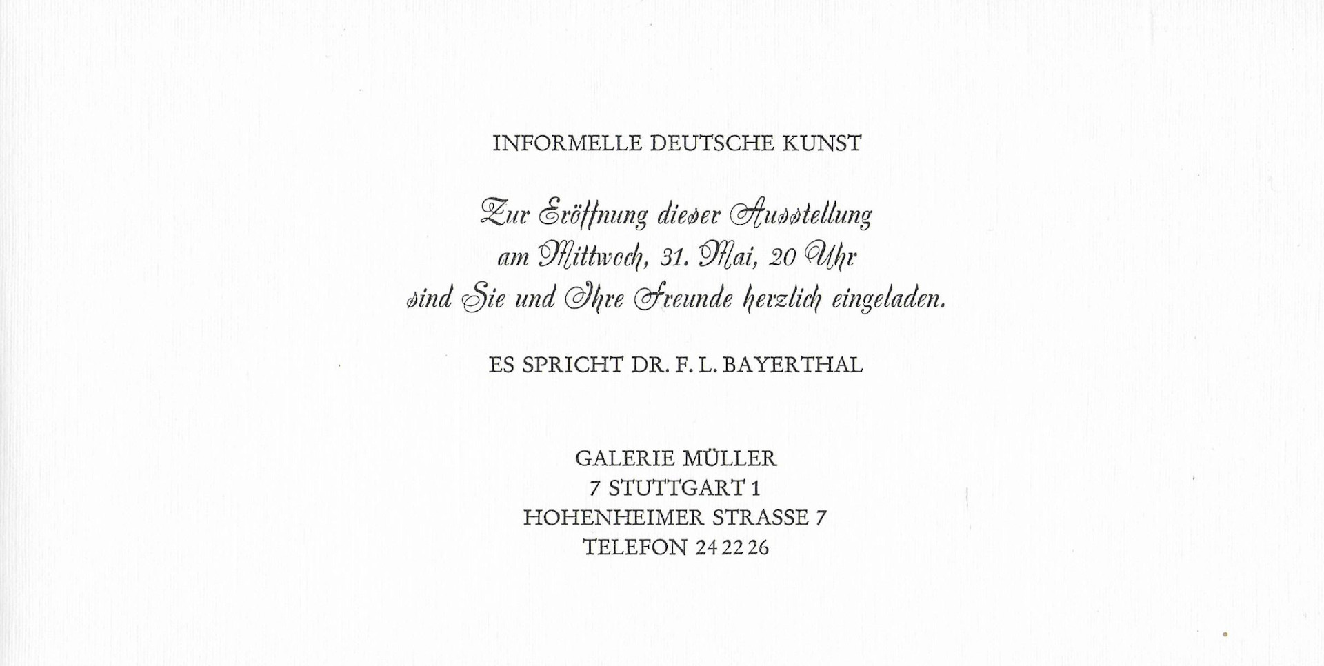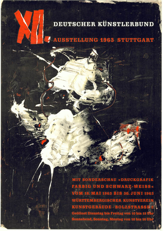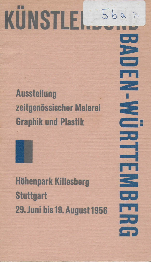 1956 * Württembergischer Kunstverein Stuttgart, Kunstgebäude am Schloßplatz, “Maler und Bildhauer”, Stuttgart, 29.03.-29.04.1956. - COVER - * Künstlerbund Baden-Württemberg, Höhenpark Killesberg, “Zeitgenössische Malerei/Graphik/Plastik”, Stuttgart, 29.06.-19.08.1956. - COVER -