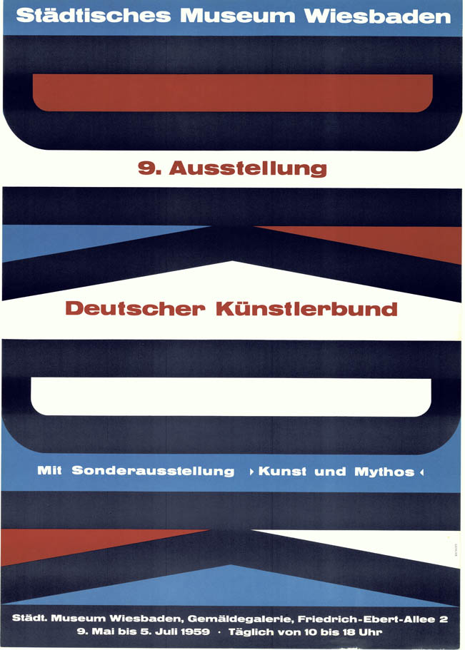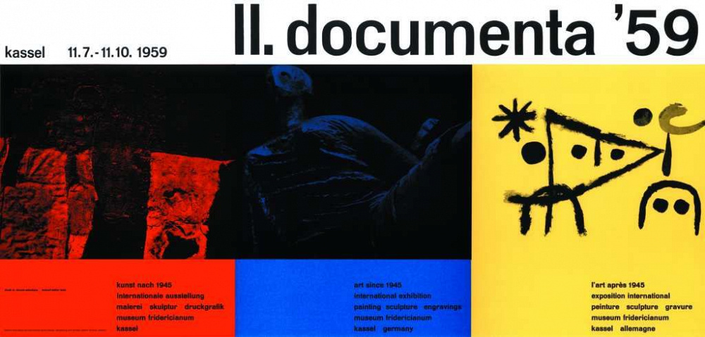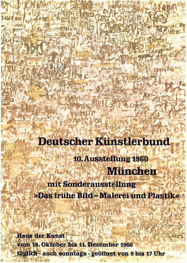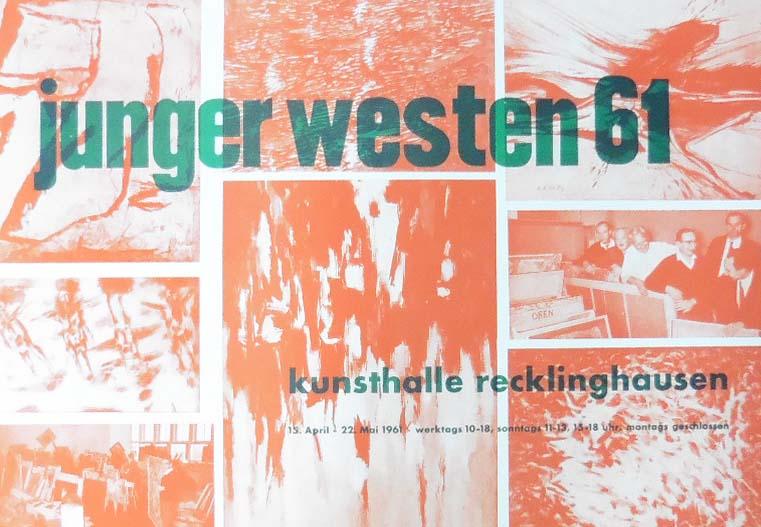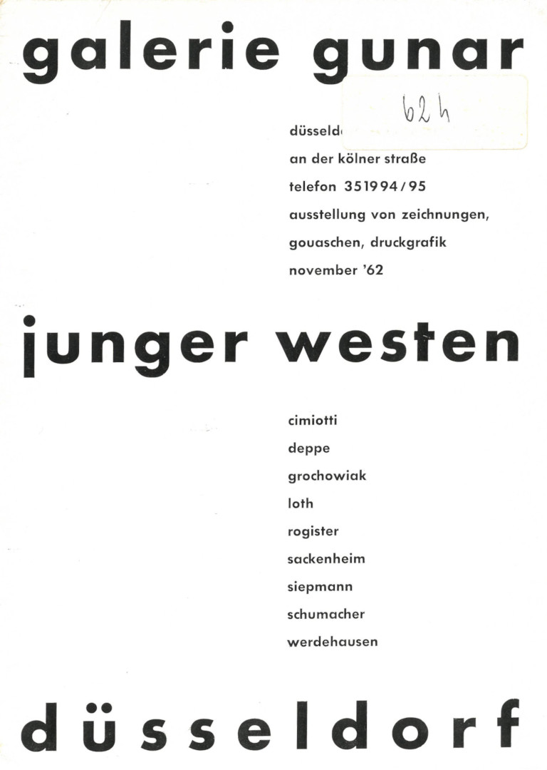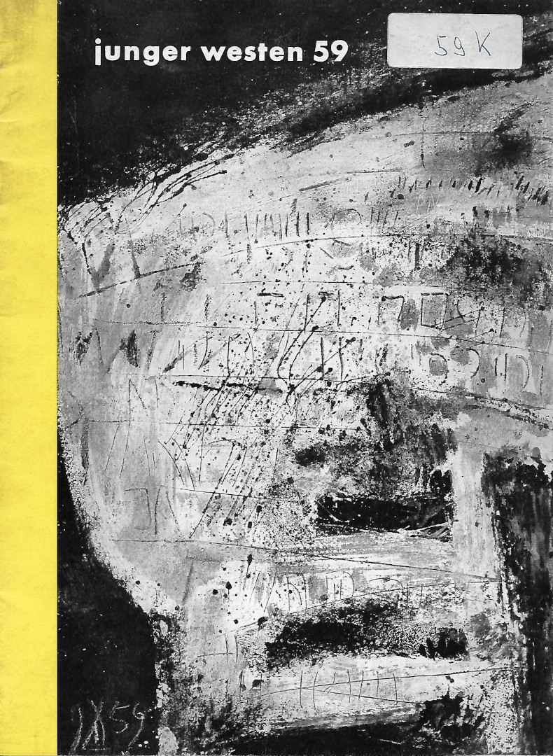 1959 * Kunstverein Darmstadt, Kunsthalle am Steubenplatz. “Junger Westen”, Darmstadt, 10.01.-08.02.1959. - COVER - * Kunstverein Hannover, “120. Frühjahrsausstellung, Die neue Generation”, Hannover, 22.03.-26.04.1959. - COVER - * Stedelijk Museum Amsterdam, “Jonge duitse Kunst”, Amsterdam, 25.03.-04.05.1959. - PLAKAT - - COVER -. * Städtisches Museum Wiesbaden, Deutscher Künstlerbund, “9. Jahresausstellung”, Wiesbaden, 09.05.-05.07.1959. - PLAKAT - - COVER - (Plakat und Cover gem. DKB identisch) * Haus am Waldsee,” Ausstellung des Jungen Westen”, Berlin, 30.05.-28.06.1959. - COVER - * Kunsthalle Basel, “Deutsche Künstler der Gegenwart (Junger Westen)”, Basel, 11.06.-12.07.1959. - COVER - * Museum der Stadt Regensburg, “ars viva regensburg ‘59”, Regensburg, 06.07.-30.08.1959. - PLAKAT - - COVER - * Stadt Kassel (diverse Orte), documenta II, “Kunst nach 1945, Malerei-Skulptur-Druckgrafik”, Kassel, 11.07.-11.10.1959. - PLAKAT - - FLYER - - COVER 1 - - COVER II - * Staatliche Kunsthalle Baden-Baden, “Kunstpreis der Jugend 1959”, 12.09.-18.10.1959. - COVER - * Städtische Kunsthalle Recklinghausen, “Junger Westen”, Recklinghausen, 19.09.-25.10.1959. - COVER - * The Minneapolis Institute of Arts, “European Art Today - 35 Painters and Sculptors”, Minneapolis, 22.09.-25.10.1959. - PLAKAT - - COVER - * dergl. als Wanderausstellung in Nordamerika und Kanada (1959/1960), “European Art Today”, Nordamerika / Kanada (6 Stationen): -- Los Angeles Country Museum of Art, 11.11.-20.12.1959. -- San Francisco Museum of Art, 06.01.-09.02.1960. -- The North Carolina Museum of Art, Raleigh, 26.02.-03.04.1960. -- The National Gallery of Canada Ottawa, 20.04.-24.05.1960. -- French & Company, Inc., New York, 07.06.-13.08.1960. -- The Baltimore Museum of Art, 18.09.-16.10.1960. * Musée d'Arte Moderne, Paris, “I. Biennale des Jeunes Artistes”, Premiere, Paris, 02.10.-25.10.1959. * Deutsche Akademie Villa Massimo Rom, “XIII. Jahresausstellung der Deutschen Akademie Villa Massimo”, Rom, 07.11.-20.11.1959. - COVER - * Kunstgemeinde Lüdenscheid, “Künstlervereinigung Junger Westen”. Lüdenscheid, 06.12.-15.12.1959. - COVER -