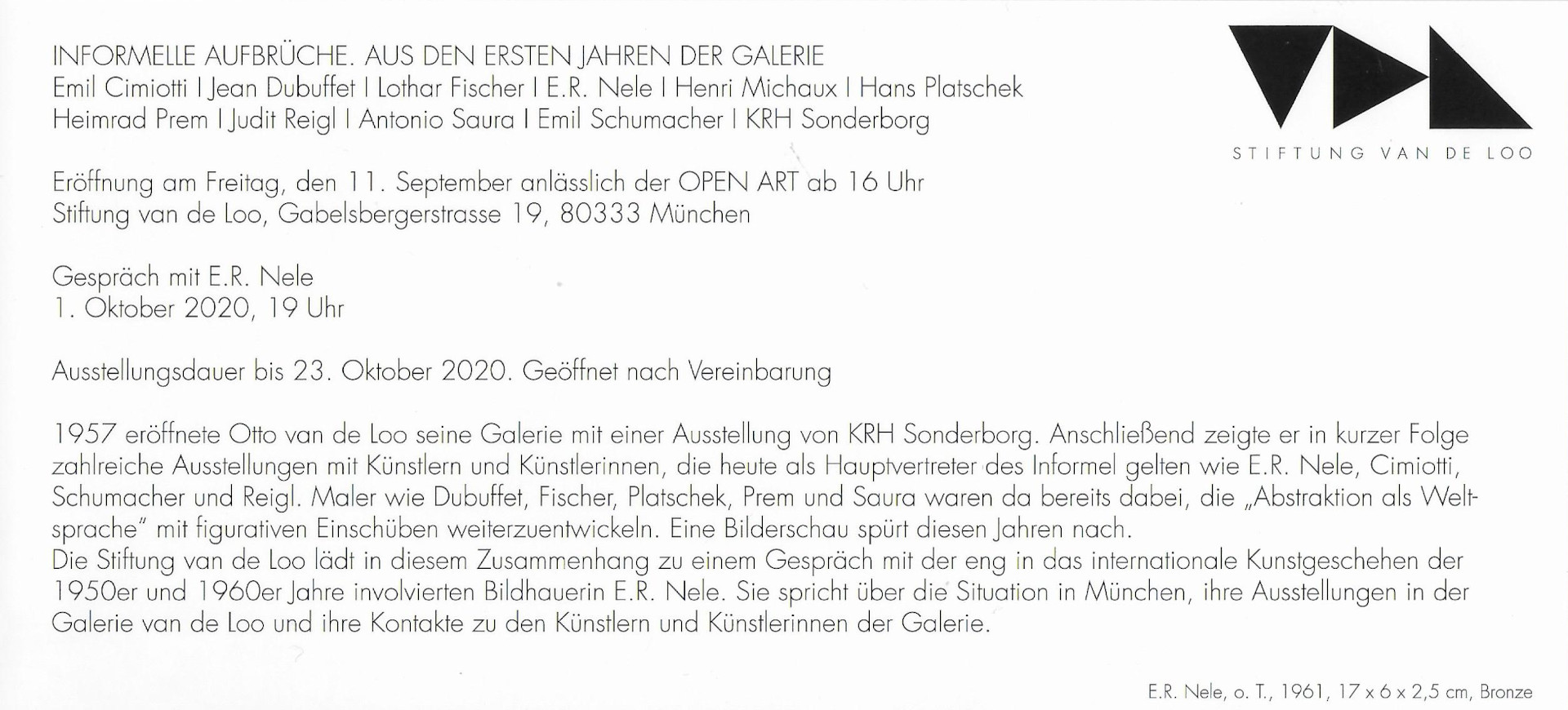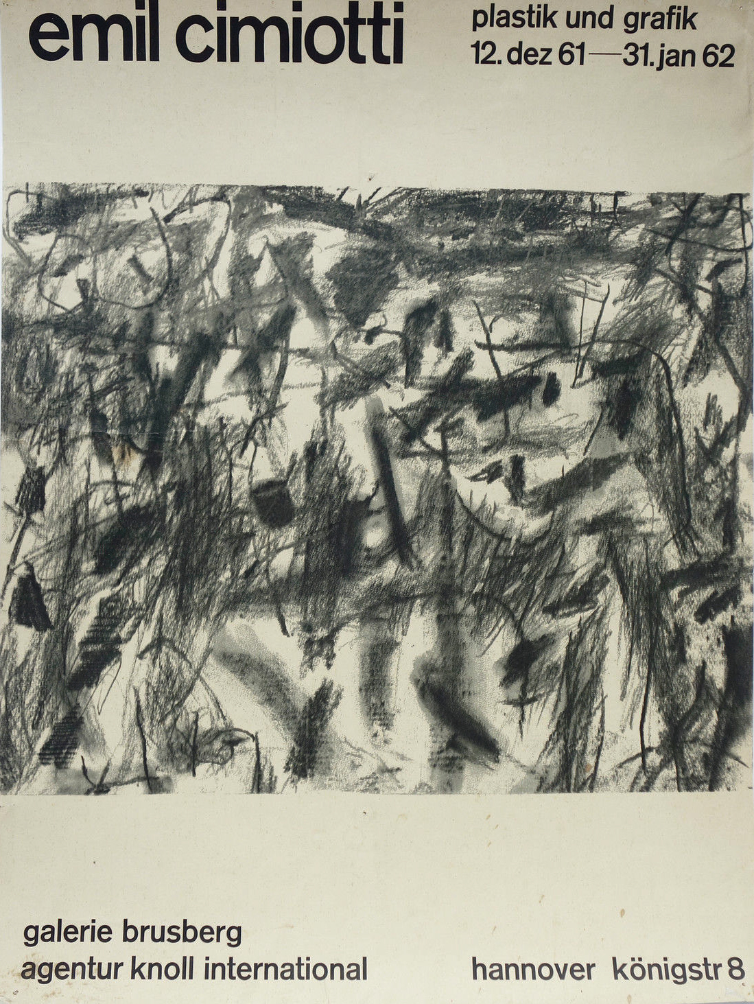 1961 * Galerie van de Loo, “Emil Cimiotti: Plastiken und Zeichnungen”, München, 17.01.-14.02.1961. - PLAKAT - - COVER - * Galerie Brusberg Hannover, “Cimiotti: plastik und grafik”, Hannover, 12.12.1961-31.01.1962. - PLAKAT - - COVER - * Kunst- und Museumsverein Wuppertal-Elberfeld, Turmhof, “HAP Grieshaber - Emil Cimiotti - Eberhard Fiebig”, 26.02.-02.04.1961. * Städtische Kunstgalerie Bochum, “Lust zum Risiko - Die Sammlung Albert Schulze Vellinghausen”, 05.03.-09.04.1961. - COVER - * Kunstverein Hannover, “122. Frühjahrsausstellung”, Hannover, 12.03.-16.04.1961. - COVER - * Staatliche Kunsthalle Baden-Baden, Deutscher Künstlerbund, “11. Jahresausstellung”, Baden-Baden, 02.04.-14.05.1961. - PLAKAT - - COVER - * Städtische Kunsthalle Recklinghausen, “Junger Westen 61”, Recklinghausen, 15.04.-22.05.1961. - PLAKAT - * Musée Rodin Paris, “2 ÉME (Deuxiéme) Exposition Internationale Sculpture Contemporaine”, Paris, 30.06.-15.10.1961. - COVER - * Wallraf-Richartz-Museum, “Ars Viva Köln 61”, Köln, 11.09.-11.10.1961. - PLAKAT - - COVER - * Musée d'Arte Moderne Paris,” II. Biennale des Jeunes Artistes”, Paris, 29.09.-05.11.1961. * Palais des Beaux-Arts Charleroi, “Peinture et Sculpture Contemporaines en Allemagne”, Charleroi, 30.09.-29.10.1961. - COVER - * Carnegie Institute, Dept. of Fine Arts Pittsburgh, “The 1961 Pittsburgh International Exhibition of Contemporary Painting and Sculpture”, Pittsburgh, 27.10.1961-07.01.1962. - COVER - * Abbaye Saint-Pierre Gent, “Peinture et Sculpture Contemporaines en Allemagne”, Gent, 10.11.-03.12.1961. - COVER -. * Staatliche Kunsthalle Baden-Baden, Gesellschaft der Freunde junger Kunst, “7. Jahresausstellung”, Baden-Baden, 18.11.-30.12.1961. - COVER - * Société de Zoologie Antwerpen,”Peinture et Sculpture Contemporaines en Allemagne”, Antwerpen, 08.12.1961-05.01.1962. - COVER -