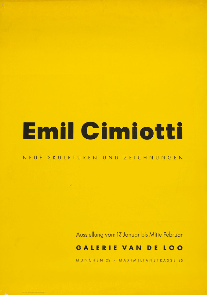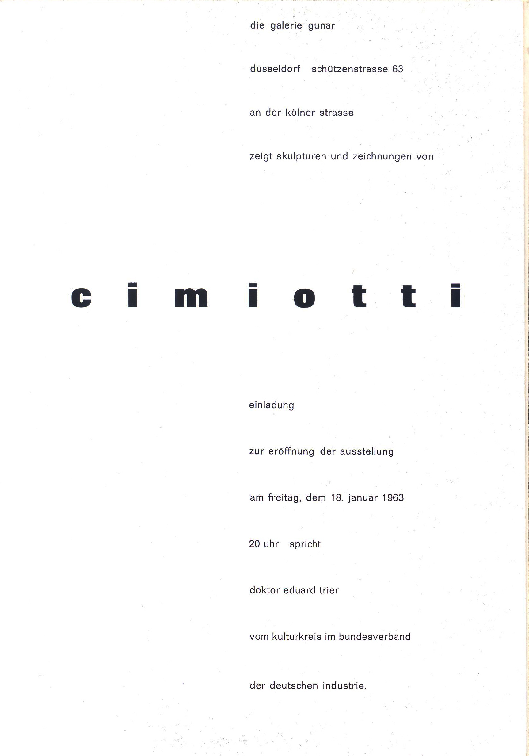 1963 * Galerie Gunar, “Emil Cimiotti: Skulpturen und Zeichnungen”, Düsseldorf, Eröffnung 18.01.1963. - FLYER - * Galerie Lutz u. Meyer, “Cimiotti”, Stuttgart, 04.04.-30.04.1963. - COVER - * Staatliche Kunsthalle Baden-Baden, Gesellschaft der Freunde junger Kunst Baden-Baden, “8. Jahresausstellung”, Baden-Baden, 11.01.-10.02.1963. - COVER - * Kunstverein Hannover, “124. Frühjahrsausstellung”, Hannover, 10.03.-14.04.1963. - COVER - * Galerie 5, Reutlingen, Haus Geiselhart, “Kunst aus Reutlinger Privatbesitz”, Reutlingen, März 1963. - COVER - * Württembergischer Kunstverein, Deutscher Künstlerbund, “12. Jahresausstellung”, Stuttgart, 18.05.-30.06.1963. - PLAKAT - - COVER - * Middelheimpark, “7. Biennale voor Beeldhouwkunst”, Middelheim/Antwerpen. 08.06.-30.09.1963. - COVER - * Musée Cantonal des Beaux-Arts Lausanne, “1er Salon International de Galeries Pilotes”, Lausanne, 20.06.-22.09.1963. - COVER - * Dallas Museum of Fine Arts, National Carl Schurz Association Philadelphia, “Graphic, German Prints at Mid-Century”, Dallas, 23.06.-14.07.1963. - COVER - * Nassauischer Kunstverein, “Aus der Sammlung “S” (“S” = Ströher Darmstadt)”, Wiesbaden, 13.07.-15.09.1963. * Kunstverein Hannover, “51. Herbstausstellung niedersächsischer Künstler”, Hannover, 06.10.-03.11.1962. - COVER - * Galerie Brusberg Hannover, “Bilder und Plastiken aus 5 Jahren”, Hannover, 09.12.1963-25.01.1964.