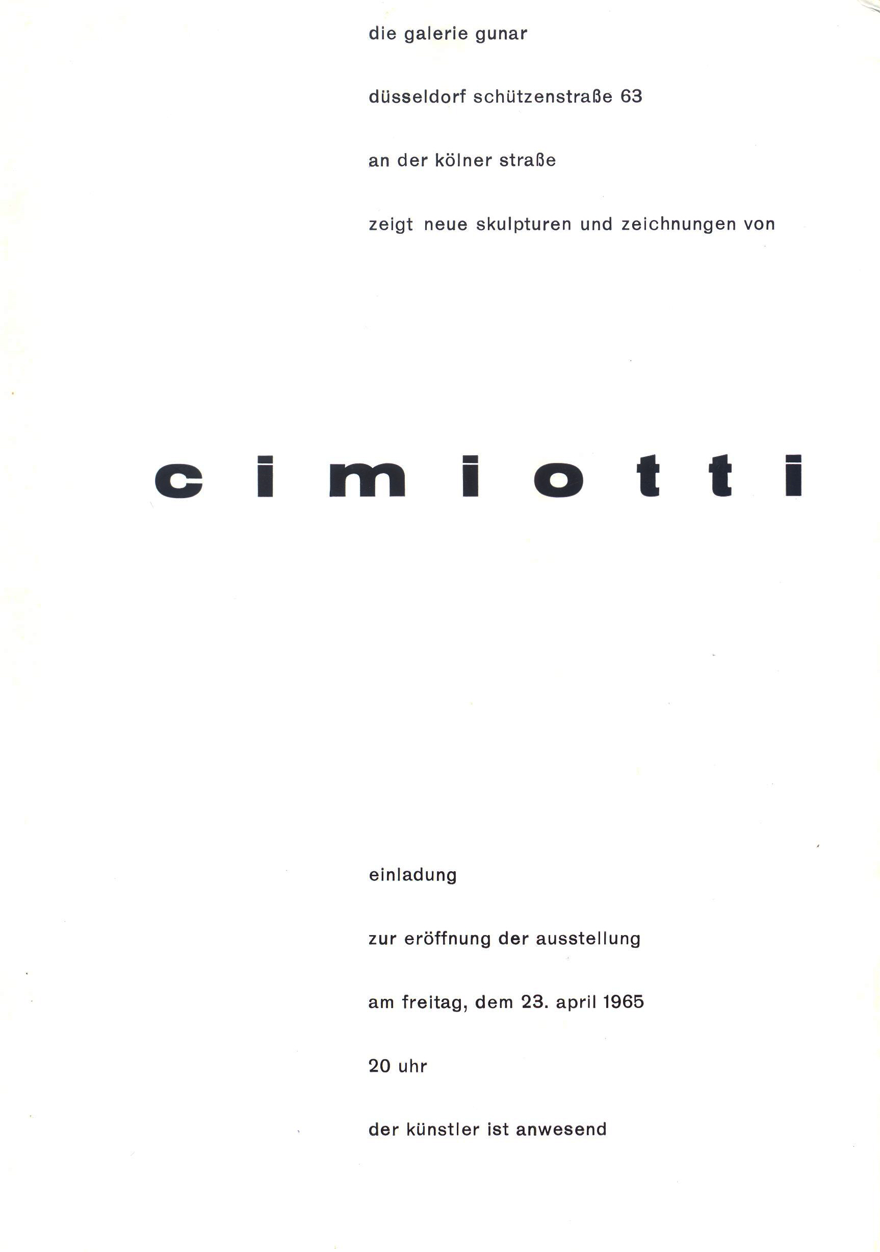 1965 * Galerie S Ben Wargin, “Cimiotti”, Berlin, 25.03.-21.04.1965. - k.P. - - COVER - * Galerie Gunar, “Emil Cimiotti: Neue Skulpturen und Zeichnungen”, Düsseldorf, Eröffnung 23.04.1965. - FLYER - * Galerie Tris, Kiel. * Kunstverein Hannover, “126. Frühjahrsausstellung”, Hannover, 14.03.- 25.04.1965. - COVER - * Atelier Lissabon, “Gruppe Ur (H.J. Breuste, Emil Cimiotti, Krijn Giezen, Jurjen de Haan, Gerhard Wendland)”, Den Haag, 07.05.-29.05.1965. - COVER - * Galerie 845 Amsterdam, “Gruppe UR (H.J. Breuste, Emil Cimiotti, Krijn Giezen, Jurjen de Haan, Gerhard Wendland)”, Amsterdam, 01.06.-30.06.1965. - COVER - * Staatliche Kunsthalle Baden-Baden, Gesellschaft der Freunde junger Kunst Baden-Baden, “10. Jahresausstellung”, 04.06.-05.07.1965. - COVER - * Oregon State University Corvallis, “Contemporary Prints from Germany II”, Oregon / Corvallis, 29.06.-15.08.1965. - FLYER - * Kunstverein Hannover, “53. Herbstausstellung niedersächsischer Künstler”, Hannover, 22.08.-26.09.1965. - COVER - * Galerie Brusberg Hannover, “Künstler der Galerie”, Hannover, 12.10.-12.11.1965. - COVER - * Galerie Rothe, Heidelberg, “Skulpturen - Kleinplastik - Bildhauergraphik”, Heidelberg, 19.11.1965-15.01.1966. - COVER - * Niedersächsisches Landesmuseum Braunschweig, Staatliche Hochschule für Bildende Künste Braunschweig, “Malerei * Graphik * Plastik”. - COVER - * Deutsche Kunst der Gegenwart, Teheran.