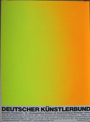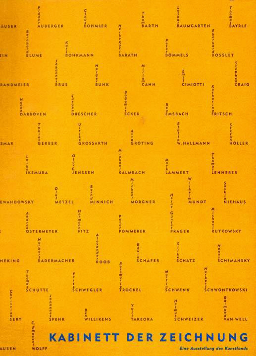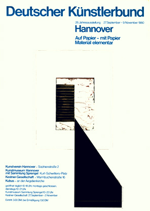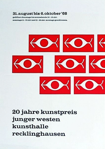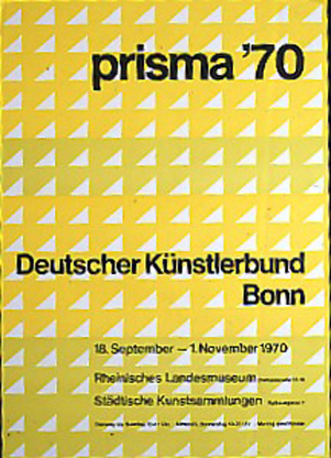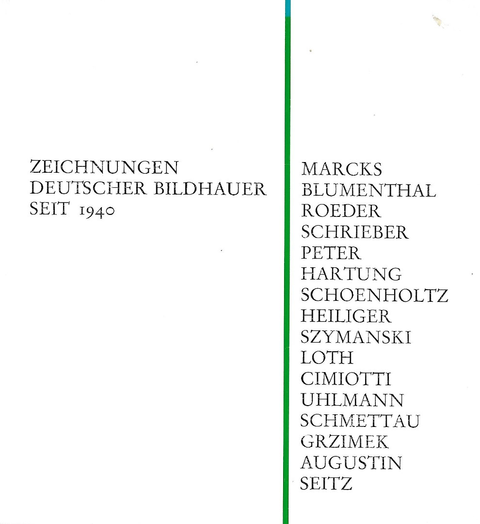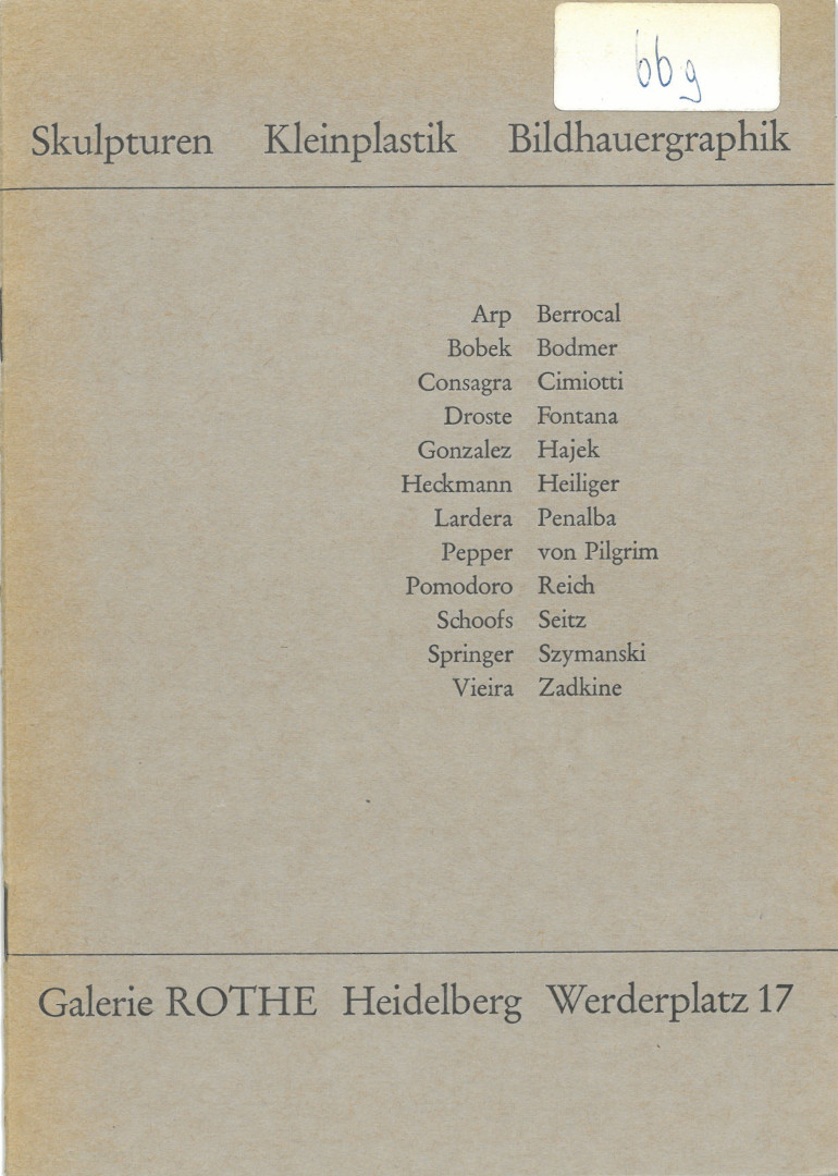 1968 * Lalit Kala Akademi of Art, First Triennale-India,” 8 German Sculptor”s, New Delhi, 10.02.-31.03.196. - COVER - * Galerie Brusberg Hannover, “für documenta-besucher und andere: Bilder und Künstler der Galerie”, Hannover, 17.05.- 15.07.1968. - COVER - * Kunstverein Hannover, “129. Frühlingsausstellung, Deutsche Kunst heute / German art today”, Hannover, 26.05.-21.07.1968. - COVER - * Kunsthalle Nürnberg, Künstlerhaus, Deutscher Künstlerbund, “16. Jahresausstellung”, Nürnberg, 20.07.-19.09.1968. - PLAKAT - - COVER - * Städtische Kunsthalle Recklinghausen, “Junger Westen 68 / 20 Jahre Junger Westen”, Recklinghausen, 31.08.-06.10.1968. - PLAKAT - - COVER - * Kunsthalle Recklinghausen, “Akt 68. Skulpturen, Bilder und Graphik deutscher Künstler”, Recklinghausen, 12.10.-17.11.1968. - COVER -