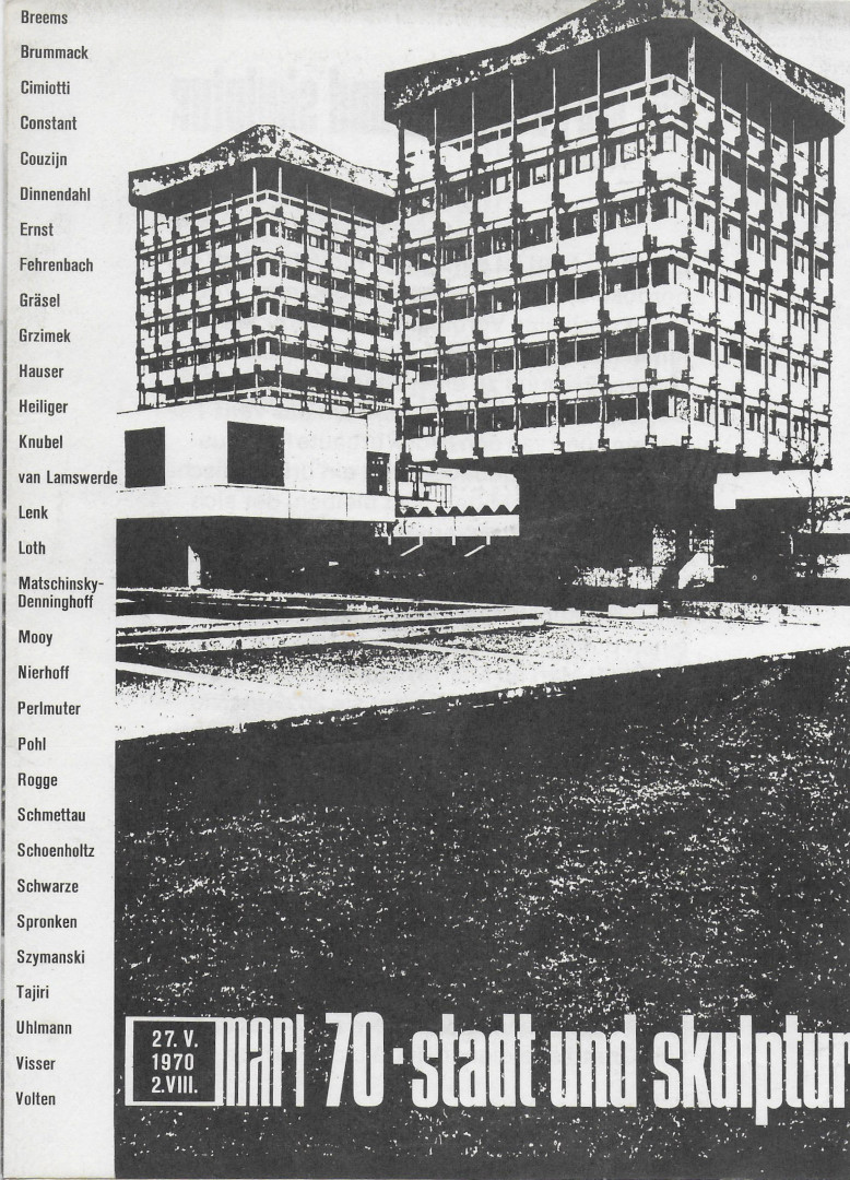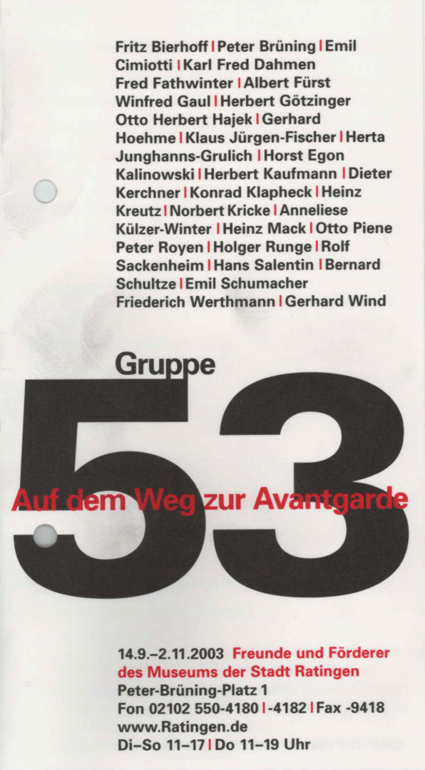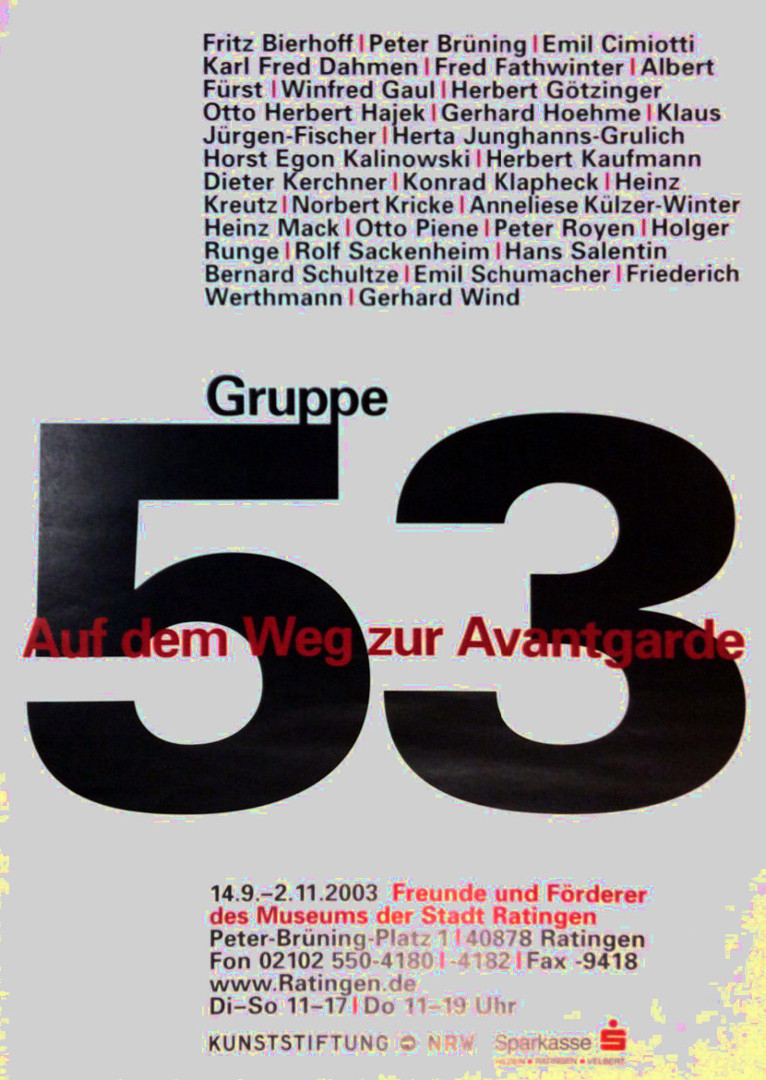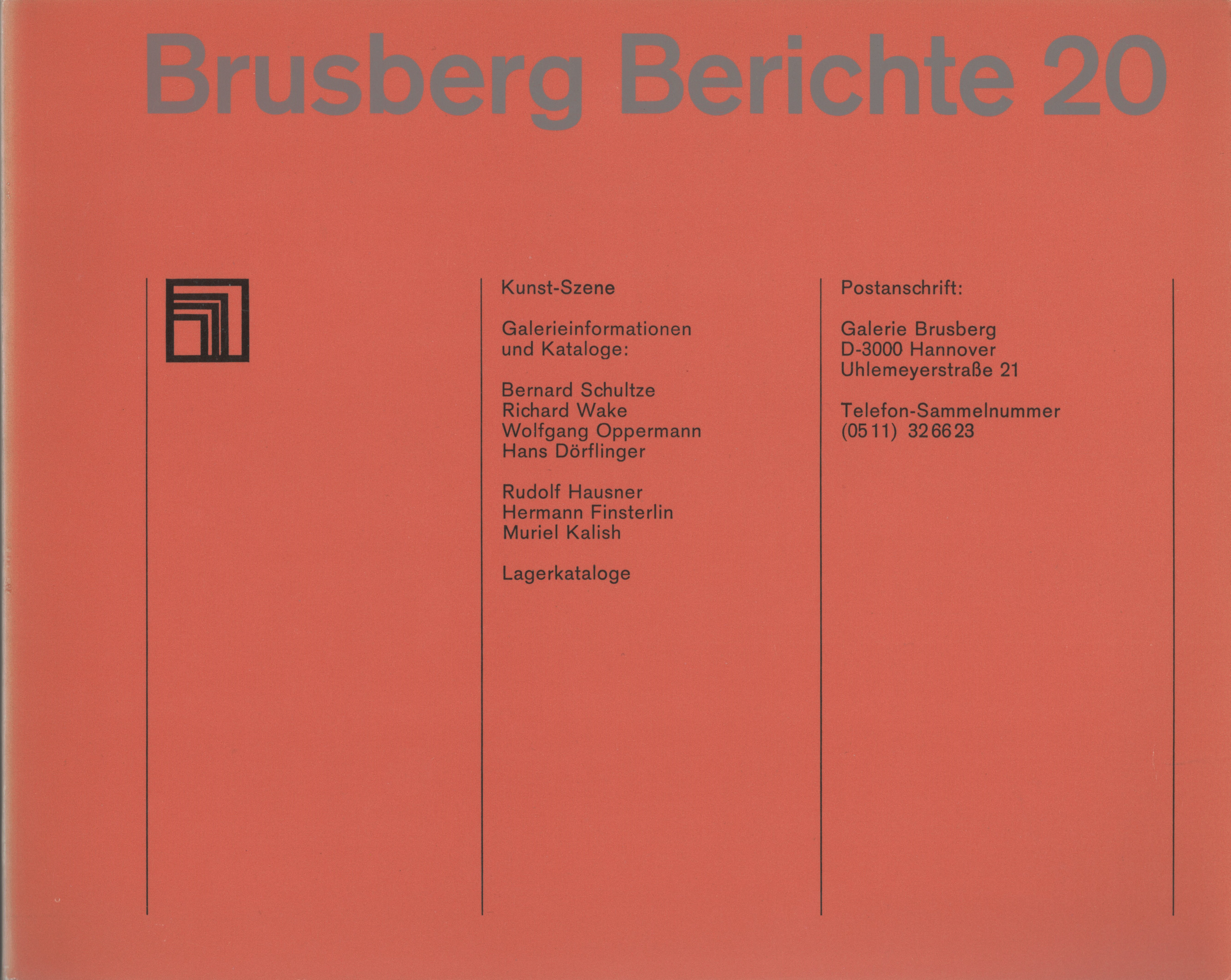 1968 * Lalit Kala Akademi of Art, First Triennale-India,” 8 German Sculptor”s, New Delhi, 10.02.-31.03.196. - COVER - * Galerie Brusberg Hannover, “für documenta-besucher und andere: Bilder und Künstler der Galerie”, Hannover, 17.05.- 15.07.1968. - COVER - * Kunstverein Hannover, “129. Frühlingsausstellung, Deutsche Kunst heute / German art today”, Hannover, 26.05.-21.07.1968. - COVER - * Kunsthalle Nürnberg, Künstlerhaus, Deutscher Künstlerbund, “16. Jahresausstellung”, Nürnberg, 20.07.-19.09.1968. - PLAKAT - - COVER - * Städtische Kunsthalle Recklinghausen, “Junger Westen 68 / 20 Jahre Junger Westen”, Recklinghausen, 31.08.-06.10.1968. - PLAKAT - - COVER - * Kunsthalle Recklinghausen, “Akt 68. Skulpturen, Bilder und Graphik deutscher Künstler”, Recklinghausen, 12.10.-17.11.1968. - COVER -