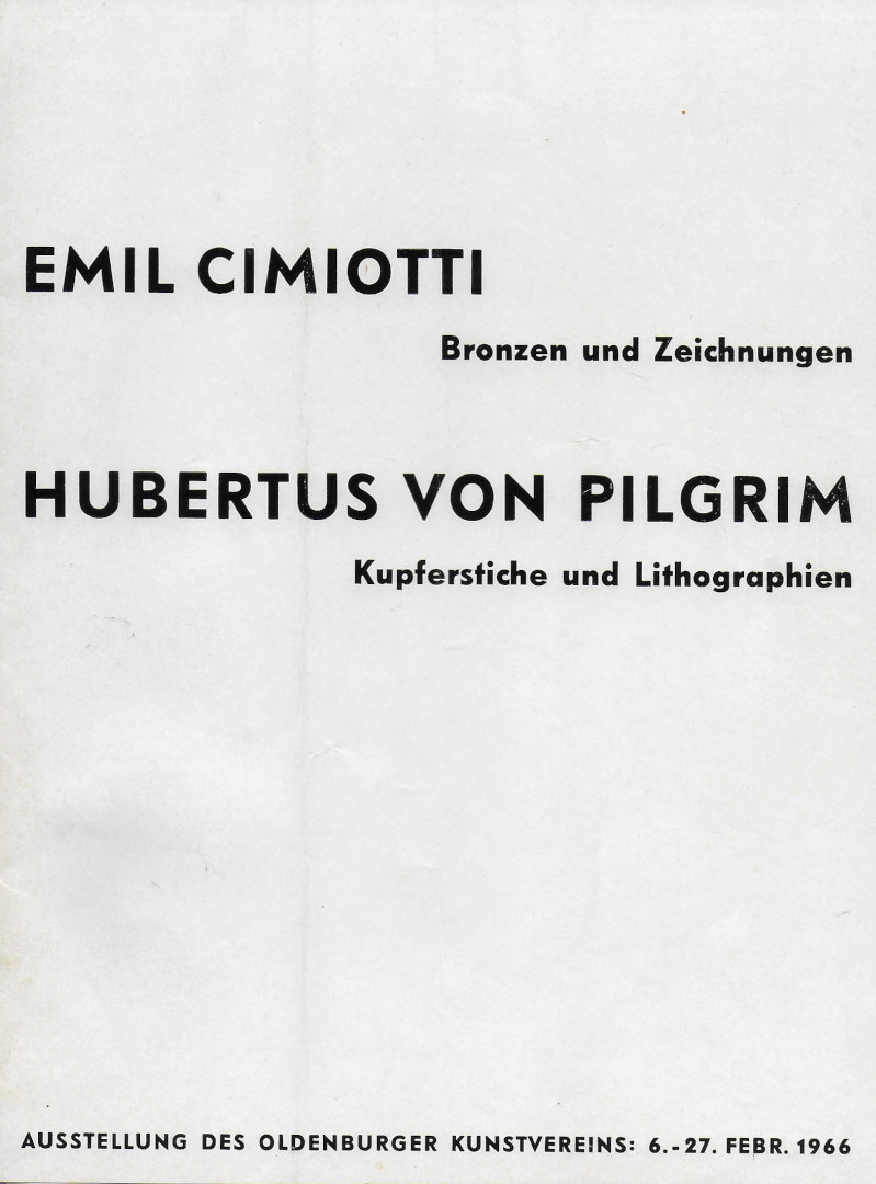 1966 ‘ Oldenburger Kunstverein, “Emil Cimiotti: Bronzen und Zeichnungen (mit Hubertus von Pilgrim)”, Oldenburg, 06.02.-27.02.1966. - k.P. - - FLYER - * Städt. Museum am Ritterplan, “Cimiotti”, Göttingen, 11.09.-23.10.1966. - COVER - * Kunstverein Hannover, “127. Frühjahrsausstellung”, Hannover, 13.03.-17.04.1966. - COVER - * Kunstverein Wolfsburg, Stadthalle, “Deutsche Maler und Bildhauer seit 1945”, Museumsspenden BDI, Wolfsburg, 24.04.-15.05.1966. - COVER - * Kunsthalle Baden-Baden, “Plastik Südwest”, Baden-Baden, 30.04.-10.07.1966. - COVER - * Akademie der Künste Berlin, “Junge Generation - Junge Maler und Bildhauer in Deutschland”, Berlin, 05.06.-10.07.1966. - COVER - * Ausstellungshallen am GRUGA-Park, Deutscher Künstlerbund, “14. Jahresausstellung”, Essen, 02.07.-31.07.1966. - COVER - * Hommage a Franz Roh, “Gesellschaft der Freunde junger Kunst, Kunstverein München”, München, 23.07.-22.08.1966. - COVER - * Gemeinnütziger Verein Erlangen, Orangerie, “Plastik in unserer Zeit”, Erlangen, 13.11.-04.12.1966. - COVER - * Galerie Rothe, ”Skulpturen Kleinplastik Bildhauergraphik”, Heidelberg, 19.11.1966-15.01.1967.