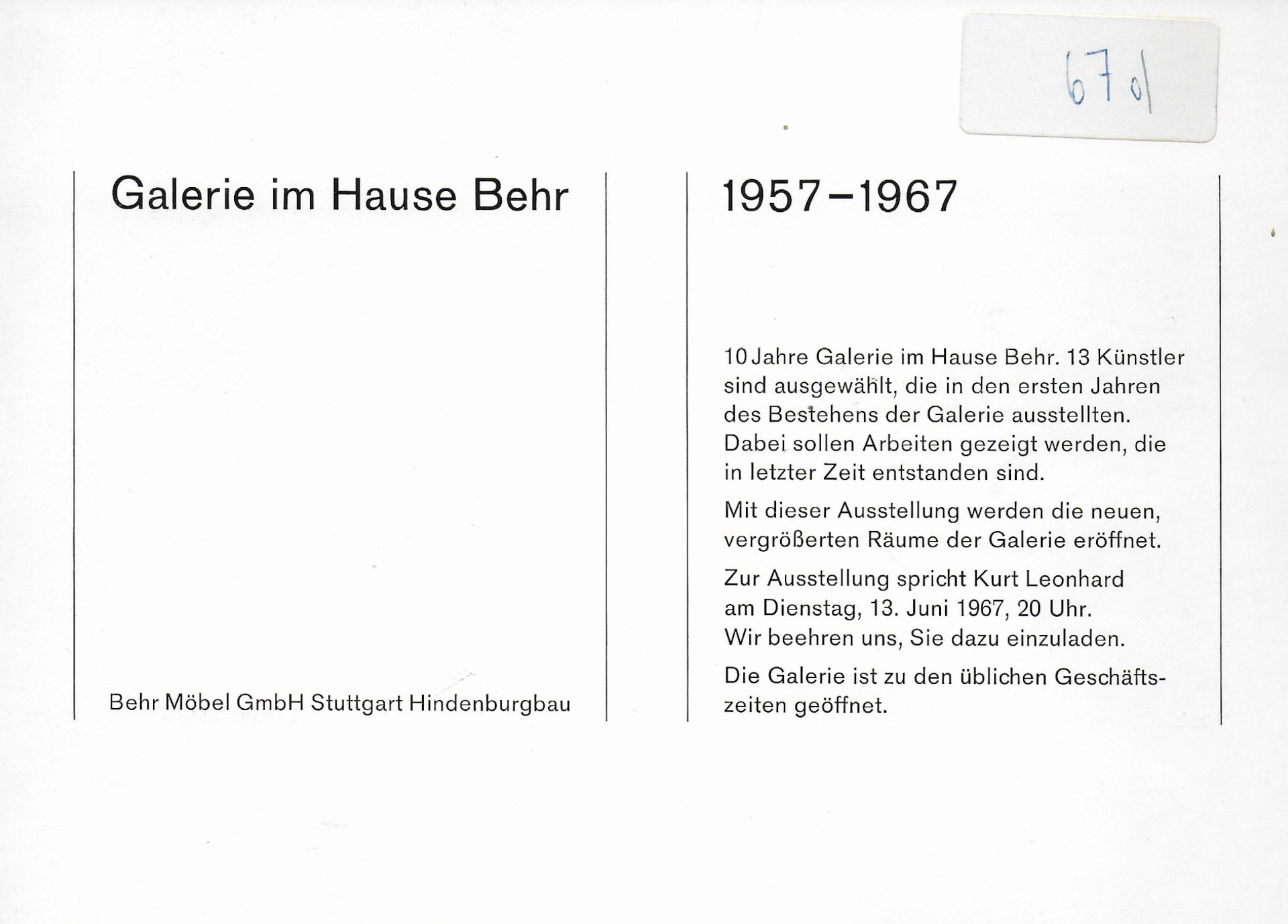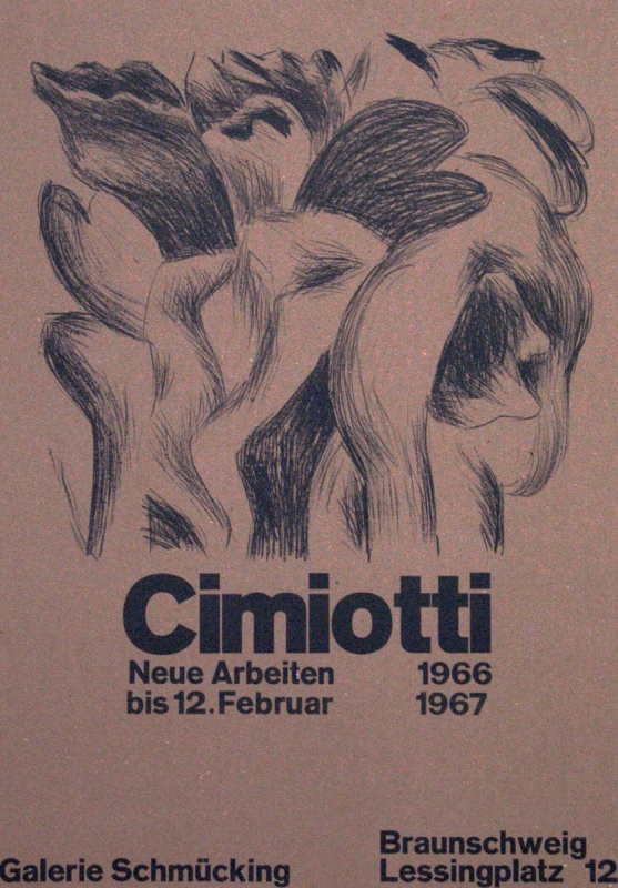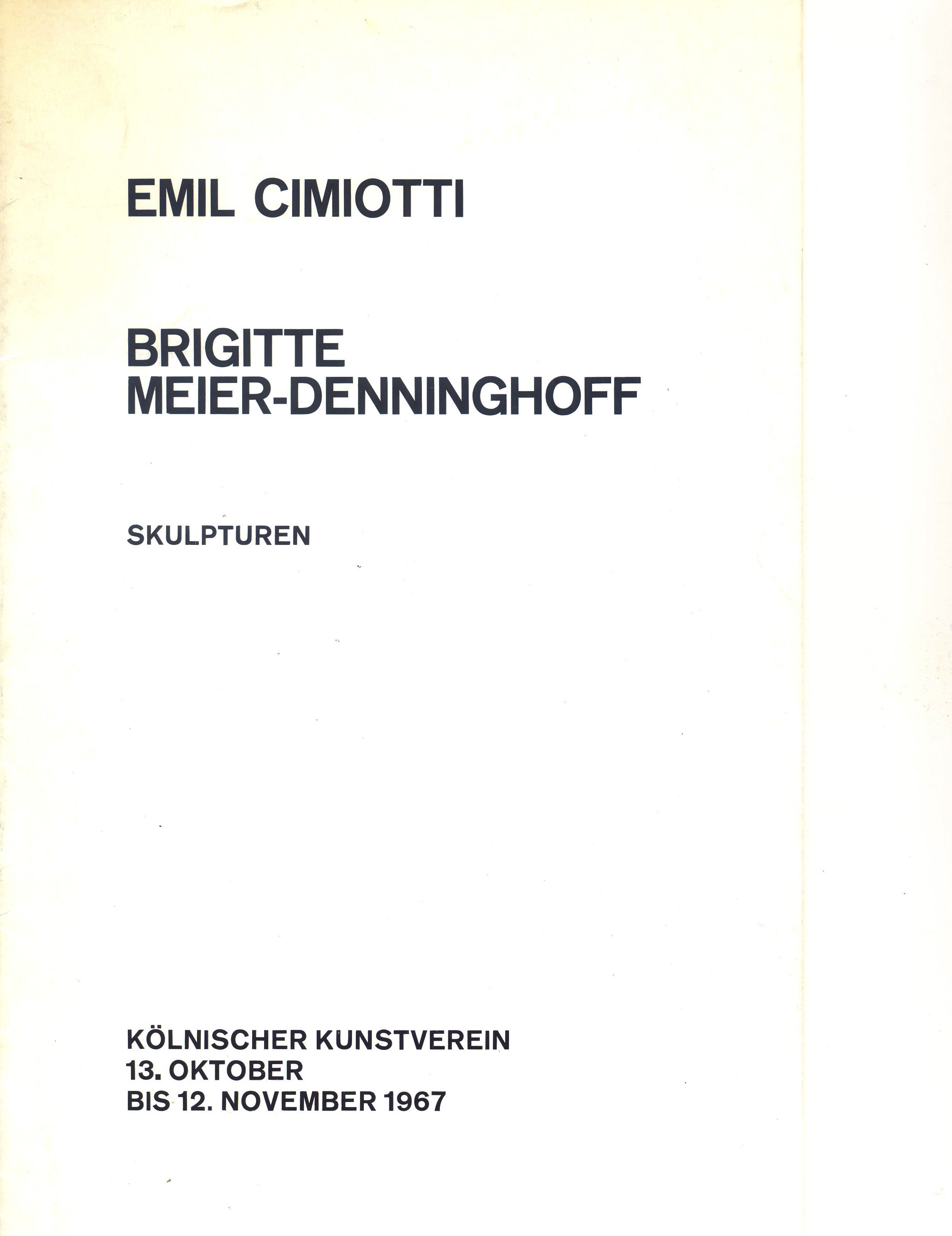1967 * Galerie Schmücking, “Emil Cimiotti: Neue Arbeiten 1966-1967”, Braunschweig, 12.01.-12.02.1967. - PLAKAT - - COVER - * Kölnischer Kunstverein, “Emil Cimiotti - Brigitte Meier-Denninghoff - Skulpturen”, Köln, 13.10.-12.11.1967. - COVER - * Staatliche Kunsthalle Baden-Baden, Gesellschaft der Freunde junger Kunst Baden-Baden, “11. Jahresausstellung”, 10.03.-16.04.1967. - COVER - * Kunstverein Hannover, “128. Frühjahrsausstellung”, Hannover, 02.04.-07. Mai 1967. - COVER - * Beograd, SHfBK - Staatliche Hochschule für Bildende Künste Braunschweig, “Grafik & Zeichnungen”, Beograd, Mai 1967. - COVER - * Ljubljana, SHfBK - Staatliche Hochschule für Bildende Künste Braunschweig, “Grafik & Zeichnungen”, Ljubljana, Juni 1967. - COVER - * Galerie nächst St. Stephan, “Graphik International”, Wien, 05.06.-08.07.1967. * Galerie im Hause Behr, “10 Jahre Galerie Behr - 13 Künstler”, Stuttgart, Eröffnung 13.06.1967. - COVER - * Kunstverein Hannover, “55. Herbstausstellung niedersächsischer Künstler”, Hannover, 27.08.-24.09.1967. - COVER - * Badischer Kunstverein, Alte Markthalle, Deutscher Künstlerbund, “15. Jahresausstellung”, Karlsruhe, 23.09.-29.10.1967. - PLAKAT - - COVER - * Kunstverein Hannover, “Deutsche Handzeichnungen und Aquarelle der letzten zwanzig Jahre”, Hannover, 22.10.-19.11.1967. - COVER - * Landesgalerie Hannover, “Bildwerke der Gegenwart”, Hannover. - COVER -
