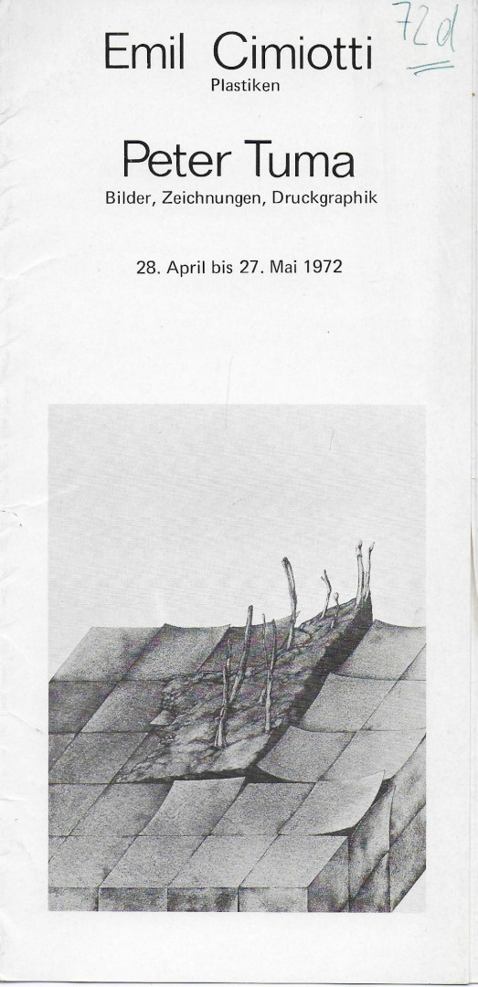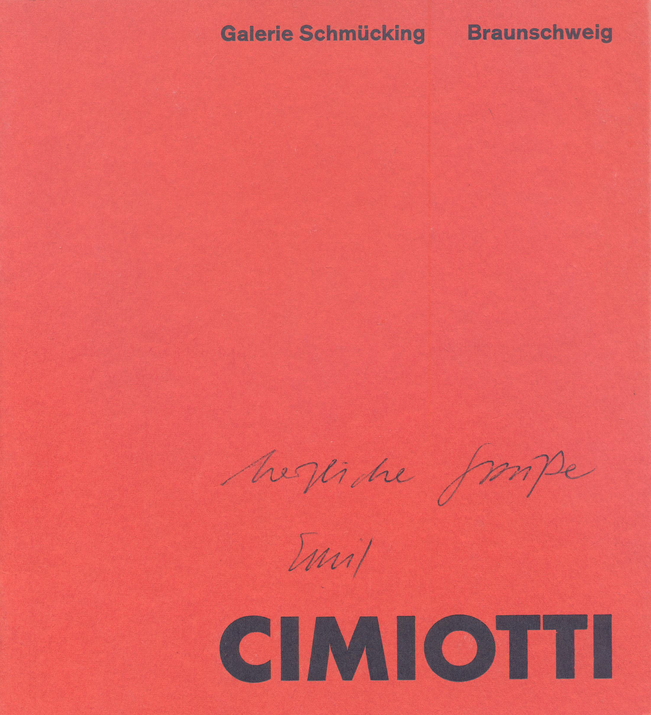 1972 * Galerie von Kolczynski. “Emil Cimiotti - Plastik und Zeichnungen”. Stuttgart. 22.01.-24.02.1972. - FLYER - * Galerie Walther, “Emil Cimiotti”, Düsseldorf (mit Peter Tuma), 28.04.-27.05.1972. - COVER - - FLYER - * Galerie Frenzel, Bonn. * Der Kunstkreis Hameln, Rolf Flemes Haus, “Emil Cimiotti: Plastik-Zeichnung”, Hameln. * Galeie Müller Stuttgart, “Informelle Deutsche Kunst”, Stuttgart, 31.05.-31.07.1972. - FLYER - * Städtische Galerie Schwarzes Kloster Freiburg, “Zeichnungen Deutscher Bildhauer seit 1940”, Freiburg i. Br., 02.09.-24.09.1972. - COVER - * Städtische Galerie, Kunstverein im Schloß Wolfsburg, “Informelles-Formelles-Kunst der 60er Jahre aus dem Besitz der Städtischen Galerie”, Wolfsburg. - COVER -