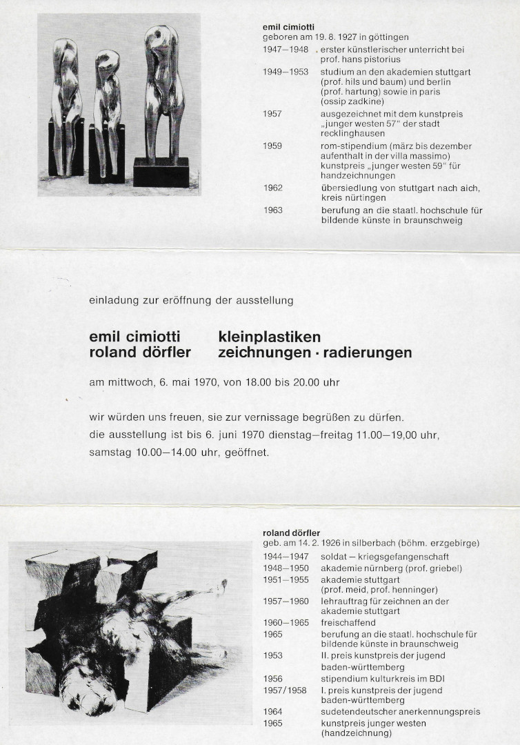 1970 * Galerie grafikmeyer Karlsruhe, “Emil Cimiotti: Kleinplastiken (mit Roland Dörfler)”, Karlsruhe, 06.05.-06.06.1970. - FLYER - * Kunsthalle Mannheim, “Plastik - Erwerbungen 1964-1969”, Mannheim, 24.01.-01.03.1970. - COVER -. * “Stadt und Skulptur”, Marl, Marl 70, Marl, 29.05.-02.08.1970. - COVER - - FLYER - * Staatsgalerie Stuttgart, “Handzeichnungen der Gegenwart”, Stuttgart, 05.06.-30.08.1970. - COVER - * Städtische Kunstsammlungen Bonn, Rheinisches Landesmuseum, Deutscher Künstlerbund, “18. Jahresausstellung”, Bonn, 18.09.-01.11.1970. - PLAKAT - - COVER - * Museum für Kunst und Gewerbe Hamburg, “Die Techniken der Plastik, 4. Auswahl-Ausstellung”, Hamburg, 08.10.-20.12.1970. - COVER - * “Freiplastik” anlässlich der Weltausstellung in Osaka/Japan (“Daphne” 1961), 15.03.-13.09.1970. - PLAKAT -