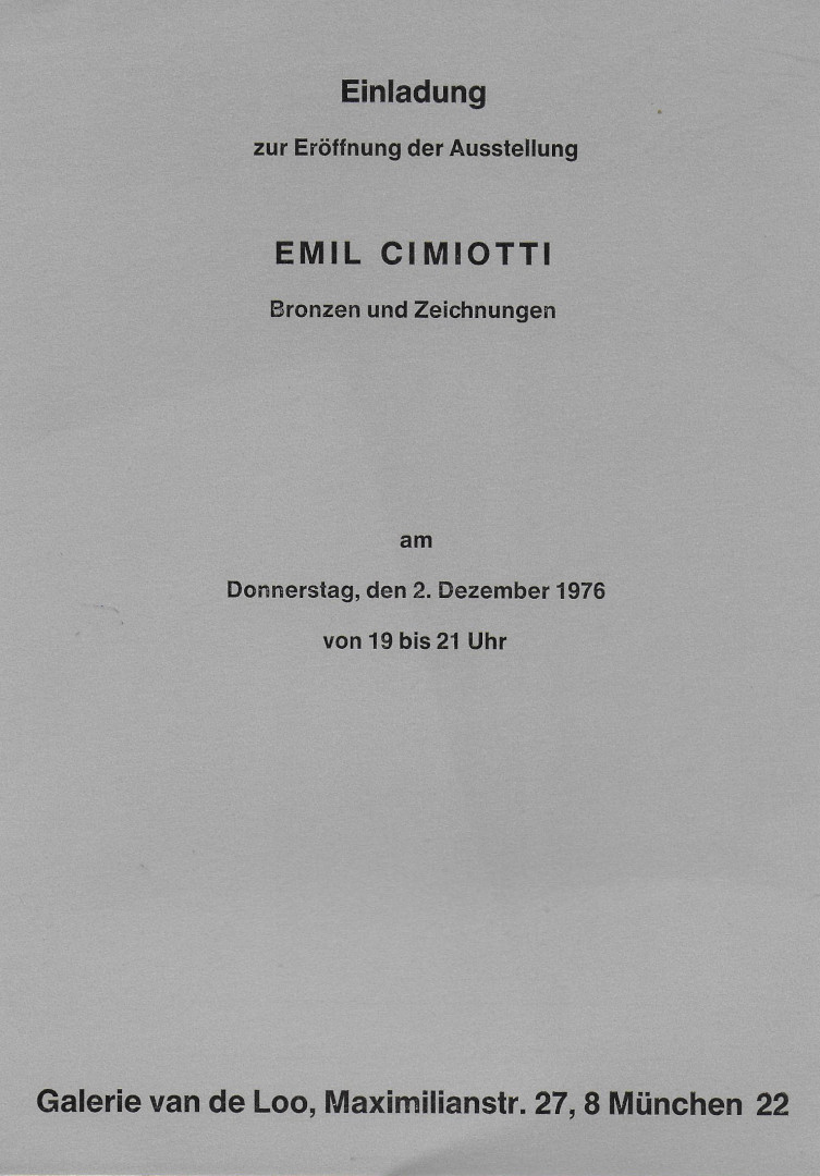 1976 * Galerie van de Loo, “Emil Cimiotti: Bronzen und Zeichnungen”, München, 02.12.1976-08.01.1977. - k.P. - - COVER - - FLYER - * Städtisches Museum Leverkusen, Schloß Morsbroich, “Nach 25 Jahren - Morsbroich heute, Aus der Sammlung”, Leverkusen, 23.01.-22.02.1976. - COVER - * Wilhelm Lehmbruck Museum Duisburg, “Landschaftsbilder aus eigenem Besitz”, Duisburg, 05.03.-09.05.1976. - COVER -. * Deutsche Akademie Villa Massimo, “Plastik im Park”, Rom, Mai / Juni 1978. - COVER - * Multihalle am Herzogenriedpark, Deutscher Künstlerbund, “24. Jahresausstellung”, Mannheim, 21.05.-18.07.1976. - PLAKAT - - COVER - * Universität Bremen, “Kunst im Stadtbild-von Kunst am Bau zu Kunst im öffentlichen Raum”, Bremen, 08.06.-30.06.1976. - COVER -
