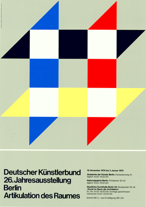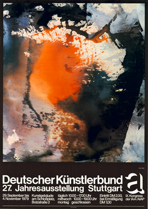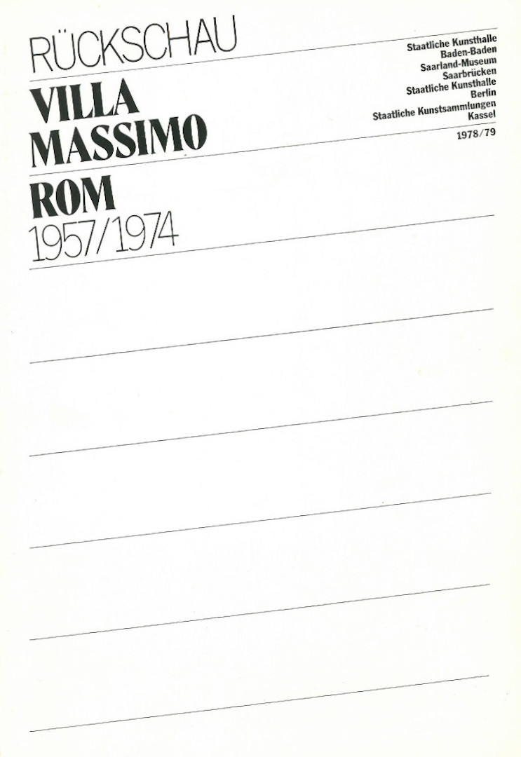 1979 * Saarland-Museum Saarbrücken, “Rückschau Villa Massimo, Rom 1957/1974”, Saarbrücken, 20.02.-20.03.1979. - COVER - * Staatliche Kunsthalle Berlin, “Rückschau Villa Massimo, Rom 1957/1974”, Berlin, 08.04.-06.05.1979. - COVER - * Staatliche Kunstsammlungen Kassel, Orangerie, “Rückschau Villa Massimo, Rom 1957/1974”, Kassel, 18.05.-15.07.1979. - COVER - * Kunstgebäude am Schloßplatz, Deutscher Künstlerbund, “27. Jahresausstellung”, Stuttgart, 29.09.-04.11.1979. - PLAKAT - - COVER - * Städtisches Kunstmuseum Bonn, “30 Jahre Kunst in der Bundesrepublik Deutschland, Die Sammlung des Kunstmuseums Bonn”, 23.11.1979-03.02.1980. - COVER -