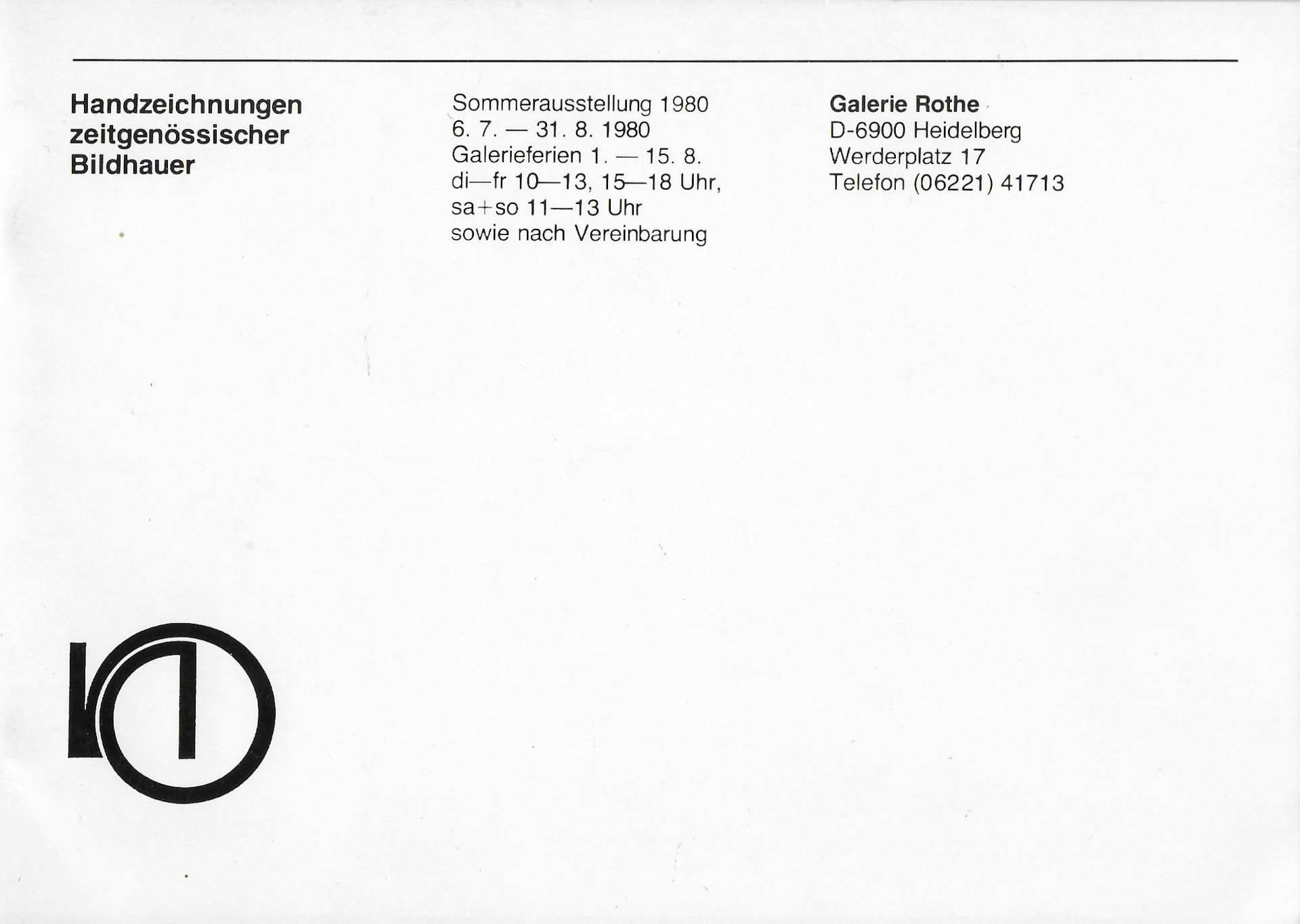 1980 * Galerie Brusberg, Ausstellung 202, Zeichnungen aus der Toskana, “Cimiotti: Rignana-Folge und neue Skulpturen”, Hannover, 27.09.-31.10.1980. - COVER - * Staatsgalerie Stuttgart, “Zeichnungen von Bildhauern des 20. Jahrhunderts”. Stuttgart, 01.03.-04.05.1980. - COVER - * Landgrafenschloß Marburg, “Mit den Händen sehen, Deutsche Blindenstudienanstalt e.V.”, Marburg. 26.04.-26.05.1980. - COVER - * Galerie Rothe, “Handzeichnungen zeitgenöschischer Bildhauer”, Heidelberg, 06.07.-31.08.1980. - COVER - * Schwabenlandhalle Fellbach, “1. Triennale Fellbach: Kleinplastik in Deutschland”, Fellbach, 12.07.-24.08.1980. - COVER - * Kestner-Gesellschaft/Kunstverein Hannover/Sammlung Sprengel, Deutscher Künstlerbund, “28. Jahresausstellung”, Hannover, 27.09.-09.11.1980. - PLAKAT - - COVER -
