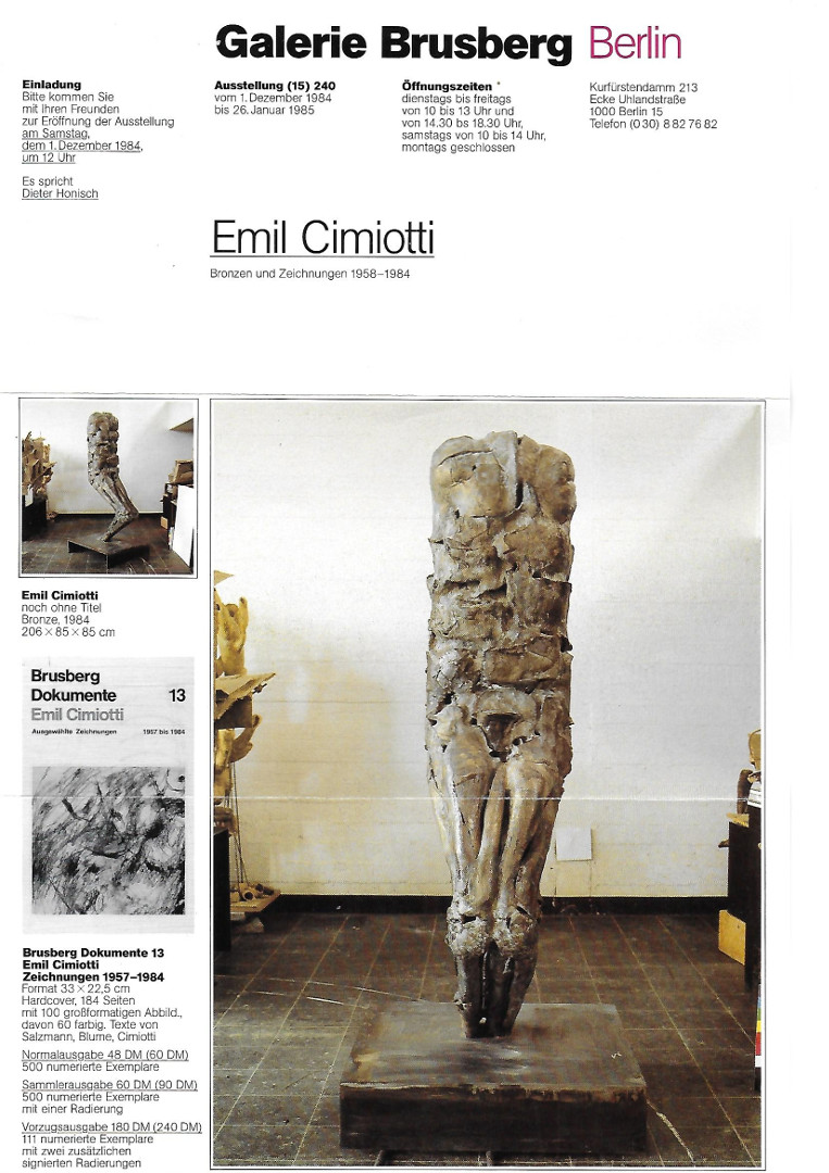 1984 * Galerie Brusberg Berlin, Ausstellung 240 (15), “Emil Cimiotti: Bronzen und Zeichnungen 1958-1984”, Berlin, 01.12.1984-26.01.1985. - COVER - - FLYER - * Moderne Galerie des Saarland Museums, “Figura docet, Die Gestalt des Menschen in den Handzeichnungen deutscher Bildhauer”, Saarbrücken, 22.07.-02.09.1984. - COVER - * Museum Rottweil, “Sorgfalt 84. Positionen deutscher Kunst seit 1945”, Ein imaginäres Museum für Rottweil, Rottweil, 08.09.-07.10.1984. - COVER - * Frankfurter Kunstverein, Paulskirche, Deutscher Künstlerbund, “32. Jahresausstellung”, Frankfurt, 06.10.-15.11.1984. - PLAKAT - - COVER - * Kreissparkasse Esslingen-Nürtingen, Hauptstelle Esslingen, “Die nach draußen gingen”, Esslingen, 19.11.1984-04.01.1985. - COVER - * Kleine Nordpfälzer Galerie Deutscher Kunst des XX. Jahrhunderts, “Arbeiten aus dem Besitz der Sammlung Pachen, Bildhauerarbeiten”, Gerbach. - COVER -