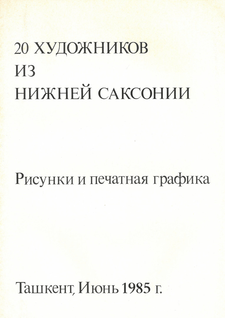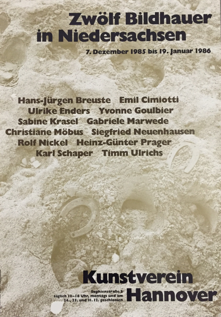 1985 * “Krankheit und Kranksein in der Gegenwartskunst”, eine Wanderausstellung der Basilisken-Presse, Institut für Moderne Kunst Marburg -.COVER - -- Marburg, Rathaus und Brüder Grimm-Stube, 23.03.-28.04.1985 -- Berlin, Institut für Arzeneimittel des BGA, 07.05.-09.06.1985 -- Hamburg, Katholische Akademie, 19.06.-17.07.1985 -- Ingelheim, Fa. Boehringer Ingelheim, 03.08.-25.08.1985 -- Mainz, Chirurgische Universitätsklinik, 01.09.-13.10.1985 -- Ingolstadt, Deutsches Medizinhistorisches Museum, 17.10.-15.12.1985 * Allwetterzoo Münster, Galerie der Stadtsparkasse Münster, “Animalia 85, Tierplastik des 20. Jahrhunderts”, Münster, 31.03.-04.08.1985. - COVER - * Städtische Museen Heilbronn, “Natur-Figur-Skulptur”, Skulpturenallee Heilbronn, Deutschhof, 19.05.-30.09.1985. - COVER - * Taschkent, “20 Künstler aus Niedersachsen-Zeichnungen und Druckgrafik”. Eine Ausstellung des Kulturamtes der Landeshauptstadt Hannover, Juni 1985. - COVER - * Kestner-Gesellschaft/Kunstverein Hannover/Sammlung Sprengel, Deutscher Künstlerbund, “33. Jahresausstellung”, Hannover, 14.09.-27.10.1985. - PLAKAT - - COVER - * Nationalgalerie Berlin, “Kunst in der Bundesrepublik Deutschland 1945-1985”, Berlin, 27.09.1985-21.01.1986. - COVER - * Staatliche Museen Preußischer Kulturbesitz, “Deutsche Meisterzeichnungen des 20. Jahrhunderts, 100 Meisterwerke aus der Nationalgalerie Berlin”, im Bundeskanzleramt Bonn, Eröffnung 26.11.1985. - COVER - - FLYER - * Kunstverein Hannover, “12 Bildhauer aus Niedersachsen”, Hannover, 07.12.1985-19.01.1986. - PLAKAT - - COVER -