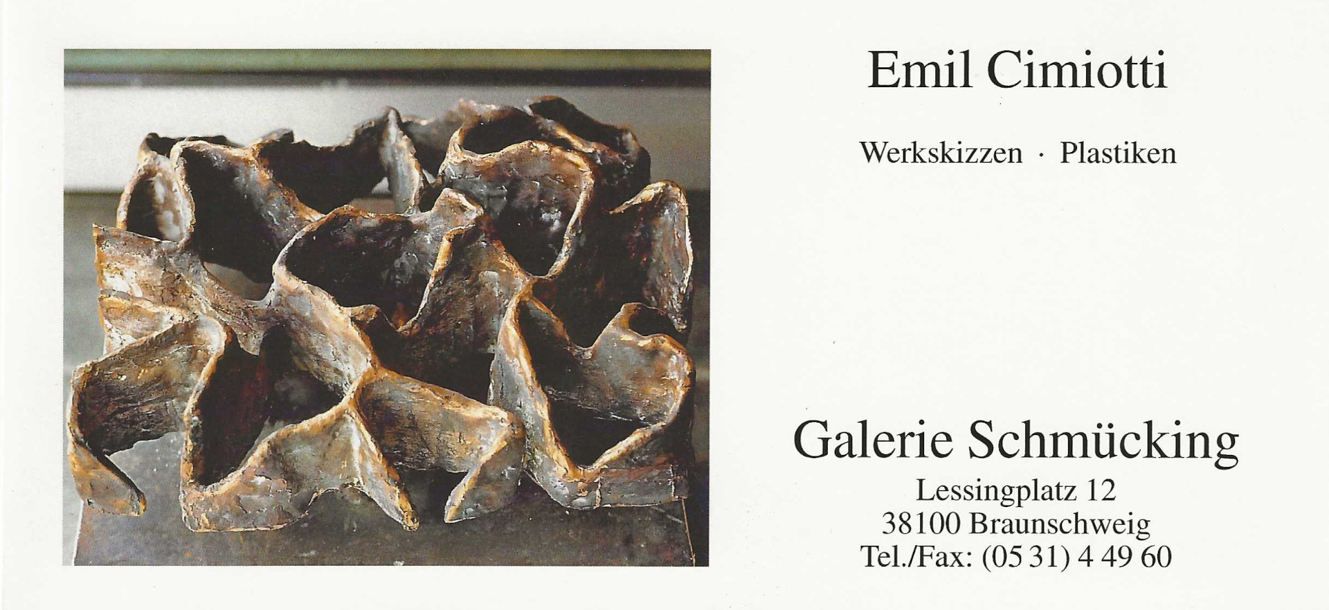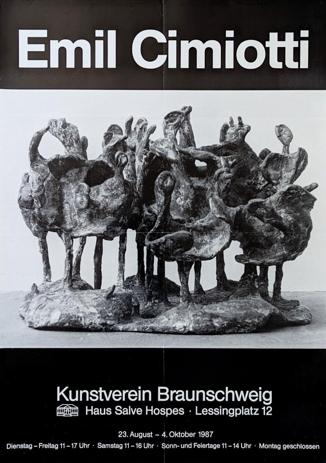 1987 * Kunstverein Braunschweig, Haus Salve Hospes, “Emil Cimiotti: Skulpturen und Zeichnungen”, Braunschweig, 23.08.-04.10.1987. - PLAKAT - - COVER - * Galerie Mathea, “Emil Cimiotti”, Wolfenbüttel. * Kunstverein Hannover, “Hochschule für Bildende Künste Braunschweig - 25 Jahre”, Braunschweig, 29.11.1987-24.01.1988. - COVER - * Galerie Brusberg Berlin, “Ausstellung 265 (39), 30 Jahre - Rückblick und Ausblick”, Berlin, 03.12.1988-31.01.1989.
