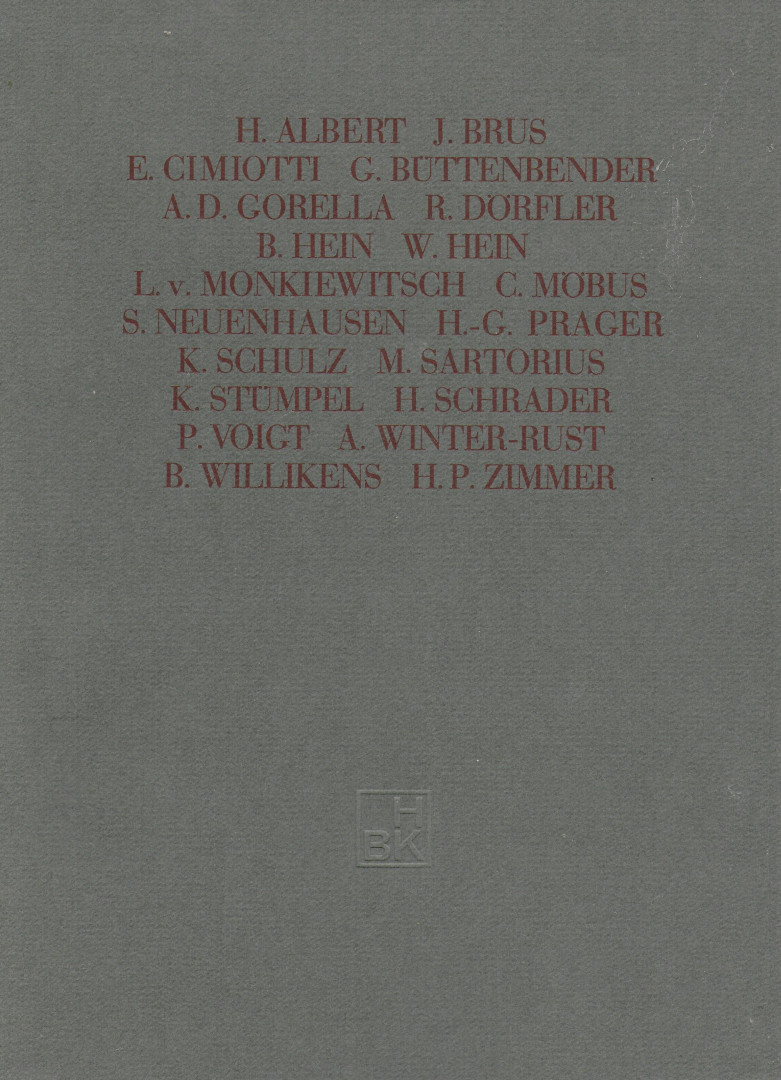 1978 * Wilhelm-Lehmbruck-Museum der Stadt Duisburg, “Der Kopf, Plastiken aus dem 20. Jahrhundert”, Duisburg, 10.03.-30.04.1978. - COVER - * Mittelrheinisches Landesmuseum Mainz, “Sammlung Pachen”, Mainz, 13. September bis 15. Oktober 1978. - COVER - * Niedersächsische Landesbibliothek Hannover, “Kunst am Bau - Ausstellung der Wettbewerbsarbeiten”, Hannover, 06.11.-18.11.1978. - COVER - * Herzog Anton Ulrich-Museum, Kunstverein Braunschweig, Städtisches Museum, Staatliche Hochschule für Bildende Künste, “1963-1978”, Braunschweig, 12.11.-10.12.1978. - COVER - * Akademie der Künste Berlin, Neue Nationalgalerie, Deutscher Künstlerbund, “26. Jahresausstellung”, Mannheim, 18.11.1978-03.01.1979. - PLAKAT - - COVER - * Staatlichen Kunsthalle Baden-Baden, “Rückschau Villa Massimo, Rom 1957/1974”, Baden-Baden, 20.12.1978-28.01.1979. - COVER -