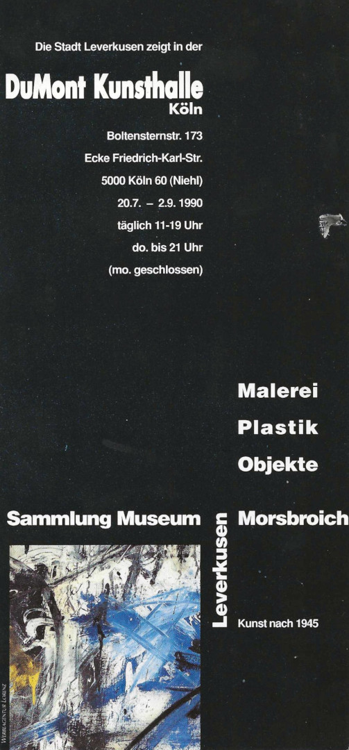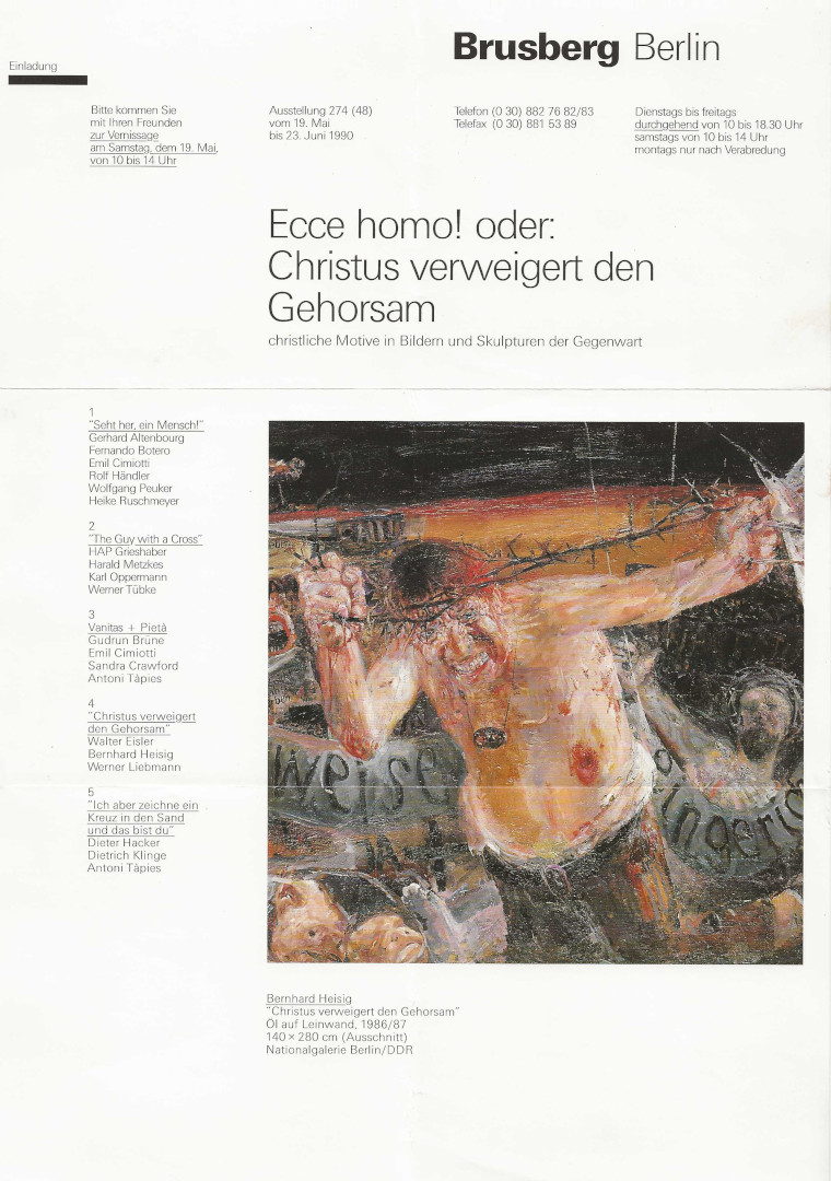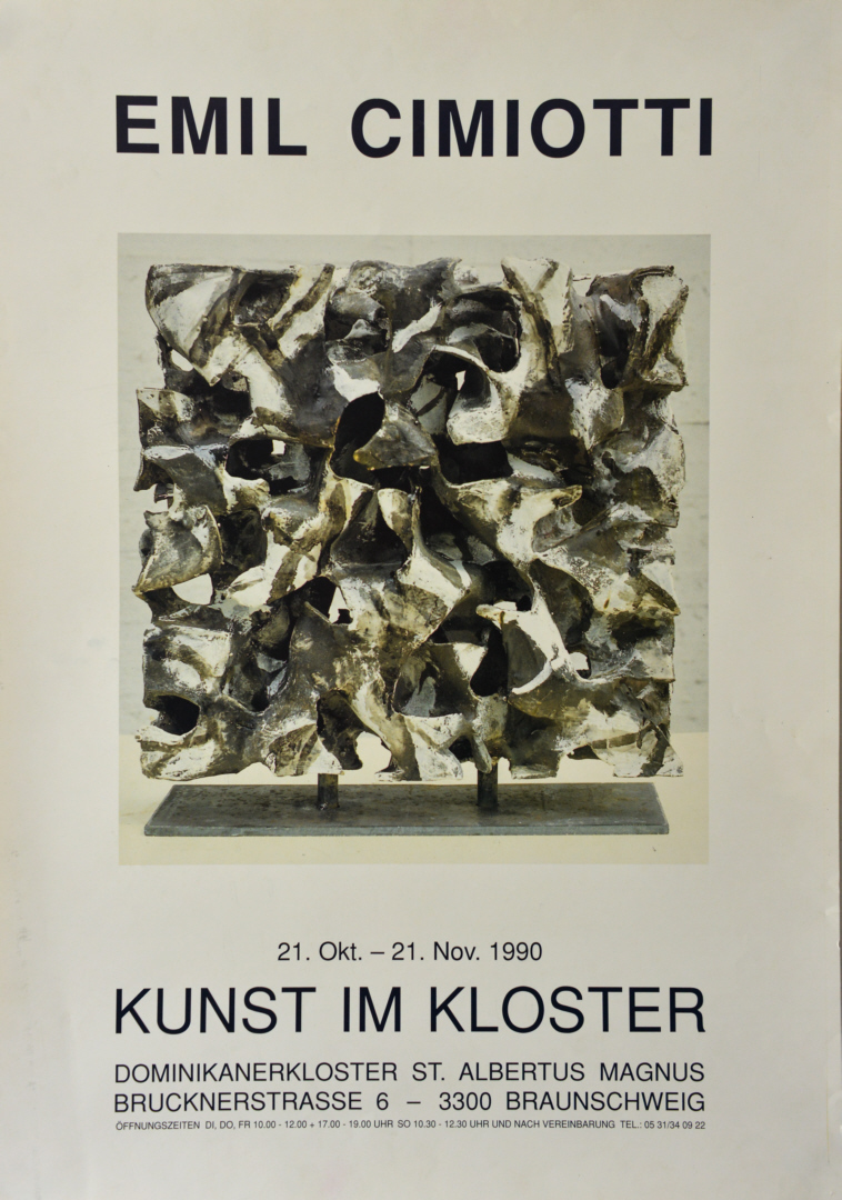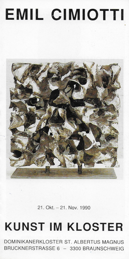 1990 * Dominikanerkloster St. Albertus Magnus, “Emil Cimiotti - Kunst im Kloster”, Braunschweig, 21.10.-21.11.1990. - PLAKAT - - FLYER - * Kunstverein Celle, “Hommage für Arno Schmidt, Wind kam auf: Wind”, Celle, 18.02.-18.03.1990. - COVER - * Galerie Brusberg Berlin, “Bilder von Menschen”, Berlin, 07.03.-06.04.1990. - FLYER - * Galerie Brusberg Berlin, Ausstellung 274 (48), “Ecce homo! oder: Christus verweigert den Gehorsam”, Berlin, 19.05.-23.06.1990. - FLYER - * DuMont Kunsthalle Köln, “Sammlung Museum Morsbroich Leverkusen - Kunst nach 1945”, Köln. 20.07.-02.09.1990. - FLYER - * Akademie der Künste Berlin, Staatliche Kunsthalle, Deutscher Künstlerbund, “38. Jahresausstellung”, Berlin, 11.11.-19.12.1990. - PLAKAT - - COVER - - FLYER - * Galerie T. Gierig, Frankfurt. * Galerie Carillon, Paderborn, Dezember 1990.