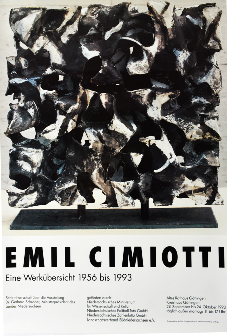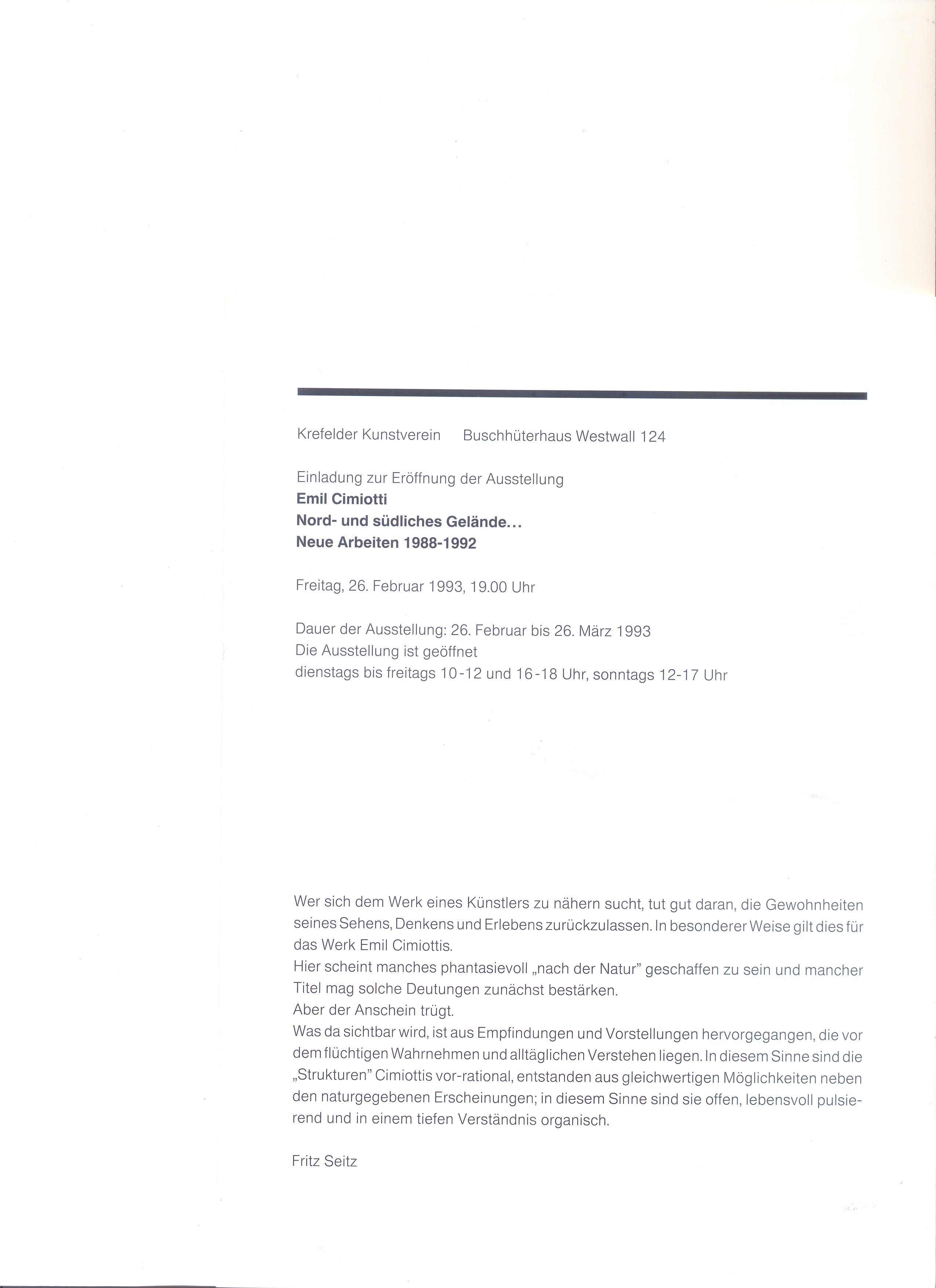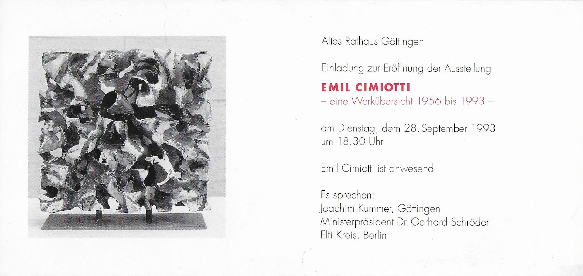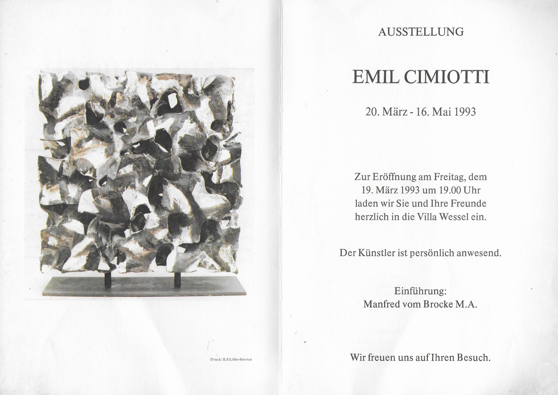 1993 * Kunstverein Krefeld, “Emil Cimiotti: Nord- und südliches Gelände ... Neue Arbeiten 1988-1992”, Krefeld, 26.02.-26.03.1993. - FLYER - * Villa Wessel, “Emil Cimiotti: Plastiken und Zeichnungen”, Iserlohn, 19.03.-16.05.1993. - PLAKAT - - FLYER - - LINK - * Skulpturenpark Lehnin, Skulpturengarten am Klostersee, “Bobek-Cimiotti-Stötzer”, Lehnin/Brandenburg, 18.07.-30.09.1993. k.P. - COVER - - FLYER - * Altes Rathaus Göttingen, “Emil Cimiotti: Eine Werksübersicht 1956 bis 1993”, Göttingen, 29.09.-24.10.1993. - PLAKAT - - COVER - - FLYER - * Bischöfl. Generalvikariat Hildesheim, Dom Hildesheim, “Emil Cimiotti”, Hildesheim. * Städtische Museen Heilbronn, “Kopf-Ansichten, Malerei und Plastik der 80er Jahre”, Heilbronn, 29.01.-21.03.1993. - COVER - * Mathildenhöhe Darmstadt, “28. Ausstellung der Darmstädter Sezession 1993”, Darmstadt, 04.04.-31.05.1993. - COVER - * Dominikanerkloster St. Albertus Magnus Braunschweig, “Passion Bernward-Jahr 1993”, Braunschweig, 16.05.-20.07.1993. - COVER - * Landeskunstwochen Baden-Württemberg, “Die 60er Jahre in der Kunst des Deutschen Südwestens”, Aalen, 16.09.-06.10.1993. - COVER - - FLYER - * Albertinum der Staatlichen Kunstsammlungen Dresden, Deutscher Künstlerbund, “41. Jahresausstellung, abstrakt, Dresden”, 19.09.-21.11.1993. - PLAKAT - - COVER - - FLYER - * Galerie Schlichtenmaier, Schloss Dätzingen, “Positionen der 60er Jahre”, Grafenau, 17.10.-20.11.1993. - COVER - * Städtisches Museum Schloß Salder, Stadt Salzgitter, “Salon Salder ‘93”, Salzgitter, 24.10.1993-16.01.1994. - COVER -