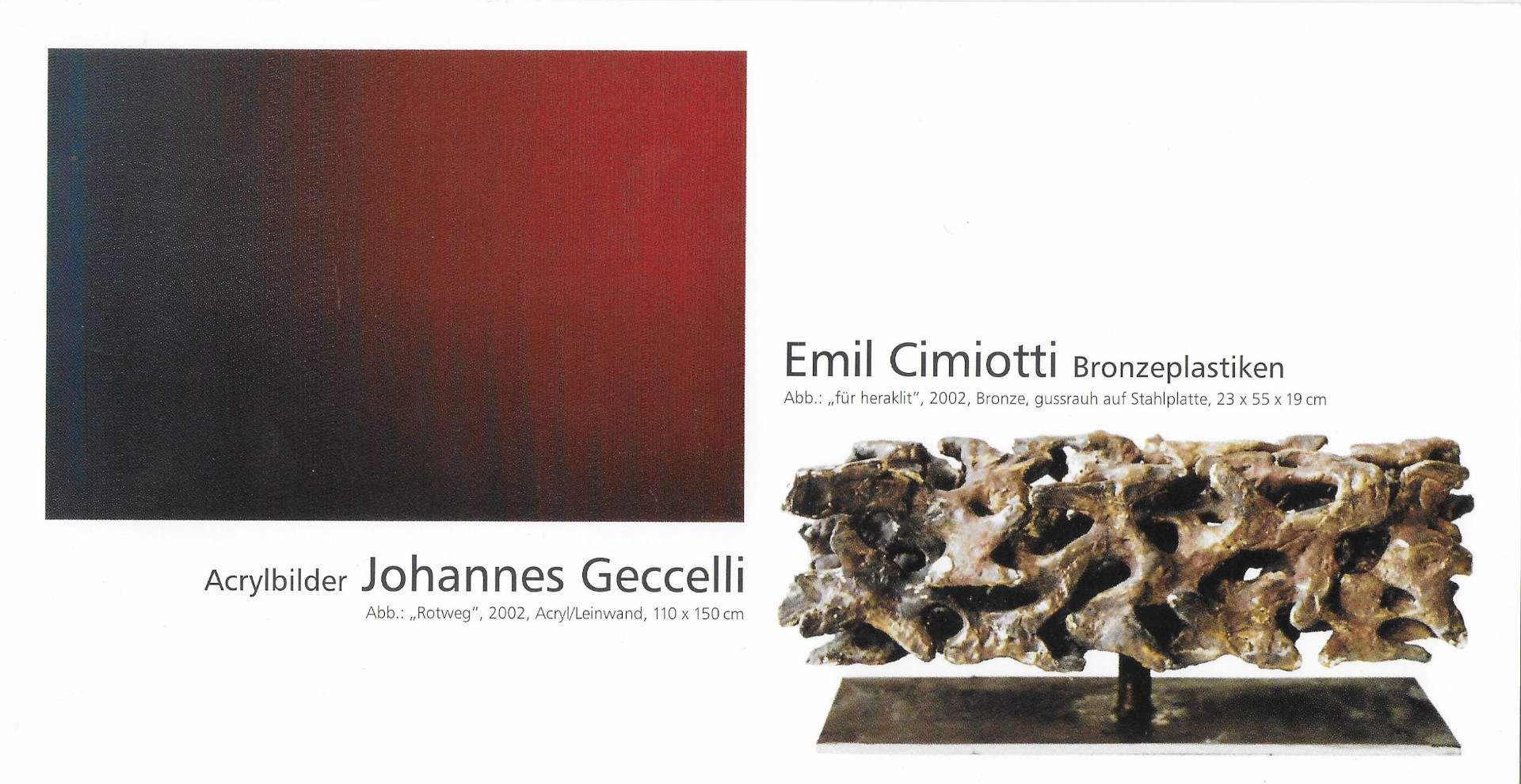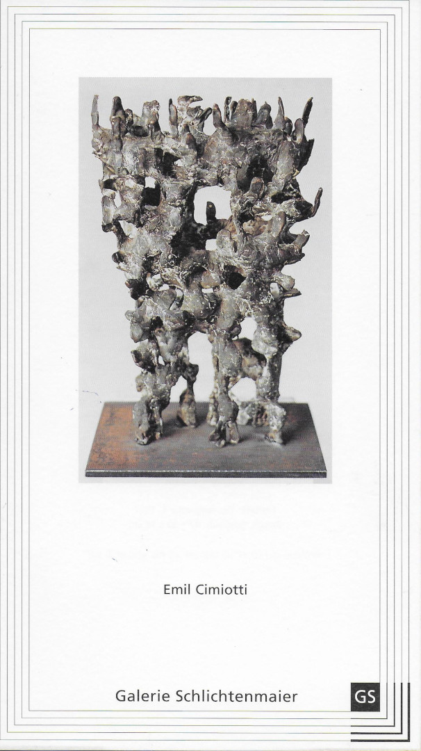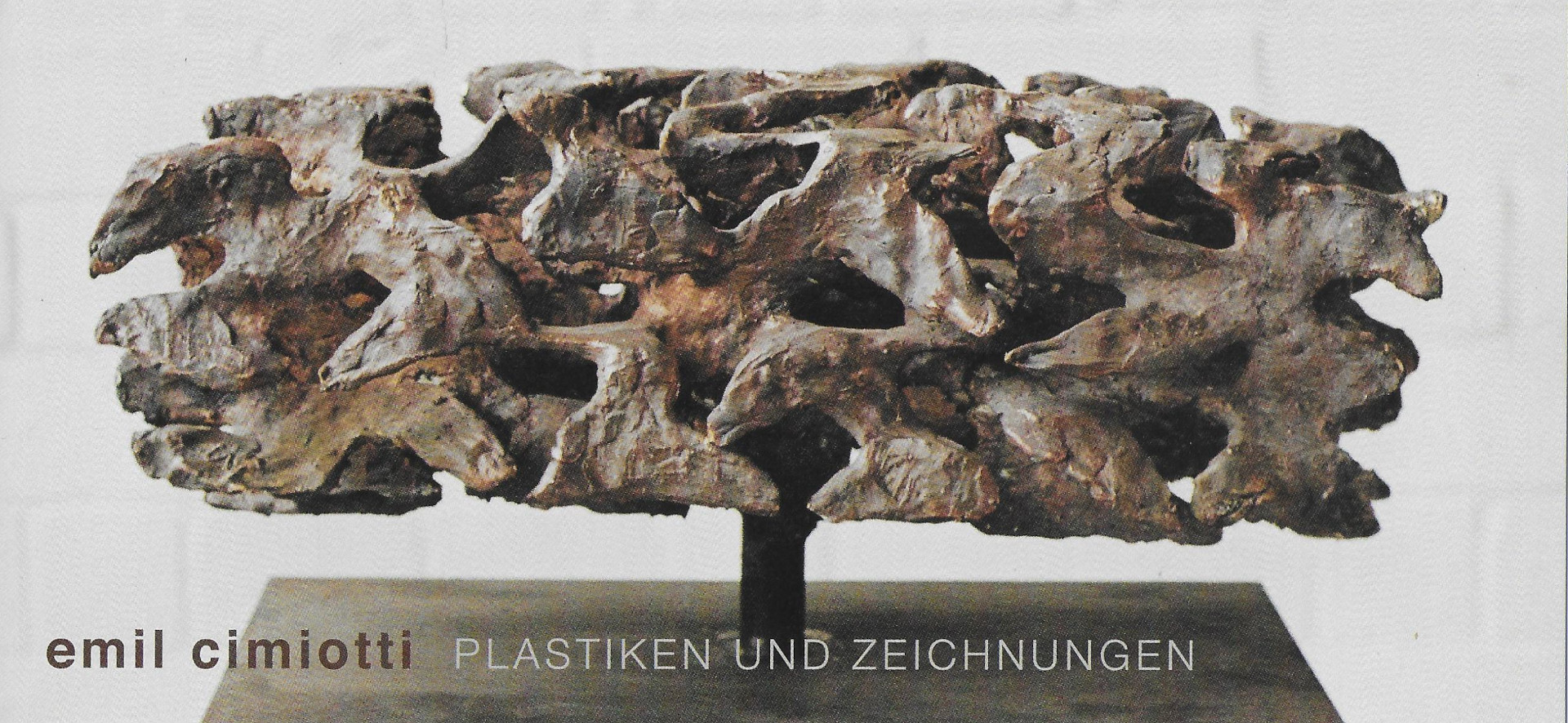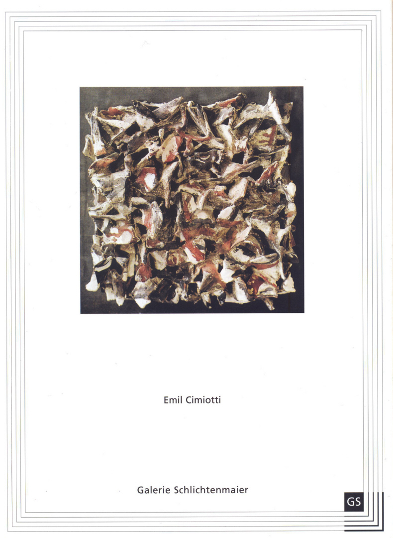 2003 * Galerie Schlichtenmaier, “Cimiotti - Plastiken und Arbeiten auf Papier”, Schloss Dätzingen / Grafenau, 23.02.-29.03.2003. - k.P. - - COVER - - FLYER - * Dasa-Galerie Dortmund, “Emil Cimiotti: Struktur-Natur”, Dortmund, 06.04.-30.06.2003. - COVER - * Galerie Art Forum, “Emil Cimiotti - Bronzen”, Hannover, 26.08.-15.10.2003. - FLYER - * Kunstverein Lübbecke im Speicher am Burgmannshof, “Emil Cimiotti - Bronzeplastiken”, Lübbecke, 07.12.2003-18.01.2004. - FLYER - * Galerie Schmücking, “Emil Cimiotti”, Braunschweig. * Galerie Hachmeister, “Separated Colours of Hachmeister”, Münster, 25.01.-15.03.2003. * galerie am klostersee, Eröffnungsausstellung “mit plastischen Arbeiten”, Lehnin, Eröffnung 30.03.2003. k.P. - FLYER - * Herzog August Bibliothek Wolfenbüttel, “Das Jahr der Bibel, Graphik jenseits der Illustration”, 01.06.-28.09.2003. - FLYER - * Galerie Art Forum, ”Stilleben / Nature morte / Still life”, Hannover, 19.10. - Ende November 2003. * Museum der Stadt Ratingen, “Gruppe 53 - Auf dem Weg zur Avantgarde”, Ratingen, 14.09.-02.11.2003. - PLAKAT - - COVER - - FLYER -