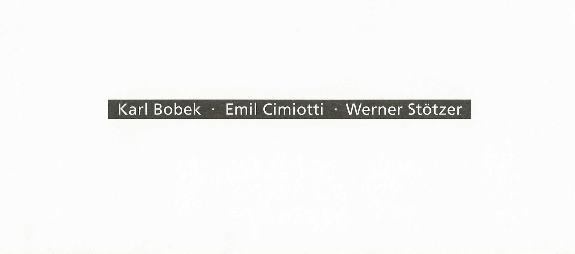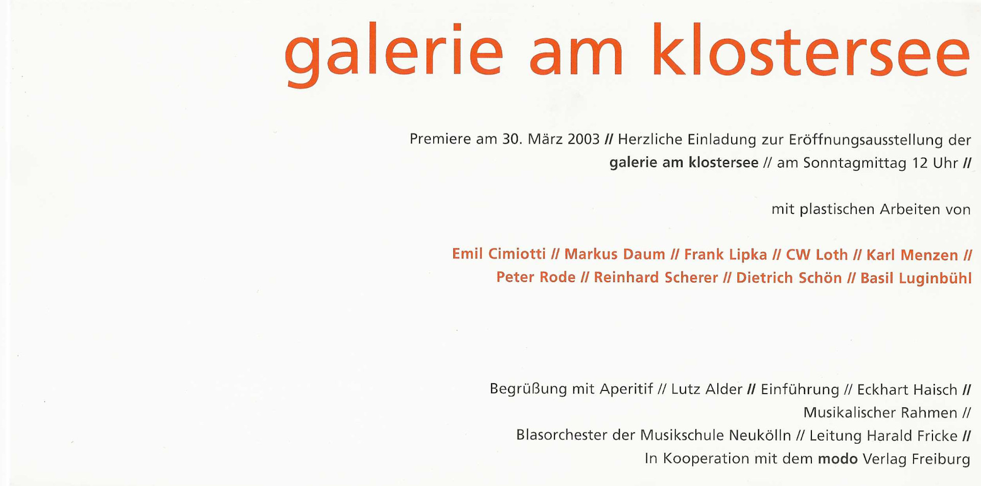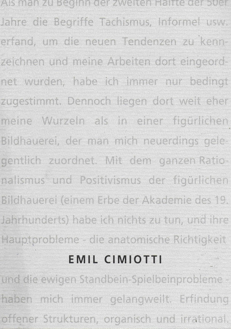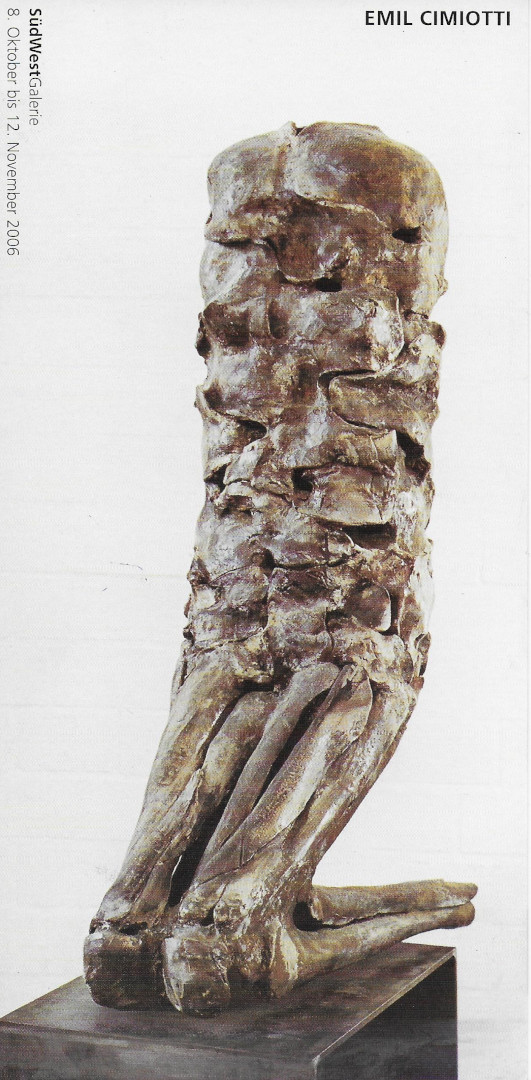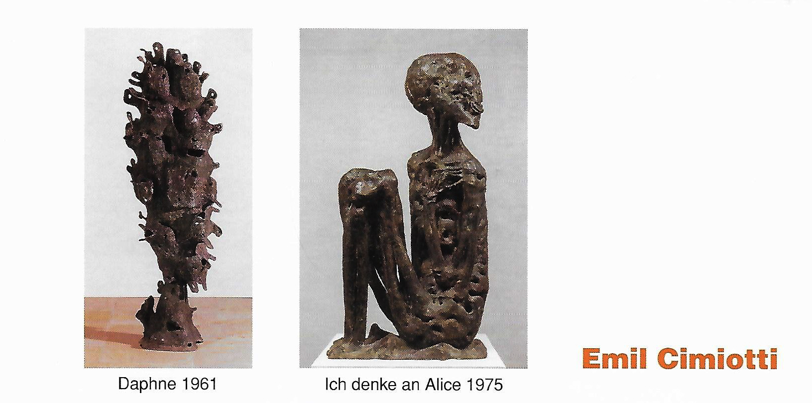 2003 * Galerie Schlichtenmaier, “Cimiotti - Plastiken und Arbeiten auf Papier”, Schloss Dätzingen / Grafenau, 23.02.-29.03.2003. - k.P. - - COVER - - FLYER - * Dasa-Galerie Dortmund, “Emil Cimiotti: Struktur-Natur”, Dortmund, 06.04.-30.06.2003. - COVER - * Galerie Art Forum, “Emil Cimiotti - Bronzen”, Hannover, 26.08.-15.10.2003. - FLYER - * Kunstverein Lübbecke im Speicher am Burgmannshof, “Emil Cimiotti - Bronzeplastiken”, Lübbecke, 07.12.2003-18.01.2004. - FLYER - * Galerie Schmücking, “Emil Cimiotti”, Braunschweig. * Galerie Hachmeister, “Separated Colours of Hachmeister”, Münster, 25.01.-15.03.2003. * galerie am klostersee, Eröffnungsausstellung “mit plastischen Arbeiten”, Lehnin, Eröffnung 30.03.2003. k.P. - FLYER - * Herzog August Bibliothek Wolfenbüttel, “Das Jahr der Bibel, Graphik jenseits der Illustration”, 01.06.-28.09.2003. - FLYER - * Galerie Art Forum, ”Stilleben / Nature morte / Still life”, Hannover, 19.10. - Ende November 2003. * Museum der Stadt Ratingen, “Gruppe 53 - Auf dem Weg zur Avantgarde”, Ratingen, 14.09.-02.11.2003. - PLAKAT - - COVER - - FLYER -