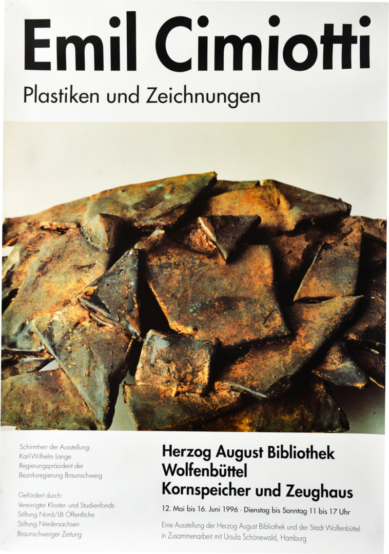 1996 * Herzog-August-Bibliothek im Kornspeicher und Zeughaus, “Emil Cimiotti: Plastiken und Zeichnungen”, Wolffenbüttel, 12.05.-16.06.1996. - PLAKAT - - COVER - * Galerie der Stadt Kornwestheim, “Emil Cimiotti: Plastiken und Zeichnungen”, Kornwestheim, 11.10.-24.11.1996. - COVER - - FLYER - * Kunsthalle Recklinghausen, “Kunst des Westens, 1945-1960”, Recklinghausen, 05.05.-14.07.1996. - COVER - * Sprengel Museum Hannover, “Zeitströmungen, Kunst der Gegenwart, aus der Sammlung der Niedersächsische Sparkassen-Stiftung”, Hannover, 22.05.-07.07.1996. - COVER - * Galerie Schlichtenmaier, “Aus tausend grünen Spiegeln. Pflanzen und Blumen in der Kunst des 20. Jahrhunderts”, Grafenau, 07.07.-07.09.1996. - COVER - * Städtische Museen Heilbronn, “Plätze und Platzzeichen”, Heilbronn. - COVER - - FLYER -