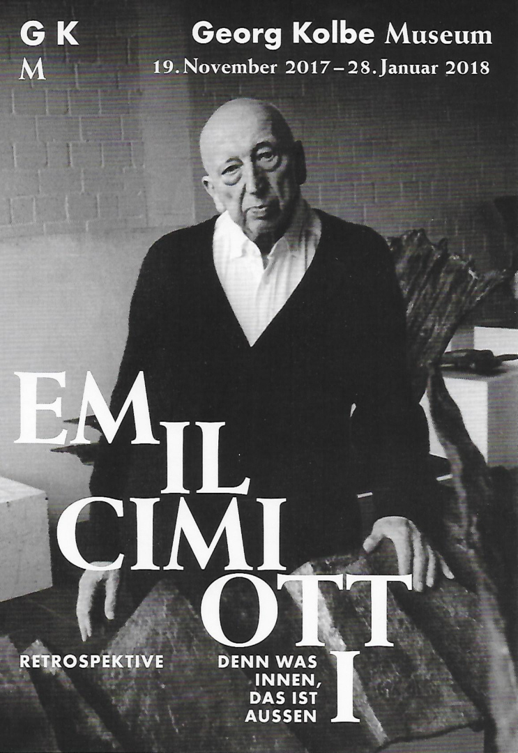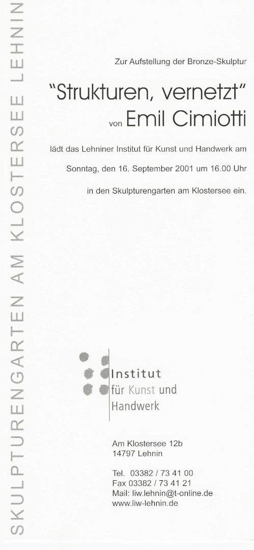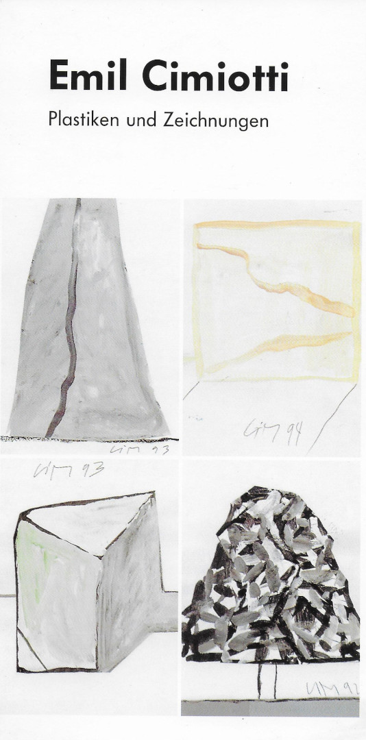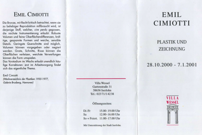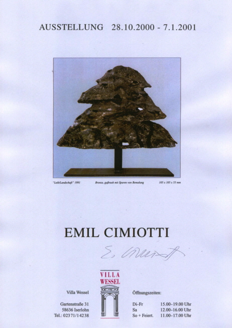 2001 * Richard Haizmann Museum, “Emil Cimiotti - Plastik und Zeichnung”, Niebüll, 18.05.-08.07.2001. - PLAKAT - - COVER - - FLYER - * Skulpturenpark Lehnin, Skulpturengarten am Klostersee, “Emil Cimiotti: Strukturen, vernetzt”, Lehnin/Brandenburg. Eröffnung 16.09.2001. k.P. - FLYER - * Kunstsammlungen Chemnitz, “Kabinett der Zeichnung”, Chemnitz, 18.02.-08.04.2001. - COVER - - FLYER - * Städtischen Museum Braunschweig, “Vier Jahrzehnte Galerie Schmücking, Editionen - Grafik, Mappen, Werkverzeichnisse”, Braunschweig, 04.03.-22.04.2001. - COVER - * Württembergischer Kunstverein Stuttgart, “Kabinett der Zeichnung”, Stuttgart, 01.04.-17.06.2001. - COVER - - FLYER - * SüdWestGalerie, “Künstler der Galerie”, Niederalfingen.