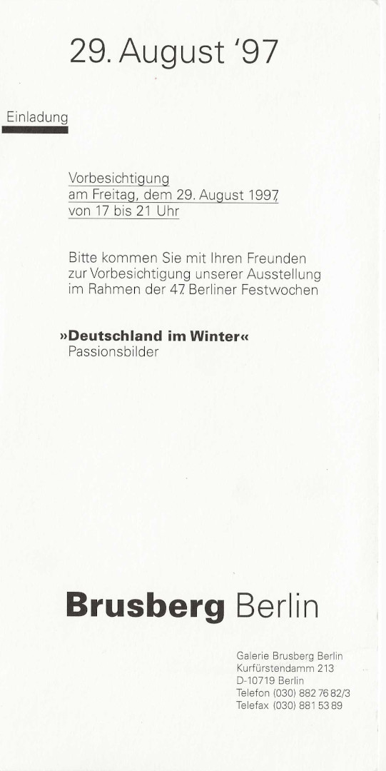 1997 Emil Cimiotti 70. Geburtstag (19.08.1927-13.10.2019) * Galerie Schlichtenmaier, Schloss Dätzingen, “Heute - gestern und morgen”, Grafenau, 06. Juli bis 20. September 1997. - k.P. - - COVER - - FLYER - * Galerie Brusberg Berlin, “Deutschland im Winter”, Berlin, 30.08.-22.11.1997. - COVER - - FLYER - * Bomann-Museum Celle, “Kunst Streifzüge, eine Ausstellung der Niedersächsischen Lottostiftung”, Celle, 10.10.-14.12.1997. - COVER - * Galerie Timm Gierig, “Ohne Titel - Eine Accrochage - Fünfunddreißig Künstler”, 06.12.1997-22.01.1998 - COVER -.
