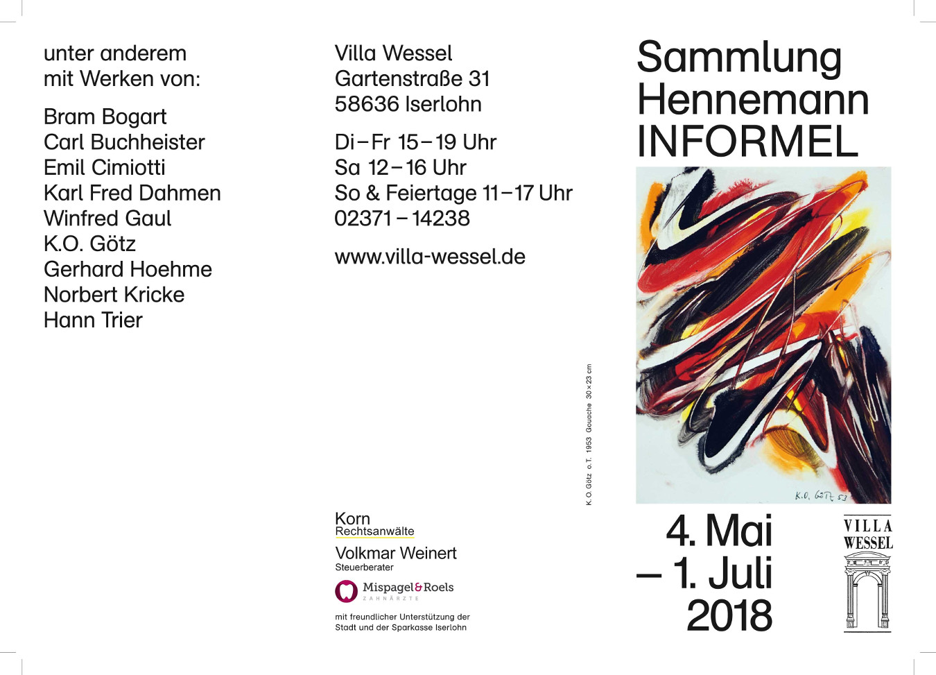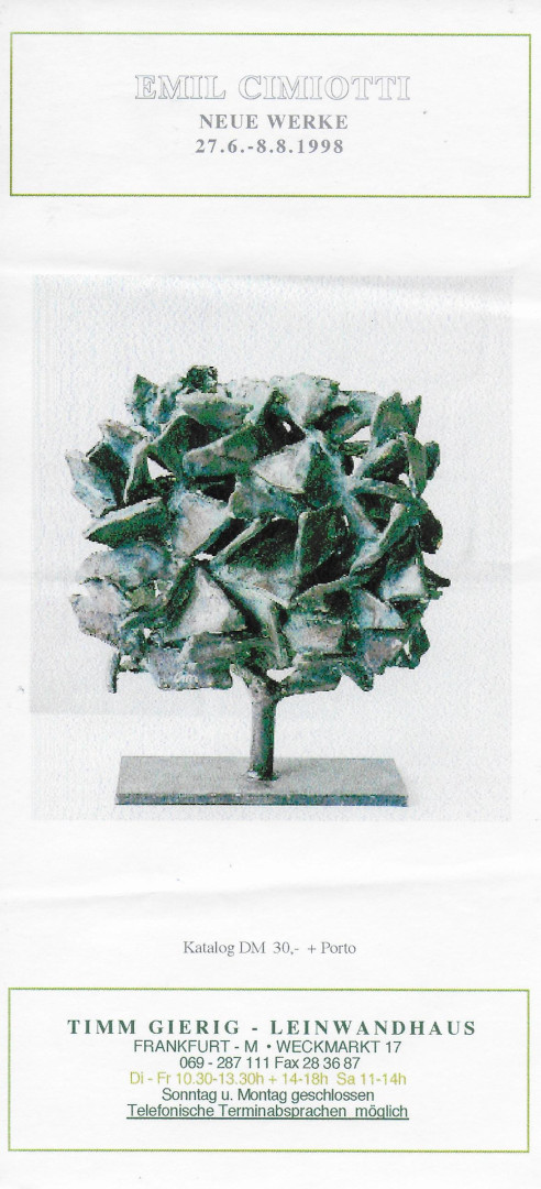 1998 * Galerie Timm Gierig, “Emil Cimiotti: Neue Werke”, Frankfurt am Main, 27.06.-08.08.1998. - COVER - - FLYER - * Kunsthalle Emden, “Kunst Streifzüge, eine Ausstellung der Niedersächsischen Lottostiftung”, Celle, 10.01.-08.02.1998. - COVER - - FLYER - * Deutsches Porzellan Museum in Hohenberg a. d. Eger /Selb, “Begegnungen - Zeitgenössische Porzellanplastik”, 14.02.-05.07.1998. - COVER - - FLYER - * Kunsthalle Bremen, “100 Meisterwerke auf Papier”, Bremen, 24.03.-10.05.1998. - FLYER - * Bomann-Museum Celle, “Deutsche Kunst der 50er Jahre”, Celle, 29.08.-08.11.1998. - COVER - * Kurpfälzisches Museum der Stadt Heidelberg / Heidelberger Kunstverein, “Brennpunkt Informel”, Heidelberg, 08.11.1998-17.01.1999. - COVER -