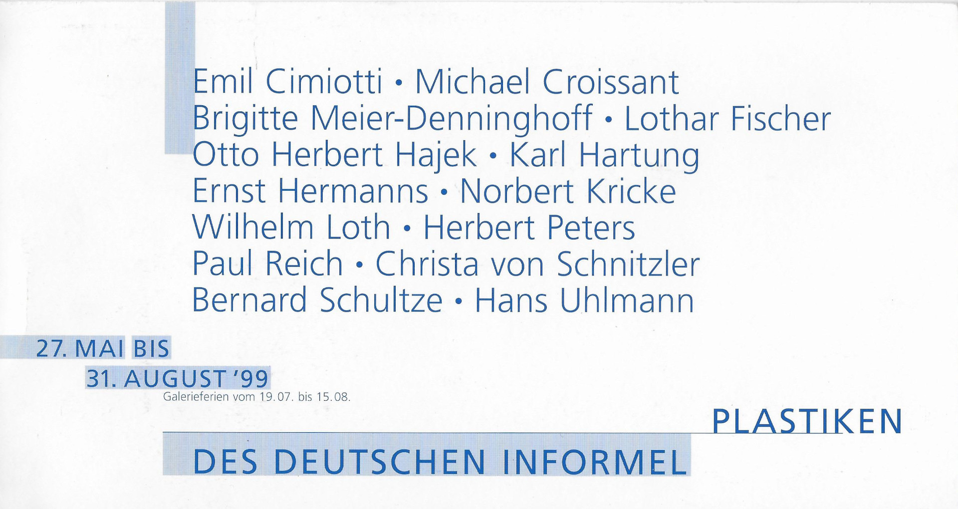 1999 * Galerie Artforum, “Emil Cimiotti: Bronzen aus den Jahren 1960 bis heute”, Hannover. * Galerie Rothe, “Plastiken des Deutschen Informel”, Frankfurt/M, 27.05.-31.08.1999. - PLAKAT- - COVER - - FLYER - . * Kreissparkasse Esslingen-Nürtingen, “Aus einer Sammlung II”, 18.10.-05.11.1999. - FLYER - * Galerie im Prediger, “Die Landschaft. Positionen einer Idylle”, Schwäbisch Gmünd. * Galerie Schlichtenmaier, “Landschaften - Stadtlandschaften”, Schloss Dätzingen / Grafenau, 27.11.1999-05.02.2000. - k.P. - - FLYER -