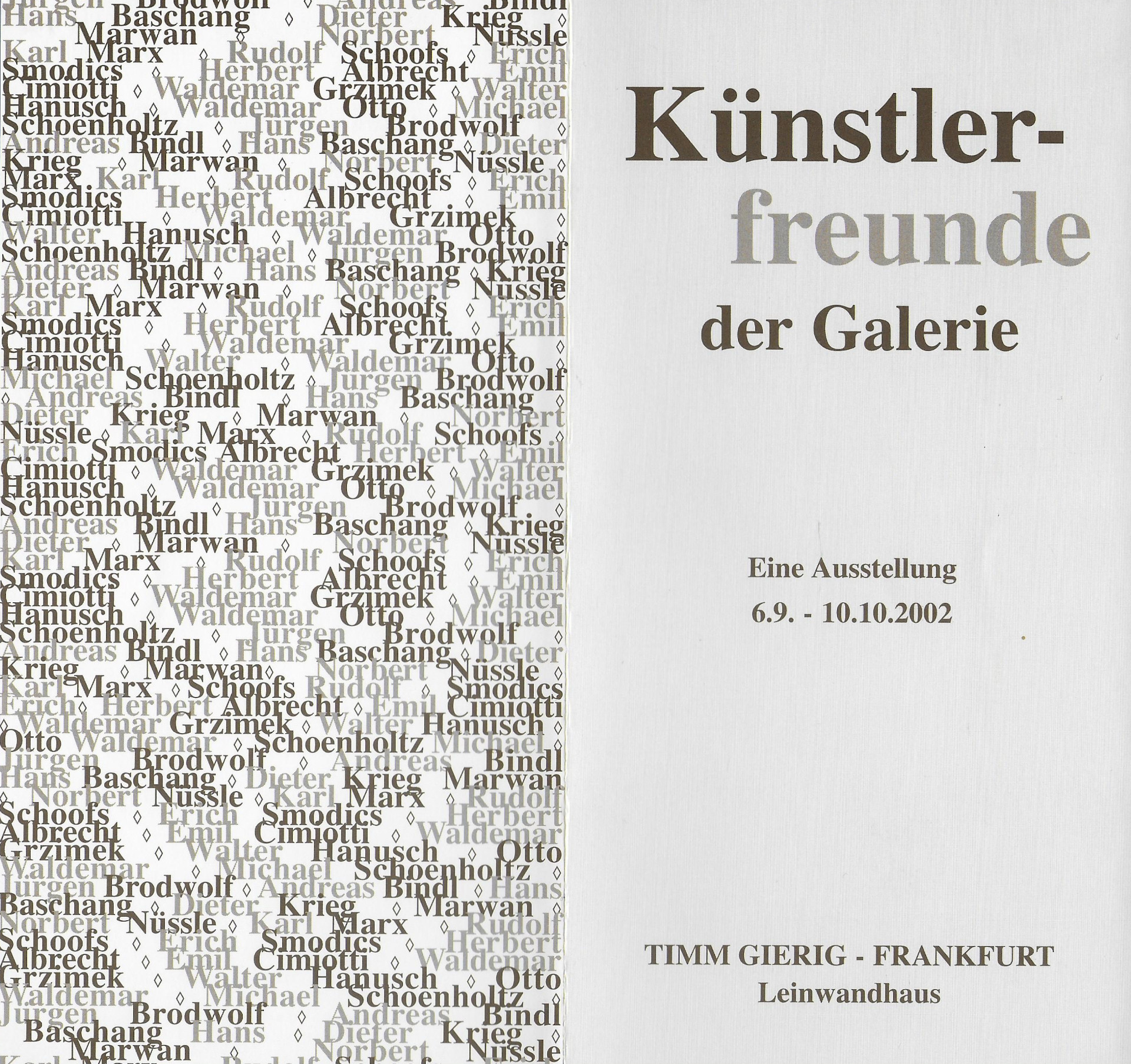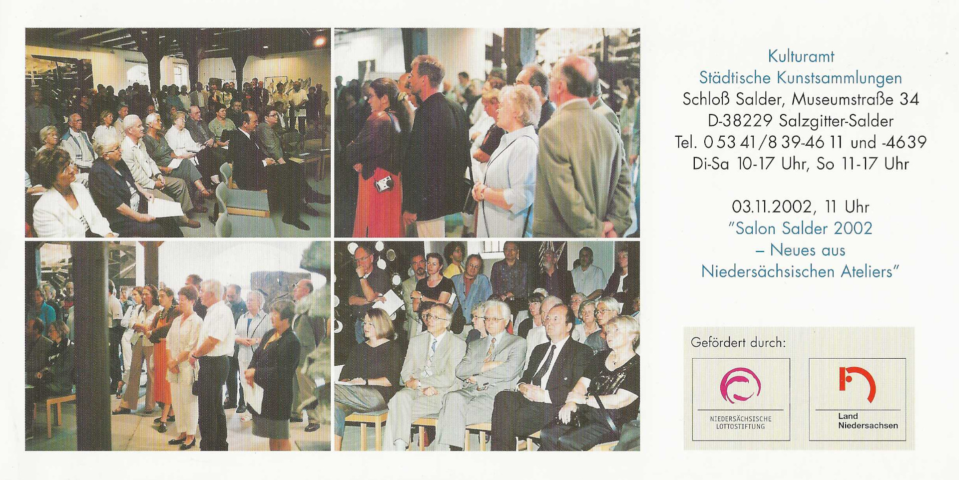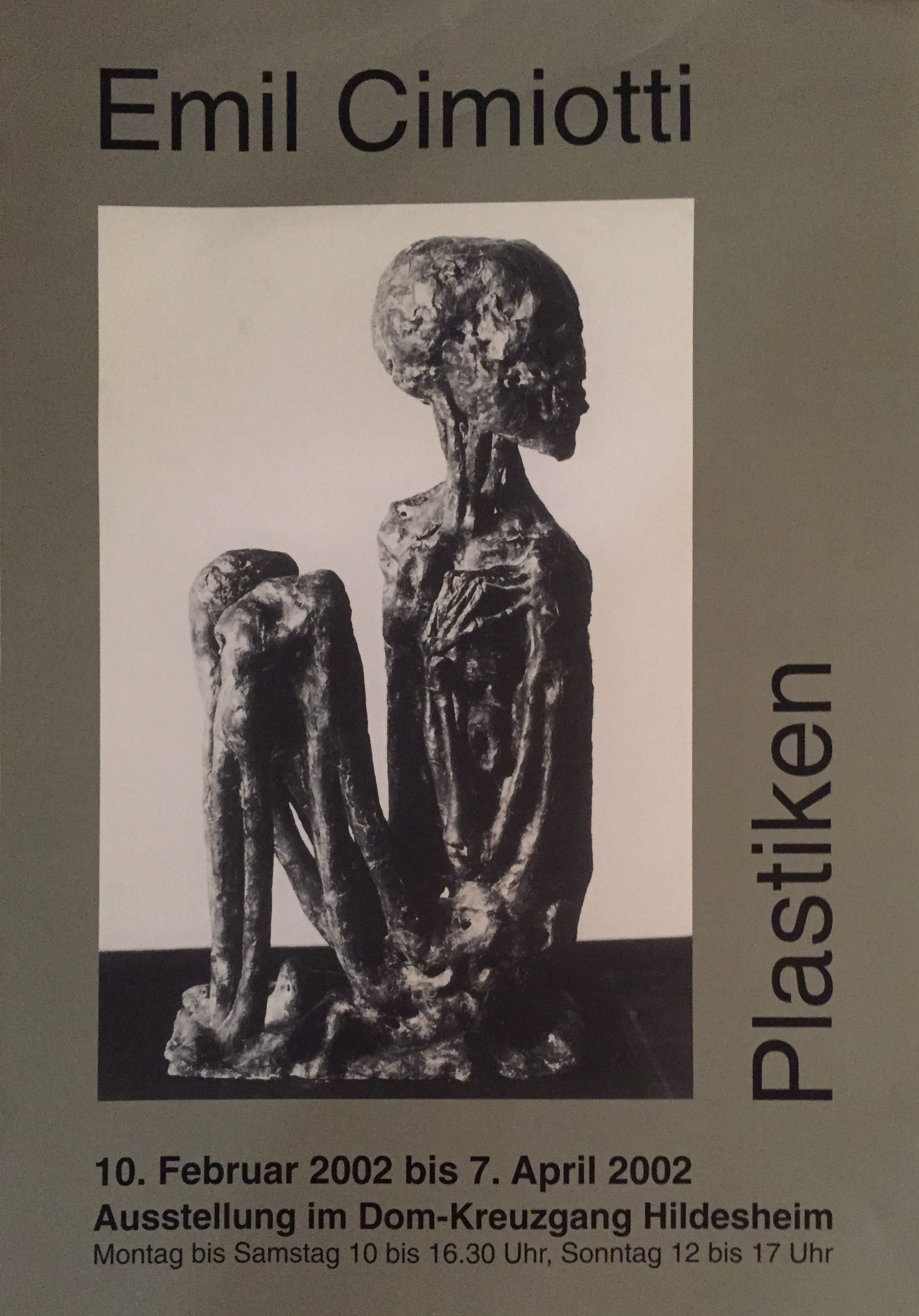 2002 * Bischöfliches Generalvikariat und Dom Hildesheim, “Emil Cimiotti - Plastiken”, Hildesheim, 10.02.-07.04.2002. - PLAKAT - - FLYER - * Galerie Schlichtenmaier, “Emil Cimiotti - Skulpturen”, Schloss Dätzingen / Grafenau, 23.02.-29.03.2002. - k.P. - * Galerie Schmücking, “Emil Cimiotti”, Braunschweig, 21.04.-17.05.2002. - FLYER - * Schloss Gottorf, “Farbe, Form, Zeichen, Sammlung Piepenbrock”, Schleswig, 14.07.-22.09.2002. - k.P. - - COVER - * Galerie Timm Gierig, Frankfurt, Leinwandhaus, “Künstlerfreunde der Galerie”, Frankfurt, 06.09.-10.10.2002. - FLYER - * Schloß Salder, “Salon Salder 2002 - Neues aus Niedersächsischen Ateliers”, Salzgitter, September 2002. - COVER - - FLYER - * Kunstverein Heidelberg, “Der Berg”, Heidelberg, 20.10.2002-19.01.2003. - COVER - * Kunsthalle Osnabrück, “Farbe, Form, Zeichen”, Osnabrück.