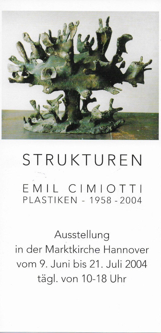 2004 * Galerie Rothe, “Emil Cimiotti & Johannes Geccelli”, Frankfurt/M., 05.02.-20.03.2004. - FLYER - * Marktkirche Hannover (Georgii et Jacobi), “Emil Cimiotti - Strukturen”, Hannover, 09.06.-21.07.2004. - COVER - - FLYER - * SüdWestGalerie, “Signal SüdWest”, Niederalfingen. 16.10.-28.11.2004. - FLYER - * Galerie Schlichtenmaier, “Skulptur im Schloss”, Schloss Dätzingen / Grafenau, 14.11.2004-08.01.2005. - k.P. - - COVER -
