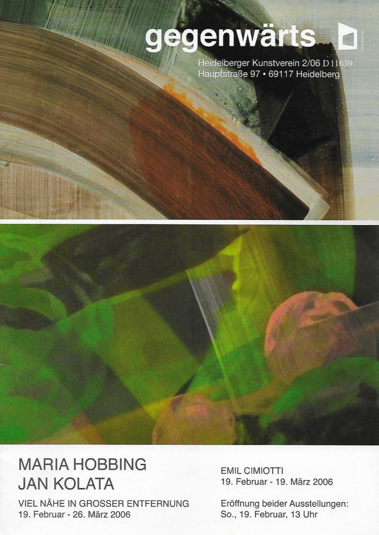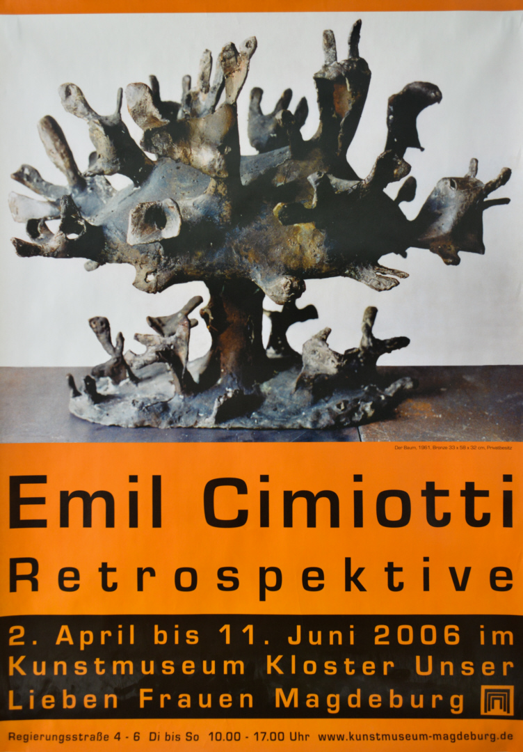 2006 * Galerie Brusberg, “Cimiotti - Tápies”: Der Berg und seine Wolken - ein Dialog. Bronzen, Bilder und Blätter, Berlin, 04.02.-06.05.2006. - FLYER - * Galerie im Geburtshaus Ernst Rietschel, “Ernst-Rietschel-Kunstpreis 2006, Preisträger Emil Cimiotti”, Pilsnitz, 05.02.-26.03.2006. - COVER - * Kunstverein Heidelberg Studio, “Emil Cimiotti”, Heidelberg, 19.02.-19.03.2006. - PLAKAT - - COVER - * Museum Kloster Unser Lieben Frauen, “Emil Cimiotti: Retrospektive”, Magdeburg, 02.04.-11.06.2006. - PLAKAT - - FLYER - * SüdWestGalerie Niederalfingen, “Emil Cimiotti”, Niederalfingen, 08.10.-12.11.2006. - FLYER - * Galerei Schlichtenmaier, “Informel - eine Weltsprache”, Schloss Dätzingen / Grafenau, 19.11.2006-17.02.2007. - k.P. - - COVER -
