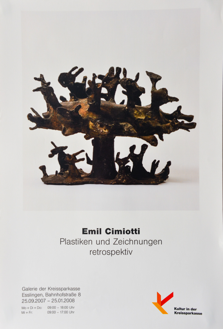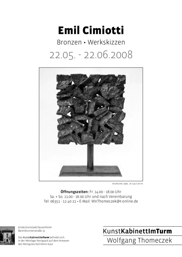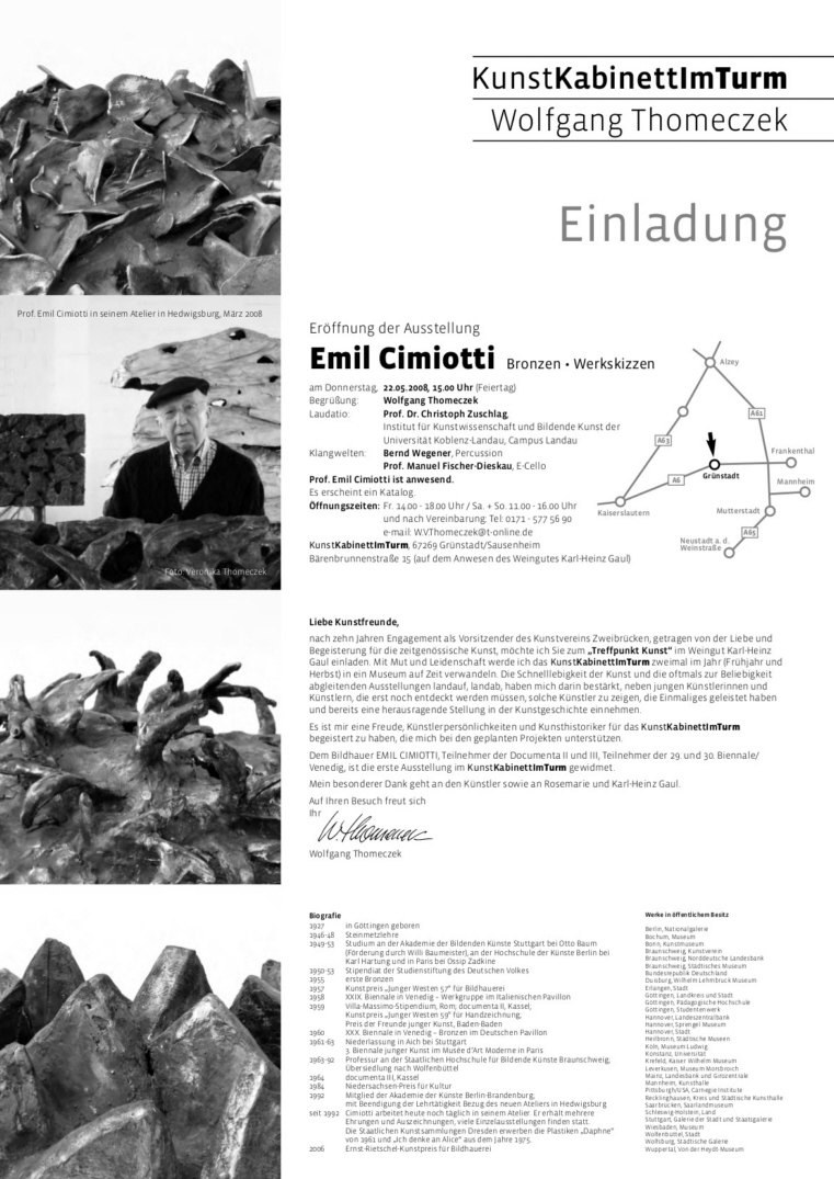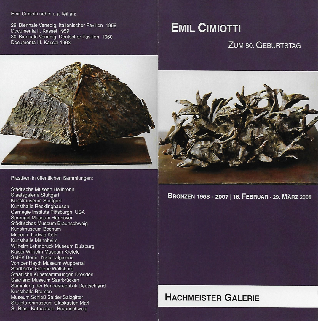 2008 * Galerie Hachmeister, “Emil Cimiotti: Zum 80. Geburtstag”, Münster, 16.02.-29.03.2008. - kP - - FLYER - * Kunstkabinett im Turm, “Emil Cimiotti - Bronzen und Werkskizzen”, Grünstadt/Sausenheim, 22.05.-22.06.2008. - PLAKAT - - FLYER - * Kunsthalle Mannheim, “Skulpturen im Blickpunkt”, Mannheim, 27.01.-01.06.2008. * Galerie Brusberg, “Zeitsprung”, Berlin, 09.02.-29.03.2008. * Albertinum Dresden / Staatl. Kunstsammlungen, “Facetten der Moderne - Das Menschenbild im Wandel / Skulptur im Zwinger”, Dresden, 13.02.2008-30.11.2008. * Galerie Schlichtenmaier, “Skulptur im Schloß II”, Schloss Dätzingen / Grafenau, 09.03.-12.04.2008. - k.P. - - COVER - * Kunstverein Reutlingen, “Inventur - Zeitgenössische Radierung in Deutschland”, Reutlingen, 01.06.-03.08.2008. - COVER - - FLYER - * Galerie Besch, “Entre Nous - Werke aus Privatbesitz”, Saarbrücken, 30.11.2008-14.01.2009. * Galerie Brusberg, “Das große Finale - 49 Jahre: 09.12.1958-08.12.2007”. * SüdWestGalerie, “Zehn”, Niederalfingen.
