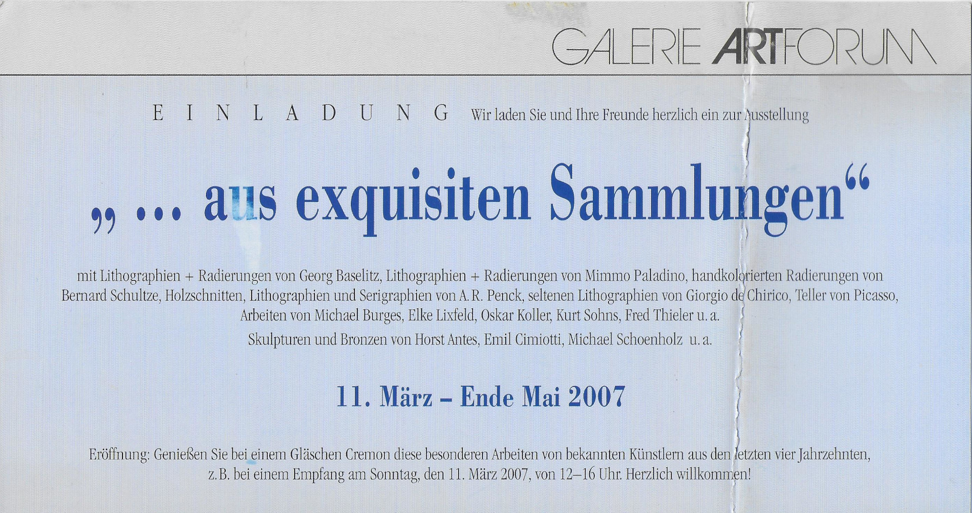 2007 Emil Cimiotti 80. Geburtstag (19.08.1927-13.10.2019) * Kunstverein Wolffenbüttel, “Emil Cimiotti - Plastiken - Werkskizzen”, Wolfenbüttel, 13.05.-01.07.2007. - FLYER - * Galerie Schlichtenmaier, “Cimiotti: Wachstum und Modulation”, Schloss Dätzingen / Grafenau, 20.07.2007-01.09.2007. - k.P. - - COVER - * Sprengel Museum Hannover, “Ein Leben für die Plastik / Emil Cimiotti zum 80. Geburtstag”, Hannover, 19.09.-18.11.2007. - kP - - FLYER - * Kreissparkasse Esslingen, “Emil Cimiotti - Plastiken und Zeichnungen, retrospektiv”, Esslingen/Nürtingen, 25.09.2007-25.01.2008. - PLAKAT - - FLYER - * Galerie Schlichtenmaier, “Dialoge-Kunstwerke in Kommunikation”, Schloss Dätzingen / Grafenau, 04.03.-14.04.2007. - k.P. - - COVER - * Galerie ART Forum, “... aus exquisiten Sammlungen”, 11.03. - Ende Mai 2007. - FLYER - * Berlinisches Landesmuseum für moderne Kunst (Galerie), “Privatsammlung Piepenbrock - Einblicke”, Berlin, 30.03.-27.08.2007. - COVER - * Galerie Schlichtenmaier, “Emil Cimiotti und Christoph M. Gais”, Stuttgart, 20.07.-01.09.2007. * Galerie Schlichtenmaier, “Klassische Positionen”, Schloss Dätzingen / Grafenau, 30.11.2007-19.01.2008. - k.P. - - COVER - * Galerie Brusberg Berlin, “Das große Finale - 49 Jahre - Weggefährten”, Berlin, 08.12.2007-29.03.2008. - FLYER -