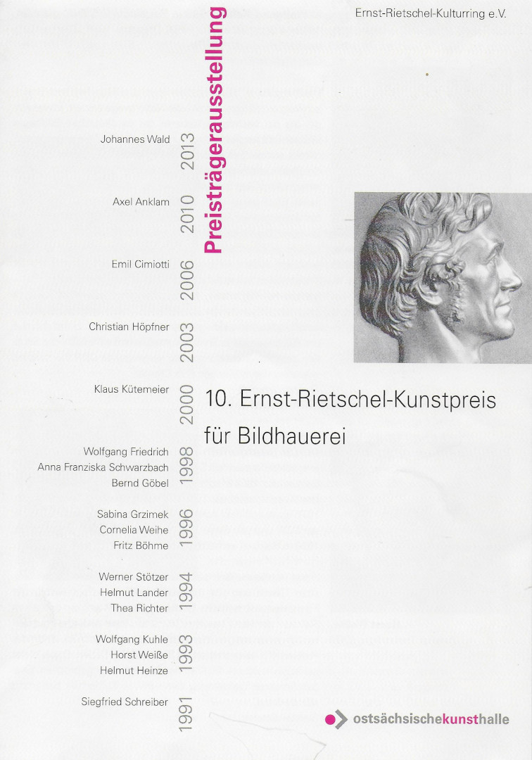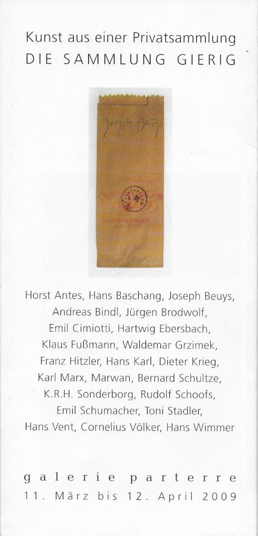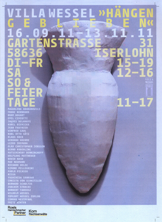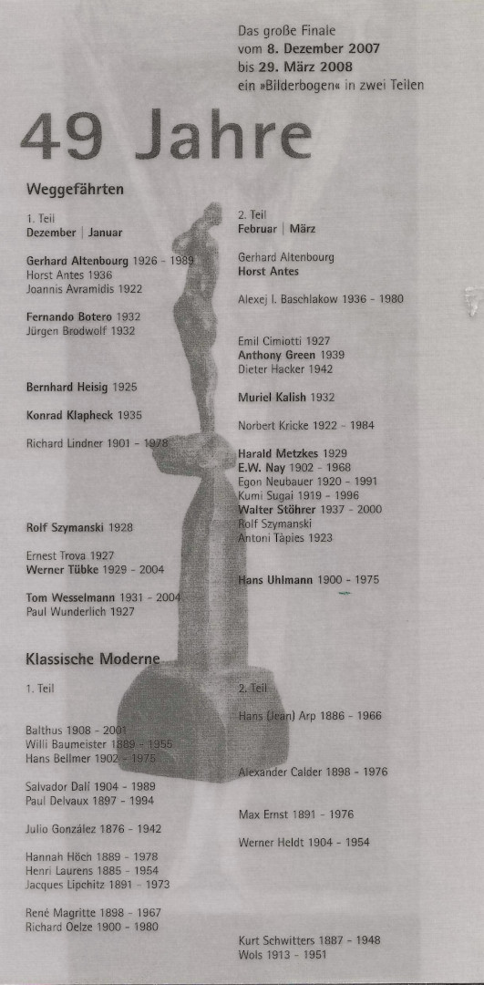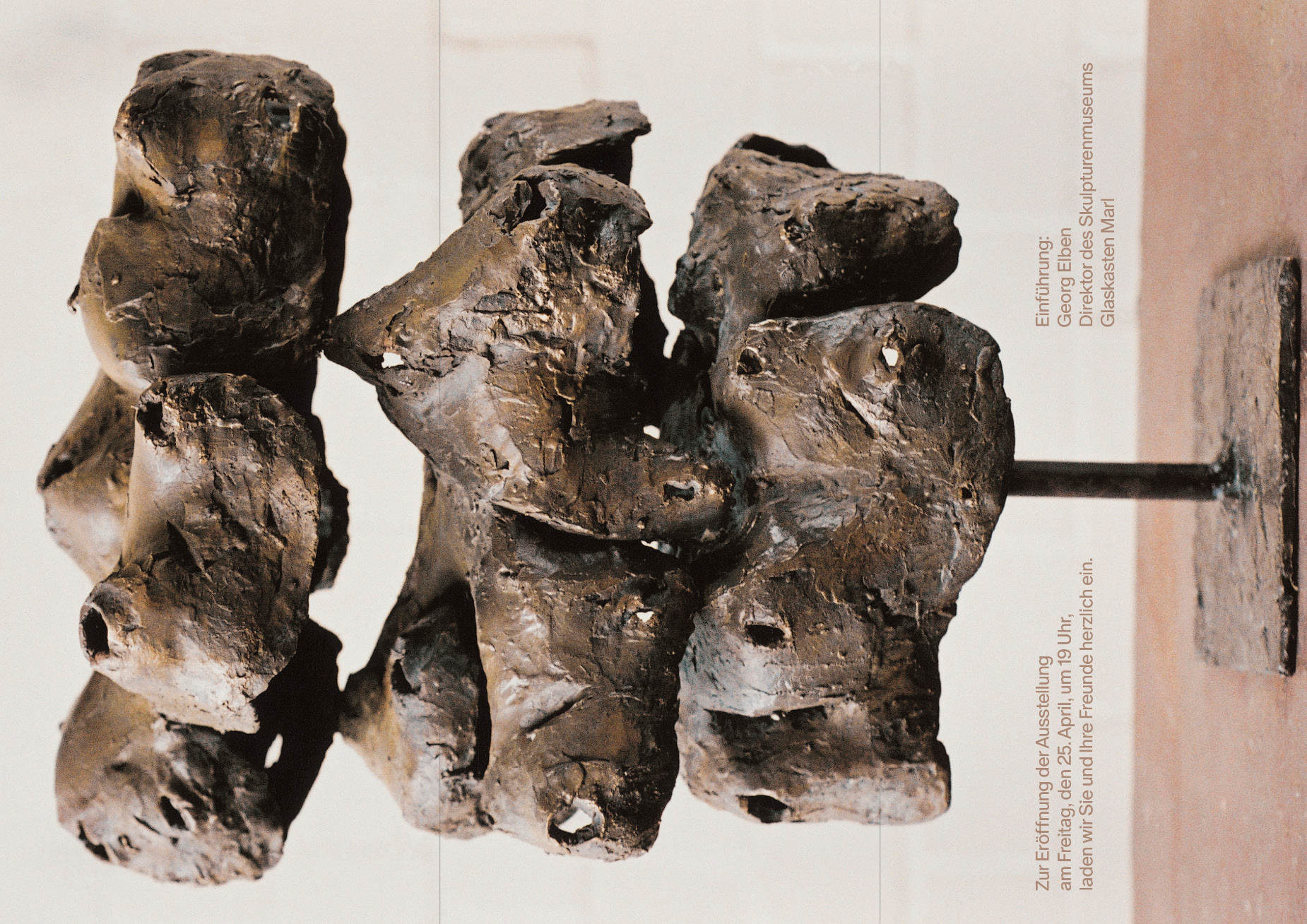 1995 * Kutscherhaus Recklinghausen, Kunstverein Recklinghausen e.V., “DIN A4 (Zeichnungen)”, Recklinghausen, 26.03.-23.04.1995. - COVER - * Galerie Timm Gierig, “30 Jahre Kunsthandel, Galerie und Verlag”, Frankfurt, 13.05.-07.06.1995. * Kulturverein der Stadt Garbsen e.V., “Kulturtage Garbsen 1995, Kleinplastik in Norddeutschland”, Garbsen, 28.05.-18.06.1995. - FLYER - * Kunsthalle der Bundesrepublik Deutschland, “Kunst in Deutschland - Sammlung des Bundes”, Bonn, 13.07.-08.10.1995. - COVER - * Kunstverein Augsburg, Toskanische Säulenhalle im Zeughaus Augsburg, “Bildhauer `95 in Deutschland”, Augsburg, 16.07.-10.09.1995. - COVER - - FLYER - * Wilhelm Lehmbruck Museum Duisburg, “Europäische Plastik des Informel 1945-1965”, Duisburg. 10.09.-12.11.1995. - COVER - - FLYER - * Deutsches Hygiene-Museum Dresden, “HERZ. Das menschliche Herz * Der herzliche Mensch”, Dresden, 06.10.1995-17.03.1996 - COVER - - FLYER 1 - - FLYER 2 - * Museum Pachen, Stadt Rockenhausen, “Deutsche Kunst des 20. Jahrhunderts”, Rockenhausen, 02.12.1995 Vernissage. - FLYER - * Staatliche Kunsthalle Karlsruhe, “Impuls Südwest”, Karlsruhe, 16.12.1995-25.02.1996. - COVER -