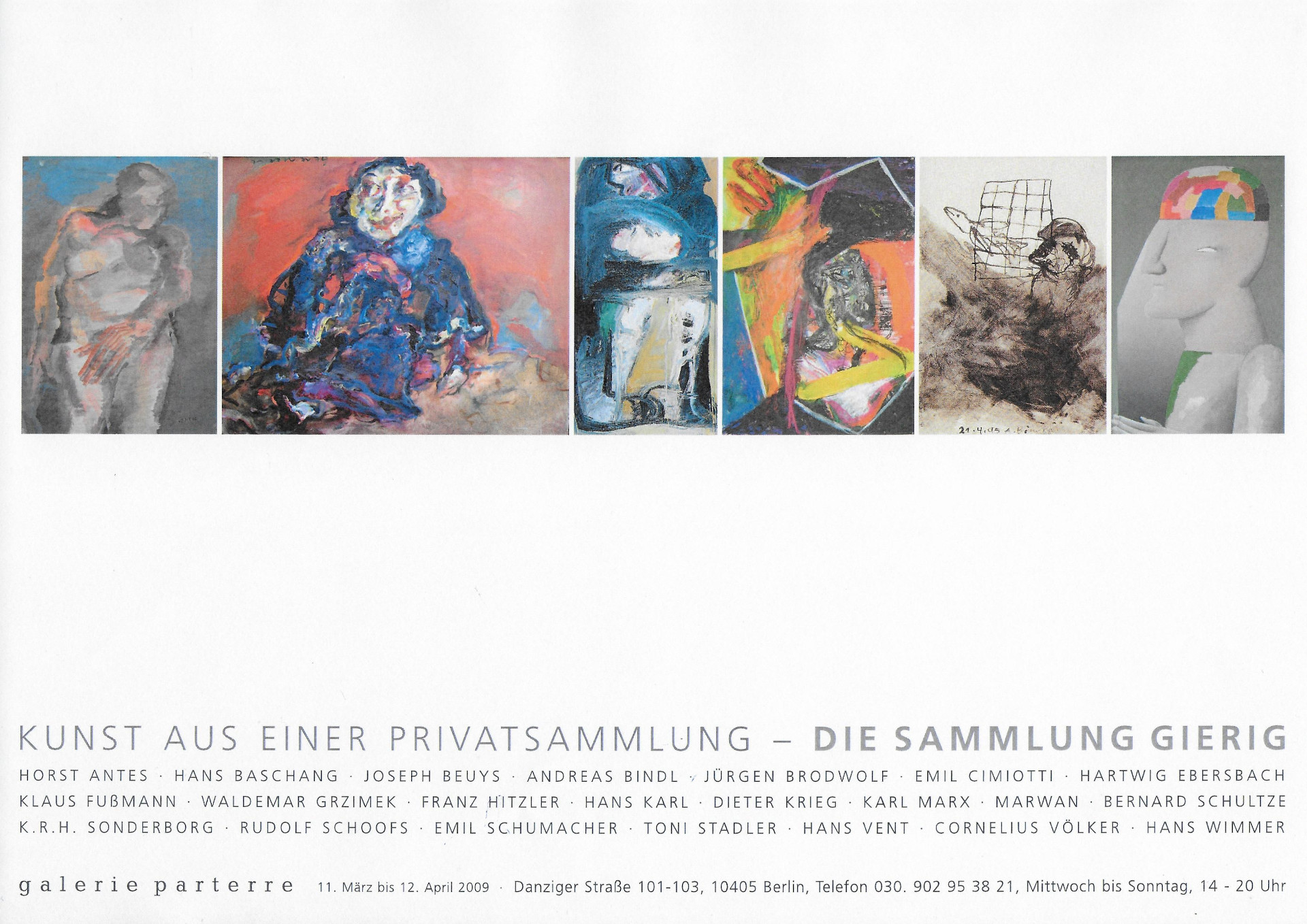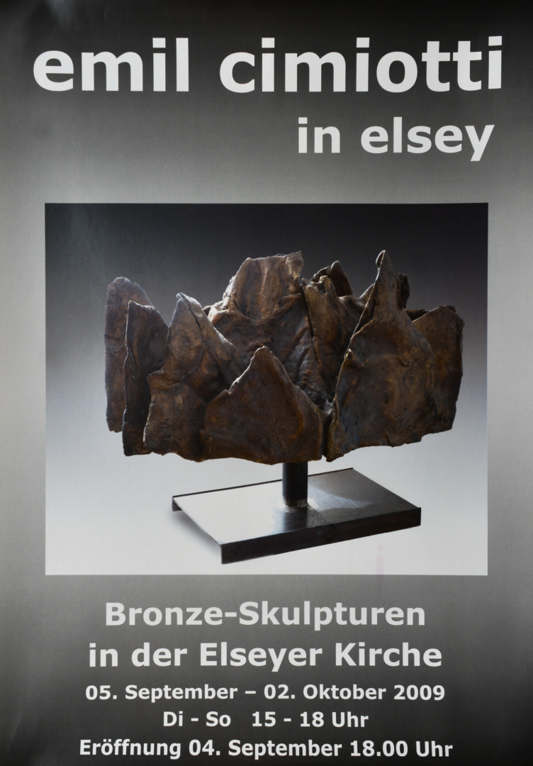 2009 * Elseyer Kirche, “Emil Cimiotti: Bronze-Skulpturen”, Hagen-Elsey, 05.09.-02.10.2009. - PLAKAT - * Galerie am Klostersee, “Emil Cimiotti: Plastiken”, Lehnin, 28.06.-31.08.2009. k.P. - FLYER - * Galerie Schlichtenmaier, “Informel-Künstler der Galerie”, Schloss Dätzingen / Grafenau, 29.01.-14.03.2009. - k.P. - - COVER - * Staatsgalerie Stuttgart, “Deutsches Informel - Zeichnungen und Druckgraphik”, Stuttgart, 21.02.-01.06.2009. * Galerie Parterre Berlin, “Kunst aus einer Privatsammlung - Die Sammlung Gierig”, Berlin, 11.03.-12.04.2009. - COVER - - FLYER - * Akademie der Künste Berlin, “aus / gezeichnet / zeichnen”, Berlin, 25.04.-14.06.2009. - COVER - - FLYER 1 - - FLYER 2 - * Galerie Schlichtenmaier, “40 Jahre * 40 Künstler”, Stuttgart, 18.07.-12.09.2009. - COVER - * Gerhard-Marcks-Haus, “Daphne: Mythos und Metamorphose”, Bremen, 22.11.2009-21.02.2010. - COVER - * Galerie Schlichtenmaier, “Dialoge II - Kleinplastiken, Bilder und Zeichnungen”, Schloss Dätzingen / Grafenau, 06.12.2009-20.02.2010. - k.P. - - COVER -
