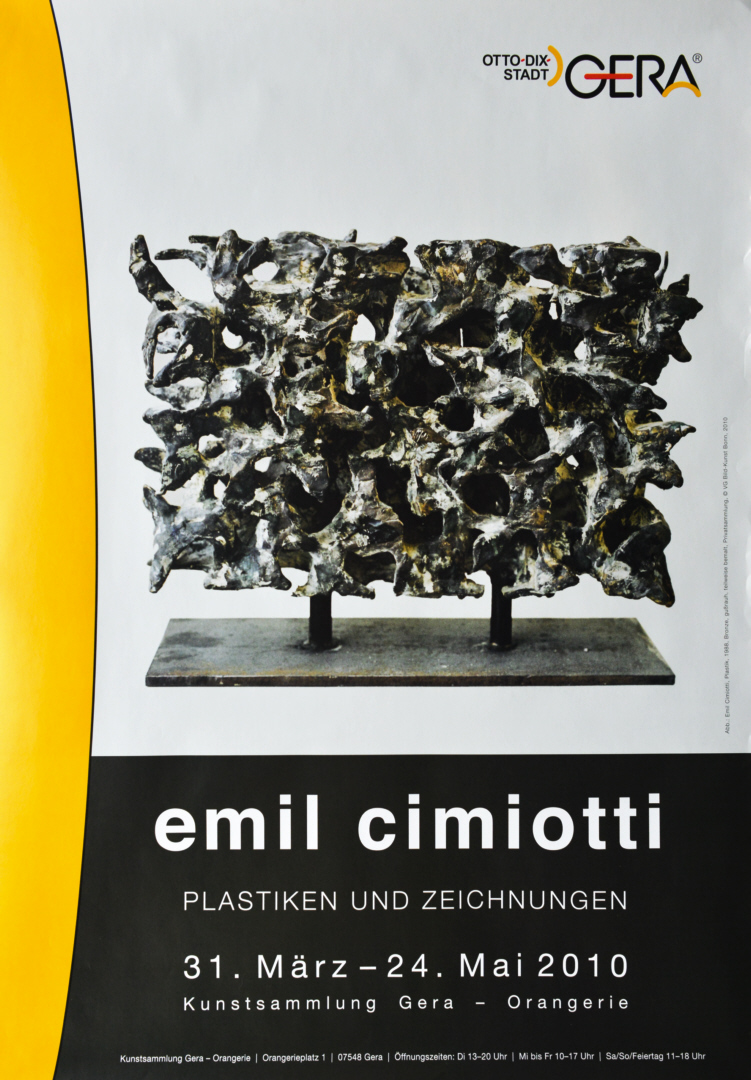 2010 * Kunstsammlungen Gera in der Orangerie, “Emil Cimiotti: Plastiken und Zeichnungen”, Gera, 31.03.-24.05.2010. - PLAKAT - - FLYER - - FLYER 2 - * Kunstmuseum Bochum, “Le Réve Traum - Motiv und Metapher / 50 Jahre Kunstsammlung Bochum”, Bochum, 31.01.-11.04.2010. - COVER - * Akademie der Künste Berlin im Käthe Kollwitz Museum Köln, “aus / gezeichnet / zeichnen”, Köln, 12.03.-09.05.2010. - COVER - * Galerie Schlichtenmaier, “Informel-Pioniere und Grenzgänger”, Stuttgart, 07.05.-03.07.2010. - COVER - * Galerie Marianne Hennemann, Königswinter, “Informel”, Bonn, 01.09.-31.10.2010. - k.P. - * Märkisches Museum Witten, “Entfesselung der Form-Plastik und Skulptur des Informel”, Witten, 19.09.-05.12.2010. - COVER - - FLYER - * Kunsthandel Marion Grcic-Ziersch, “Bildhauer-Zeichnungen”, München, 28.09.-27.11.2010. * Neues Albertinum Dresden / Staatl. Kunstsammlungen, “Von der Romantik bis zur Gegenwart”, Dresden, seit Mai 2010 in der Dauerausstellung. - COVER -
