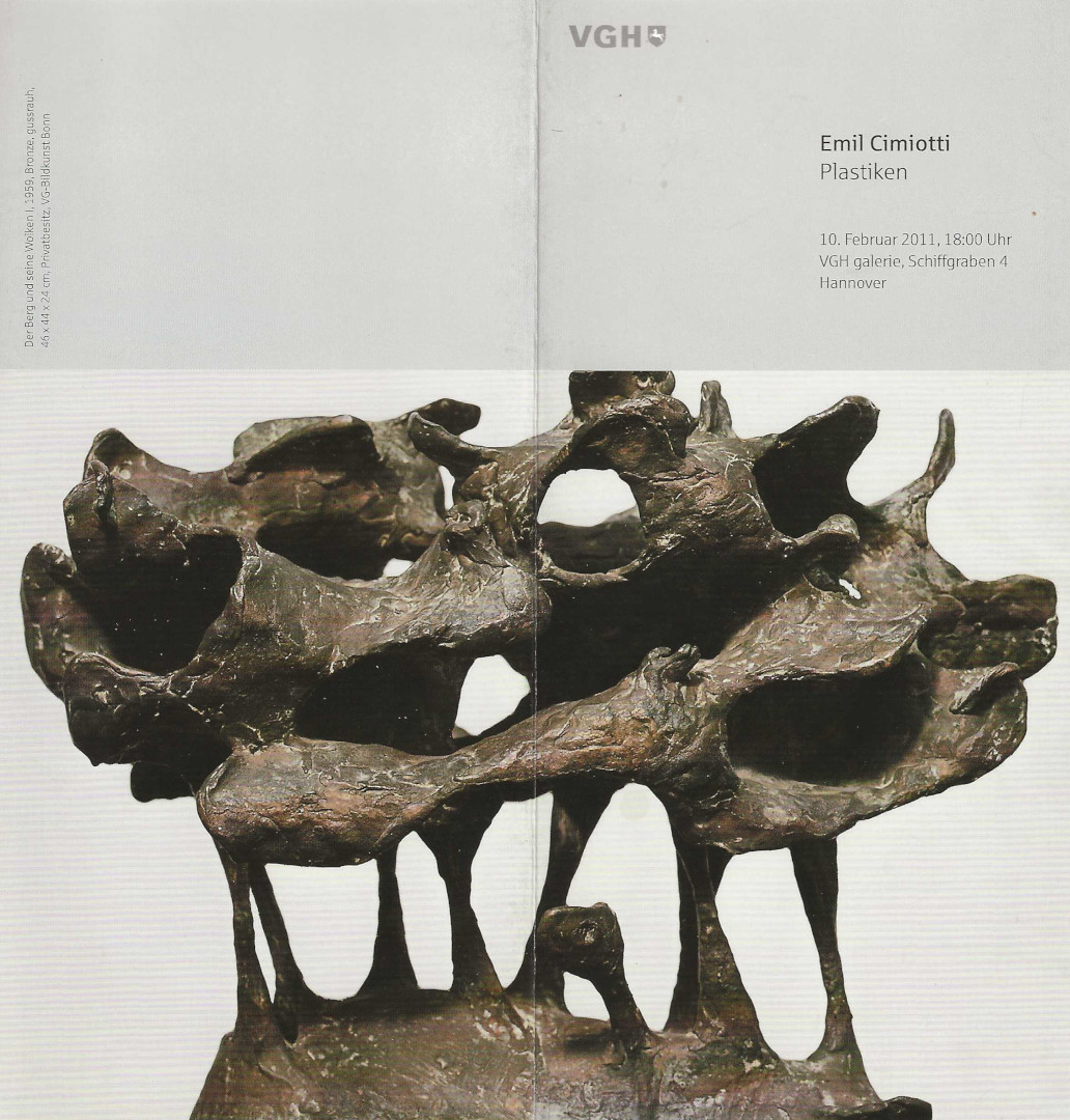 2011 * VGH Galerie Hannover, “Emil Cimiotti: Plastiken”, Hannover, 10.02.-30.04.2011. - COVER - - FLYER - * SüdWestGalerie Niederalfingen, “Emil Cimiotti”, Niederalfingen, 16.10.-13.11.2011. - FLYER - * Galerie Stiftung S BC-pro art, Kreissparkasse, “beflügelt. Zum Motiv des Vogels in der Kunst des 20. und 21. Jahrhunderts”, Biberach, 23.09.-18.11.2011. - COVER - * Städtische Galerie Wolfsburg, “760914 cm² Druck / 50 Jahre Druckwerkstadt im Schloß Wolfsburg”, Wolfsburg, 09.10.2011-31.03.2012. - PLAKAT - - FLYER - * Villa Wessel, “Hängengeblieben - 20 Jahre Villa Wessel”, Iserlohn, 17.09.-13.11.2011. - PLAKAT - * Galerie Schlichtenmaier, “Heute zwischen Gestern und Morgen”, Schloss Dätzingen / Grafenau, 10.07.-17.09.2011. - k.P. - - COVER - * Galerie Schlichtenmaier, “Kunst der 1970er und 1980er Jahre aus Privatsammlungen”, Schloss Dätzingen / Grafenau, 05.11.2011-18.02.2012. - k.P. - - COVER -