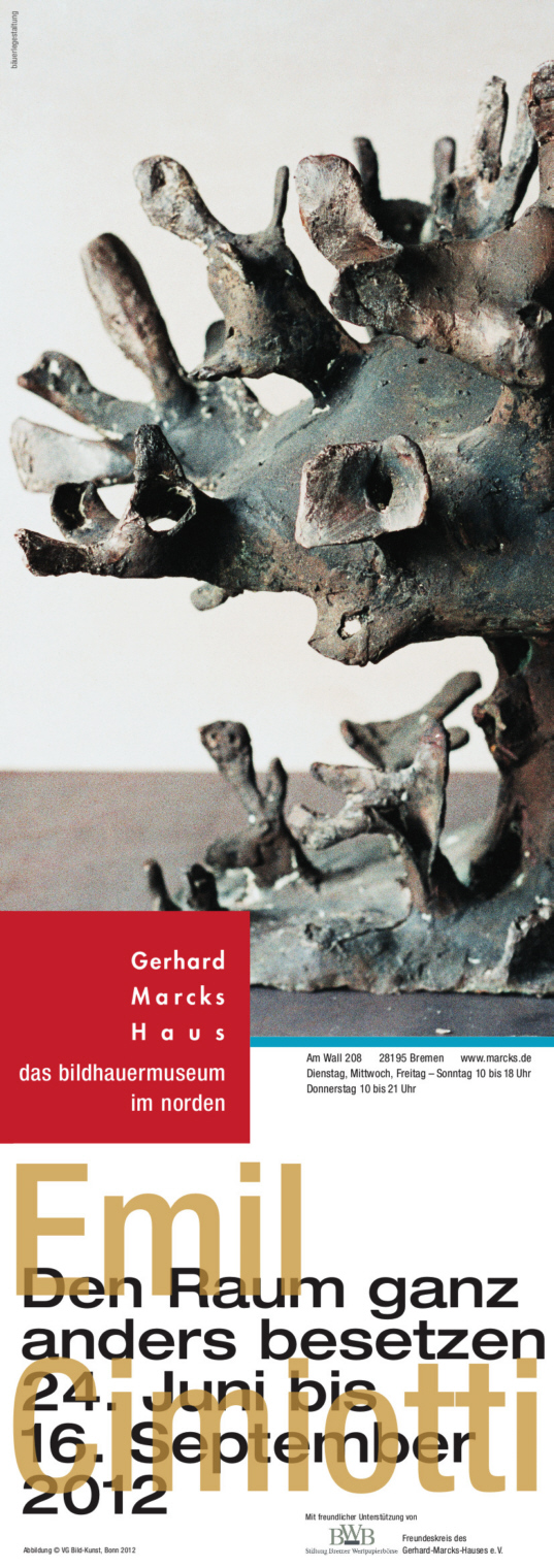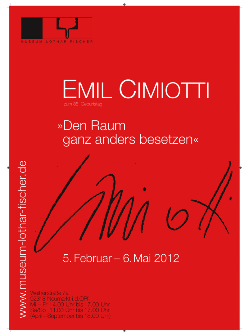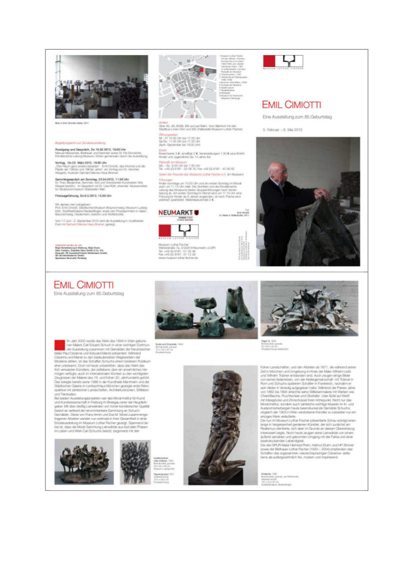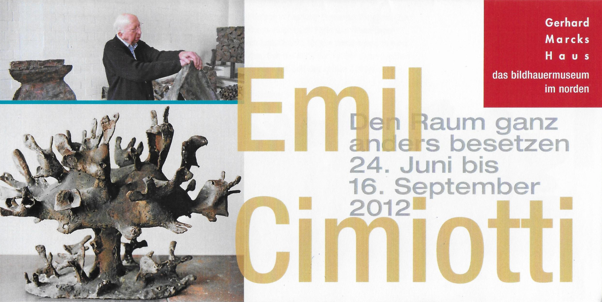 2012 * Museum Lothar Fischer, “Emil Cimiotti: Den Raum ganz anders besetzen”, Neumarkt i.d. OPf, 05.02.-06.05.2012. - PLAKAT - - COVER - - FLYER - * Galerie Maulberger und Becker, “K.O. Goetz - Emil Cimiotti”, Düsseldorf, 29.03.-21.04.2012. - FLYER - * Galerie Ohse, “Emil Cimiotti: Wege zur Vollendung”, Bremen, 22.06.-04.08.2012. - k.P. - - COVER - * Gerhard-Marcks-Haus Bremen, “Emil Cimiotti: Den Raum ganz anders besetzen”, Bremen, 24.06.-16.09.2012. - PLAKAT - - COVER - - FLYER - * Kunsthalle Florian Sundheimer, “Bildhauerzeichnungen”, München, 15.06.-14.07.2012 * Galerie Schlichtenmaier, “Erlesene-Werke aus privaten Sammlungen”, Schloss Dätzingen / Grafenau, 13.09.-27.10.2012. - k.P. - - COVER - * “Neue Kunst in Alten Gärten e.V.”, Gehrden-Lenthe. 02.09.-07.10.2012. - k.P. - - COVER - - FLYER -