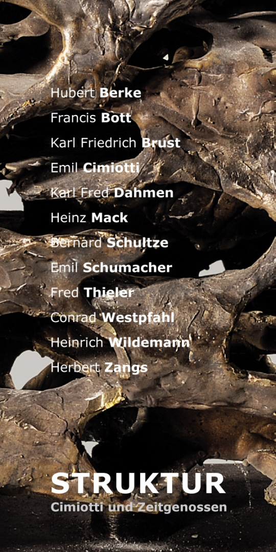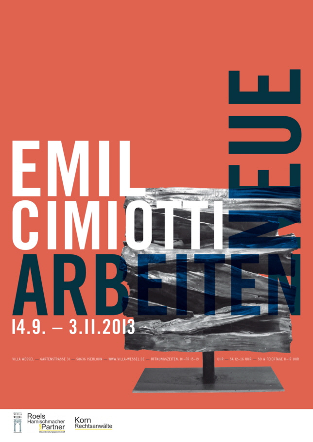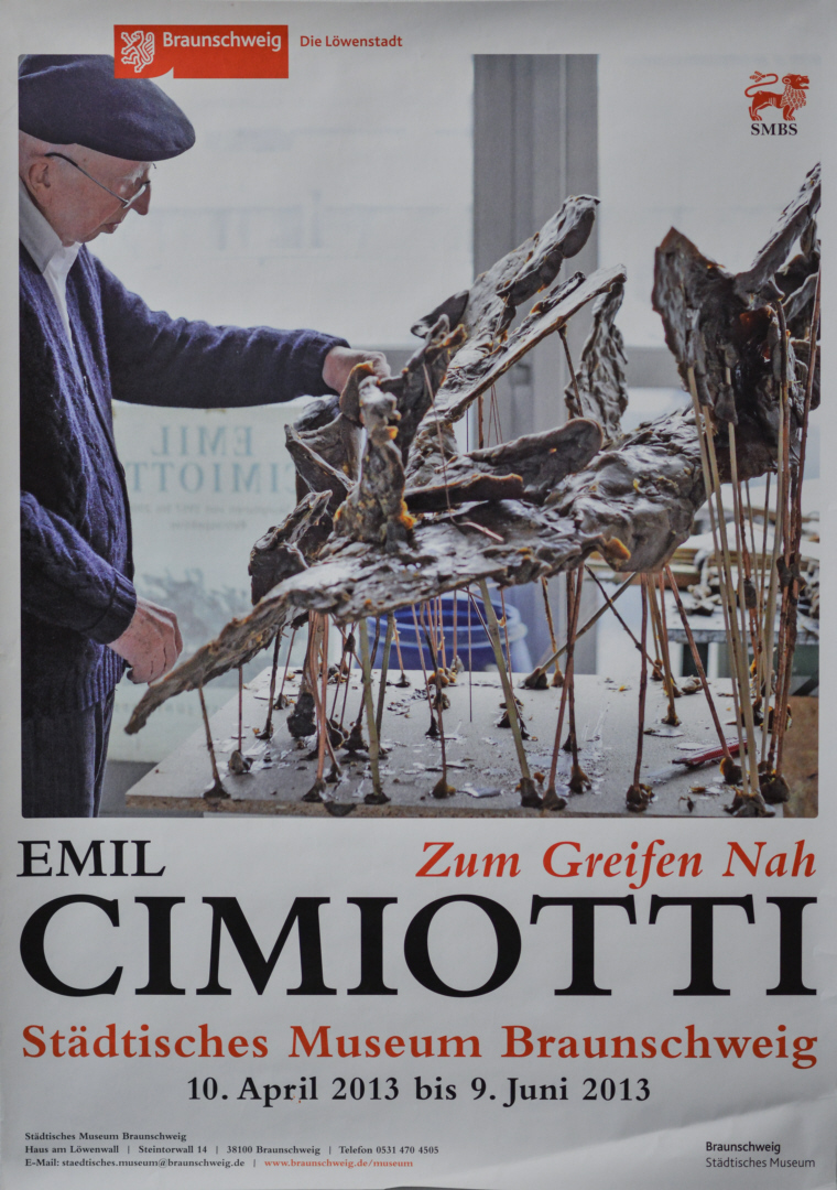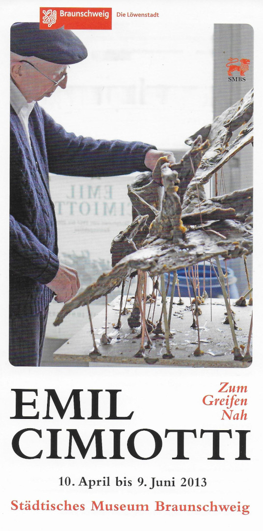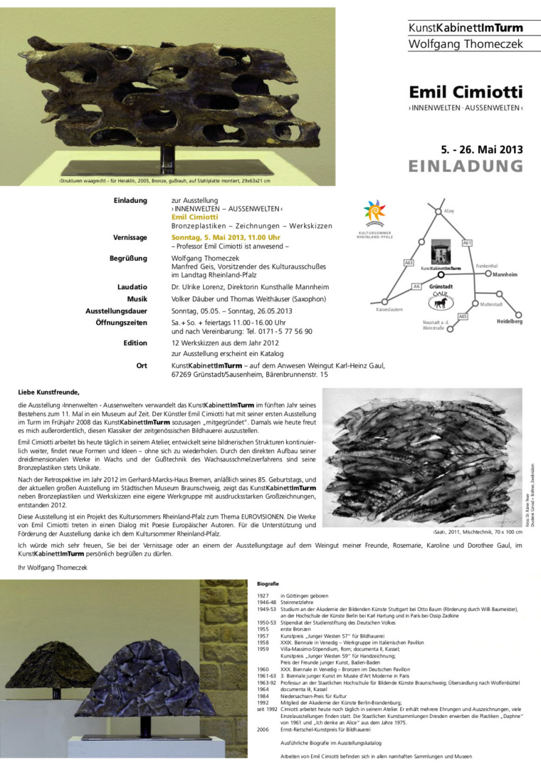 2013 * Galerie Maulberger und Becker, “Dahmen / Cimiotti”, Düsseldorf, 01.02.-02.03.2013. - FLYER - * Städt. Museum Braunschweig, “Emil Cimiotti: 5 Jahrzehnte”, Braunschweig, 10.04.-09.06.2013. - PLAKAT - - COVER - - FLYER 1 - - FLYER 2 - * Kunstkabinett im Turm, “Emil Cimiotti - Innenwelten - Aussenwelten, Grünstadt/Sausenheim, 05.05.-26.05.2013. - PLAKAT - - FLYER - * Galerie Maulberger, “Cimiotti und Zeitgenossen”, München, 19.07.-17.08.2013. - k.P. - - COVER - - FLYER - - LINK - - FOTO - * Villa Wessel, “Emil Cimiotti: Neue Arbeiten”, Iserlohn, 14.09.-03.11.2013. - PLAKAT - - COVER - - LINK - - FOTO - * Villa Schöningen Potsdam, “Sammlung Ströher: Kunst der 1950er und 1960er Jahre - aus der Zeit”, Potsdam, 02.02.-21.04.2013. * Ernst Barlach Haus, “gebaute Bilder, Sammlung Hupertz”, Hamburg, 10.02.-26.05.2013. - PLAKAT - * Emil Cimiotti, “One-Artist-Show Art Karlsruhe”, Südwestgalerie Niederalfingen, 07.03.-10.03.2013. - PLAKAT - * Städtische Kunsthalle Mannheim, “Nur Skulptur”, Mannheim, 15.03.-24.11.2013. - COVER - * Galerie Schlichtenmaier, “10 Jahre Schloßplatz. Gestern, Heute und Morgen”, Schloss Dätzingen / Grafenau, 11.07.-14.09.2013. - k.P. - - COVER - * Ostsächsische Kunsthalle, “Rietschelpreisträger 1991-2013”, Pulsnitz, 09.03.-30.06.2013. - FLYER -.