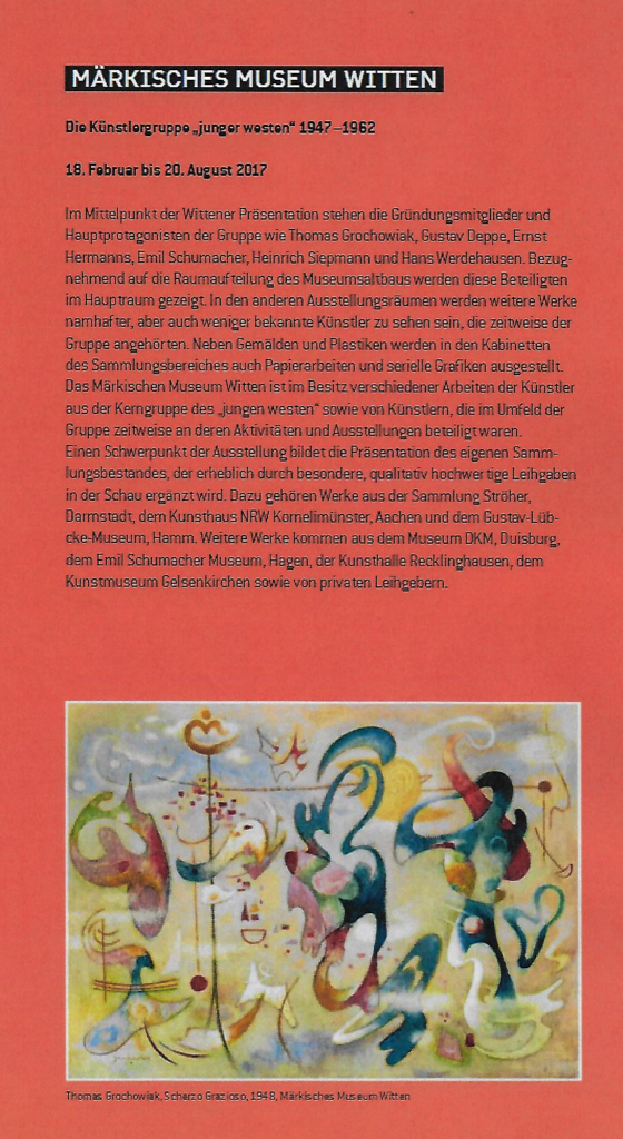 1957 * Galerie im Hause Behr, Behrgalerie, Stuttgart. * Galerie Inge Ahlers, “Cimiotti - Trökes”, Mannheim, 08.03.-31.03.1957. - FLYER 1 - - FLYER 2 - * Galerie 17, “Gruppe SW Stuttgart” (u.a. Emil Cimiotti, Ida Kerkovius, Fritz Seitz, Otto H. Hayek u.a.), München, 21.05.-17.06.1957. * Kunsthalle Baden-Baden, “Junge Künstler sehen die Stadt”,“Kunstpreis der Jugend” Baden-Württemberg, Baden-Baden, 01.06.-01.07.1957. - COVER - * Hochschule für Bildende Künste Berlin, Deutscher Künstlerbund, “7. Jahresausstellung”, Berlin, 07.07.-22.09.1957. - PLAKAT - - COVER - * Kunstverein Darmstadt, Kunsthalle Steubenplatz, “Abstraktes - Konkretes”, Darmstadt, 25.08.-22.09.1957. - COVER - * Städtische Kunsthalle Recklinghausen, “Junger Westen 57”, Ausgestellte Arbeiten der Wettbewerbsteilnehmer, Recklinghausen, 13.10.-17.11.1957. - COVER -
