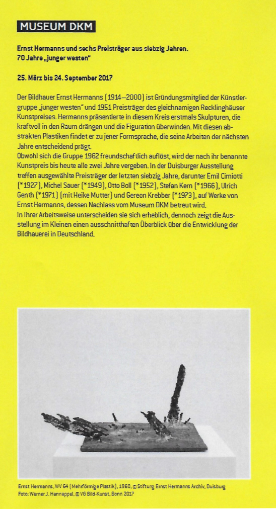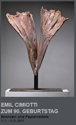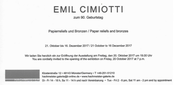 2017 Emil Cimiotti 90. Geburtstag (19.08.1927-13.10.2019) * Galerie Ohse, “Emil Cimiotti: Zum 90. Geburtstag - Bronzen und Papierreliefs”, Bremen, 30.06.-05.08.2017. - PLAKAT - - FLYER - * Kunstverein / Künstlerhaus Göttingen, “Cimiotti: Skulpturen und Papierreliefs”, Göttingen, 06.08.-03.09.2017. - PLAKAT - - FLYER - - FOTO 1 - - FOTO 2 - * Sprengel Museum Hannover, “Emil Cimiotti - Zum 90. Geburtstag”, Hannover, 18.08.-19.11.2017. - k.P. - - COVER - - FLYER - * GKM Georg Kolbe Museum, “Cimiotti: Retrospektive zum 90. Geburtstag”, Berlin, 19.11.2017-28.01.2018. - PLAKAT - - COVER - - FLYER A - - FLYER B - - FLYER C - - FOTO - * Hachmeister Galerie Münster, “Emil Cimiotti - Zum 90. Geburtstag”, Münster, 21.10.-16.12.2017. - k.P. - - Flyer A - - FLYER B - - FOTO - * Galerie Michael Haas, “Emil Cimiotti - Papierreliefs und Bronzen”, Berlin. 18.11.-22.12.2017. - k.P. - - COVER - - FLYER - - FOTO - * Emil Cimiotti auf der “Art Karlsruhe” bei Galerie Cyprian Brenner und bei Galerie 20/21 München, 16.02.-19.02.2017. - PLAKAT - * Märkisches Museum Witten, “Die Künstlergruppe >Junger Westen 1947-1962<”, Witten, 18.02.-20.08.2017. - FLYER - - TEXT - * Museum DKM Duisburg, “Ernst Hermanns und sechs Preisträger aus siebzig Jahren. 70 Jahre >junger westen<”, Duisburg, 25.03.-24.09.2017. - PLAKAT - - TEXT - - FOTO - * Städtische Galerie Karlsruhe, “Skulpturen aus der Sammlung”, Karlsruhe, 01.04.-18.06.2017. - FLYER - * Emil Cimiotti auf der “ART Cologne 2017” bei Galerie Maulberger, 26.04.-29.04.2017. - PLAKAT - - FOTO - * Kunsthalle Recklinghausen, “Auf dem Weg zur Avantgarde - Die Künstlergruppe >junger westen<”, Recklinghausen. 07.05.-13.08.2017. - PLAKAT - - COVER - - FLYER - - FOTO - * Museum für aktuelle Kunst / Sammlung Hurrle, “Auf unbekanntem Terrain. Landschaft in der Kunst nach 1945”, Durbach, 16.09.2017-04.02.2018. - FLYER - * Galerie Cyprian Brenner GCB / Südwestgalerie, “Best of Galerie I und II”, Schwäbisch Hall und Hüttlingen-Niederalfingen, 14.10.2017 sowie 12.11.2017. - k.P. - * Galerie 20/21 München 2017 bei Taylor Wessing, “Gruppenausstellung der Galerie”, u.a. Emil Cimiotti, K.O. Götz, München, 25.10.2017-20.07.2018. - k.P. - * Emil Cimiotti auf der “ART Düsseldorf” bei Galerie Haas Zürich, Düsseldorf. 17.11.-19.11.2017. - PLAKAT - - FOTO - * Emil Cimiotti auf der “COFA Cologne Fine ART” bei Galerie 20/21 München, Köln. 23.11.-26.11.2017. - PLAKAT - - FOTO -